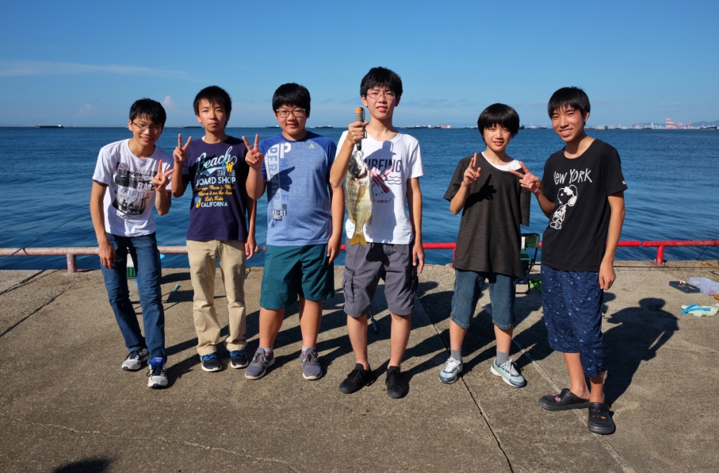 荒牧吹部の文化系男子の皆さんが、一本針の仕掛けにサビキで釣れたアジの頭を餌に使い、チヌ47㎝を見事ゲット!