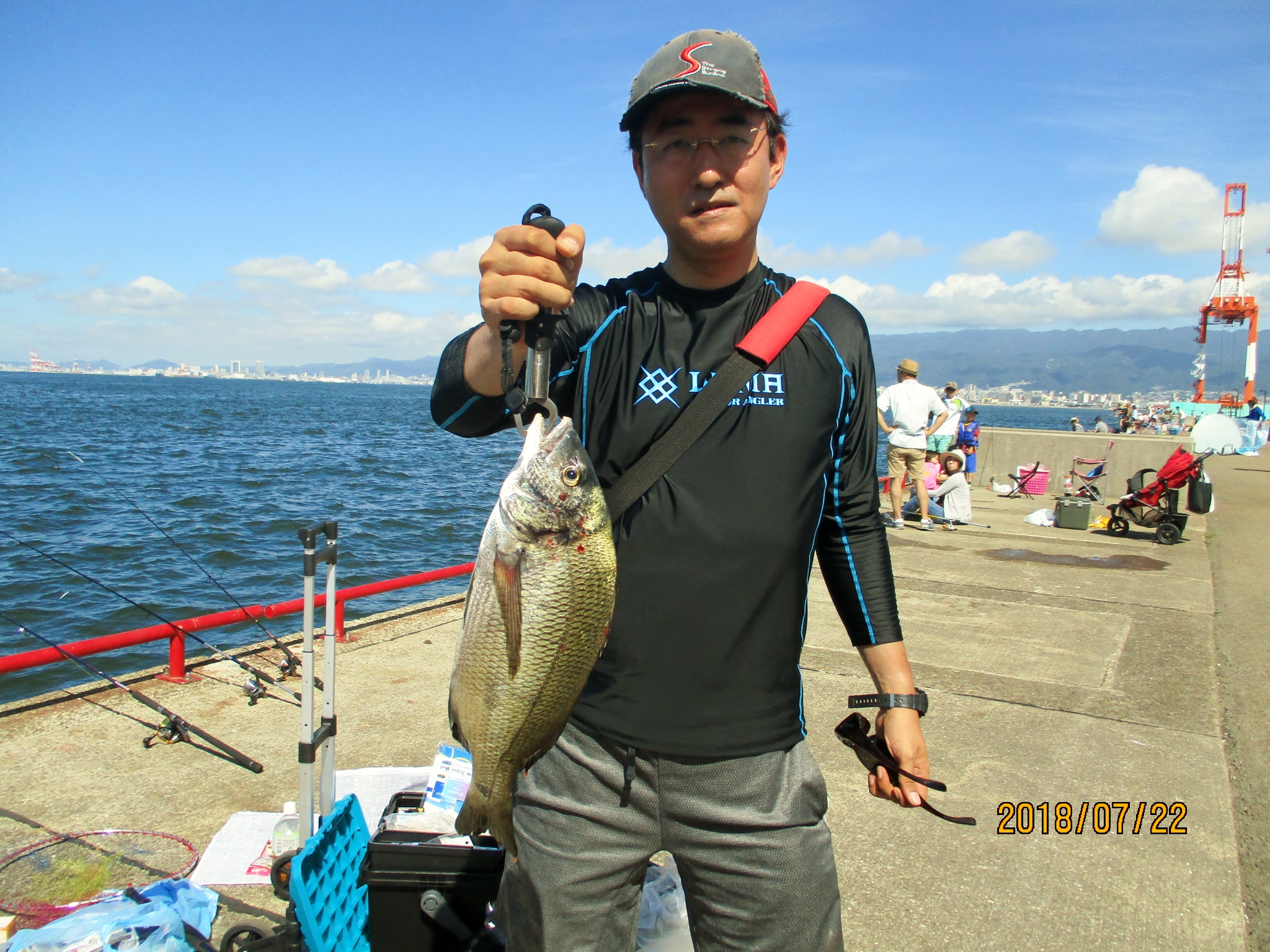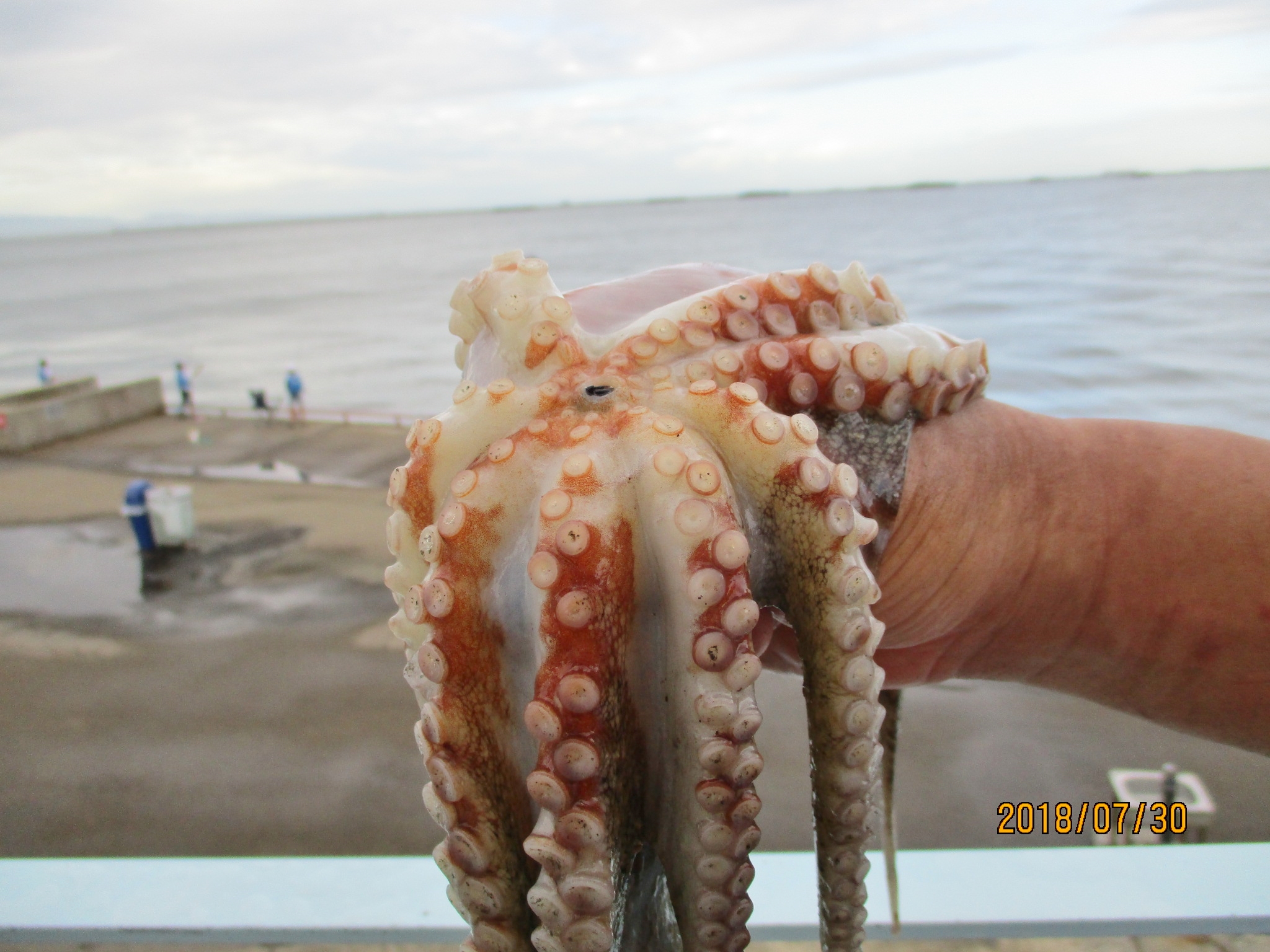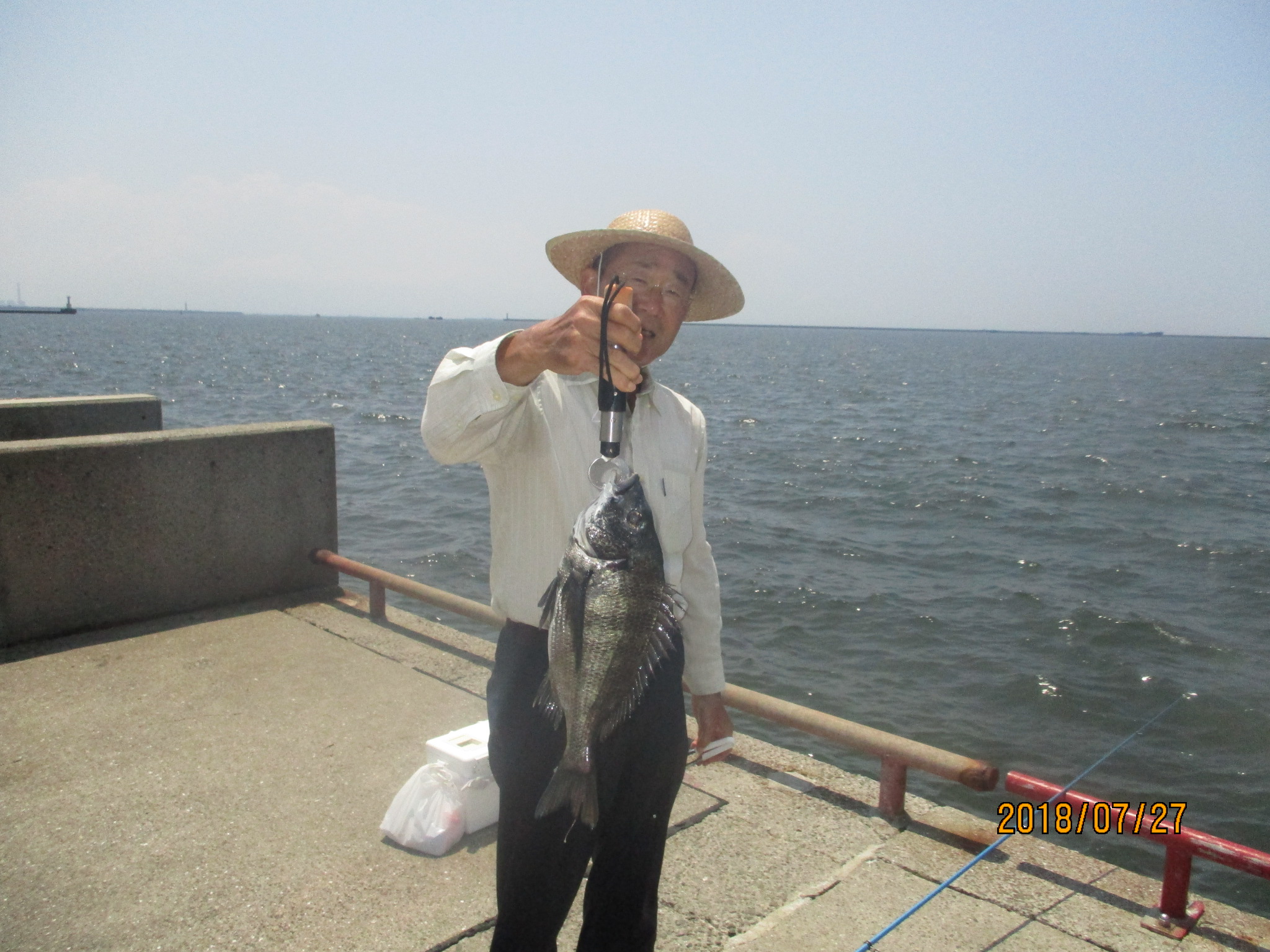 昨日に引き続きサビキ釣りの釣果は、豆アジ・小アジ数匹・小サバ数匹と悪いです。東側で、キビレ33cmとチヌ25cmとエビ撒きで上がりました。今日のタコは、4人の釣り人が挑戦し、計3匹と不漁でした。10時ごろ落とし込みでチヌ42cmが上がり、西宮市の濱田様3日連続の登場です。