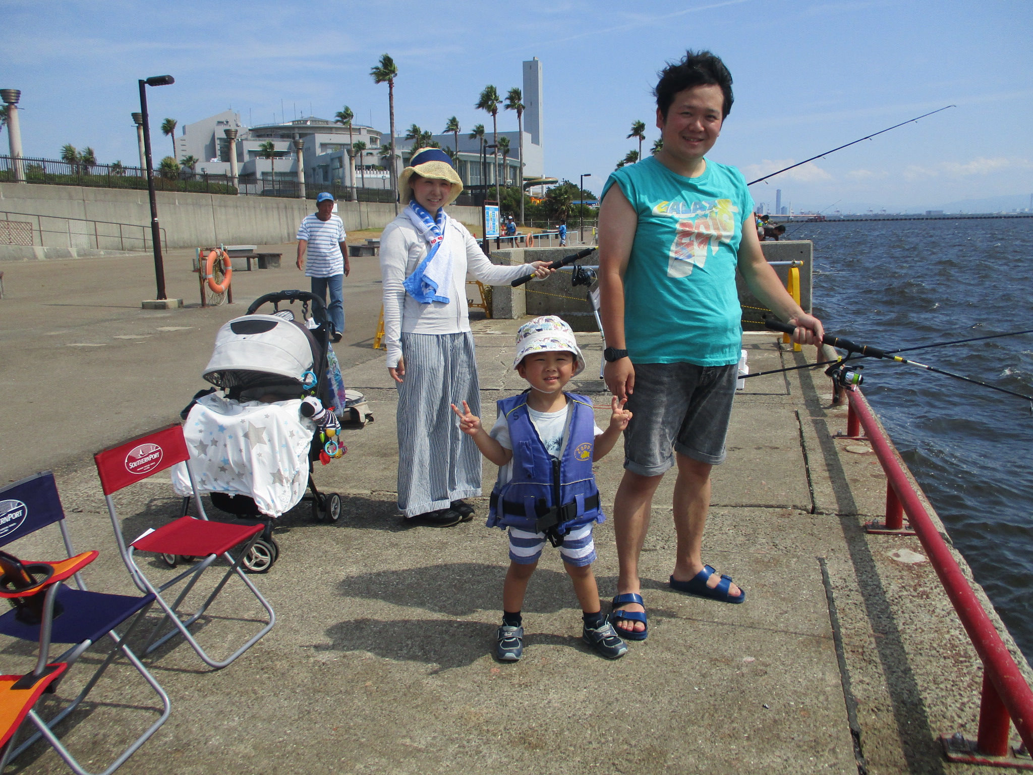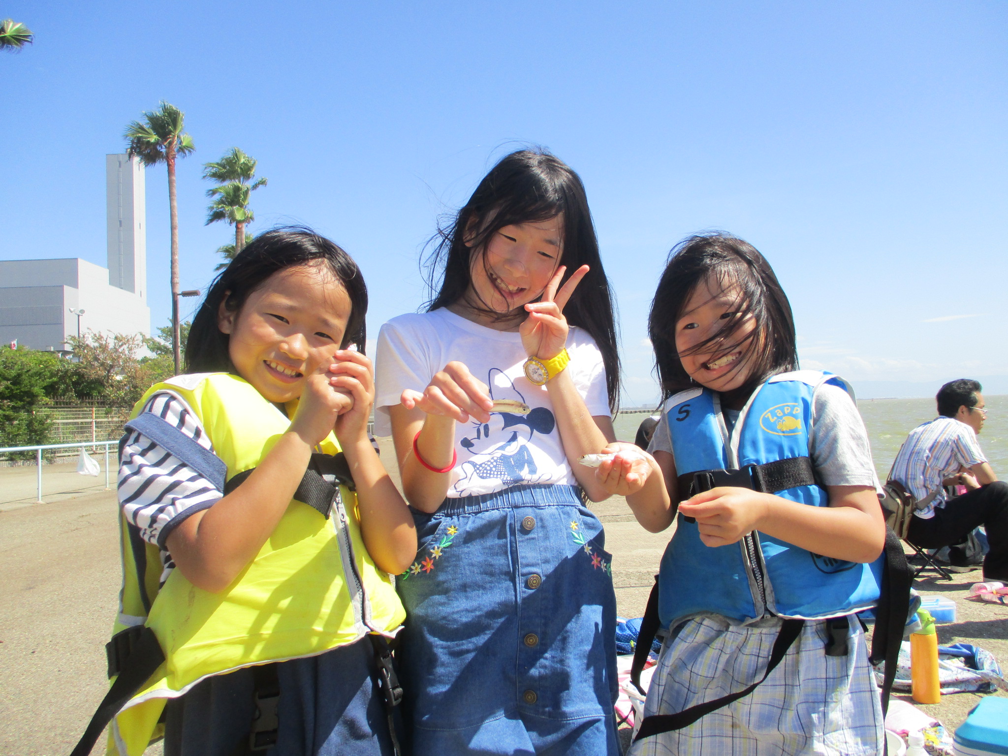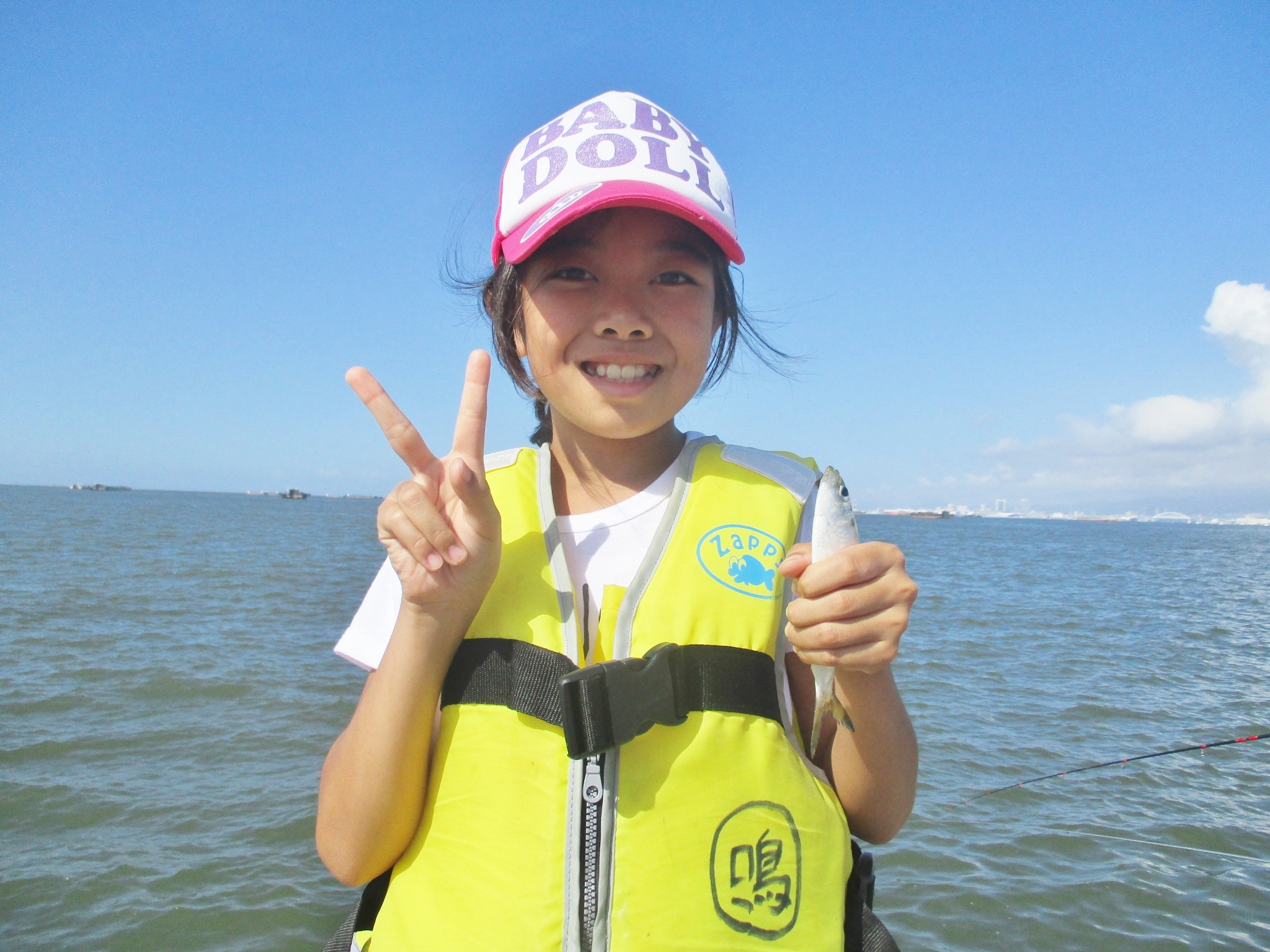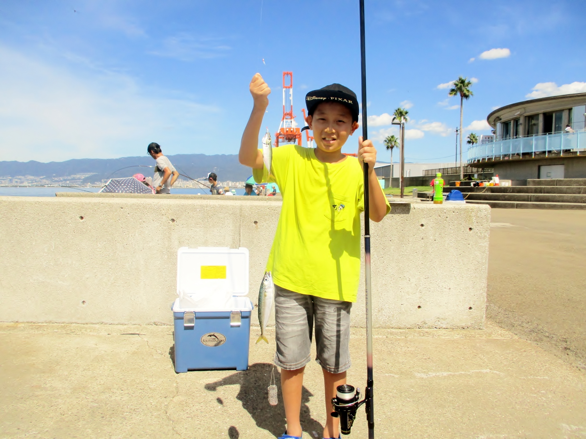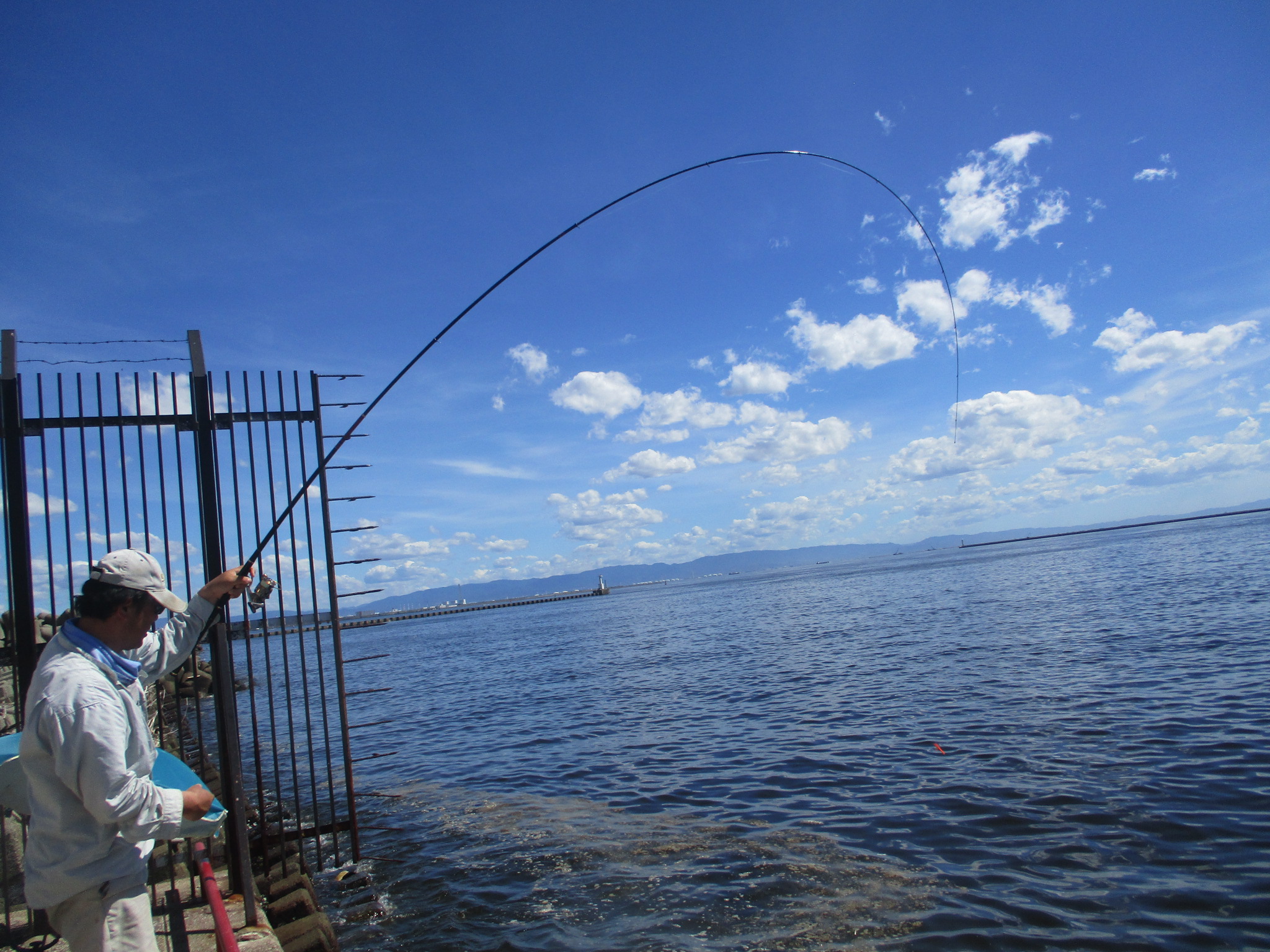 午後3時半現在、南西の風1~2m、快晴、波高0.5m。午後も気温30℃をこえ灼熱状態。午後5時現在、サビキではサッパ、カタクチイワシ、サバ、小アジの4種が混ざってパラパラ釣れてます。
