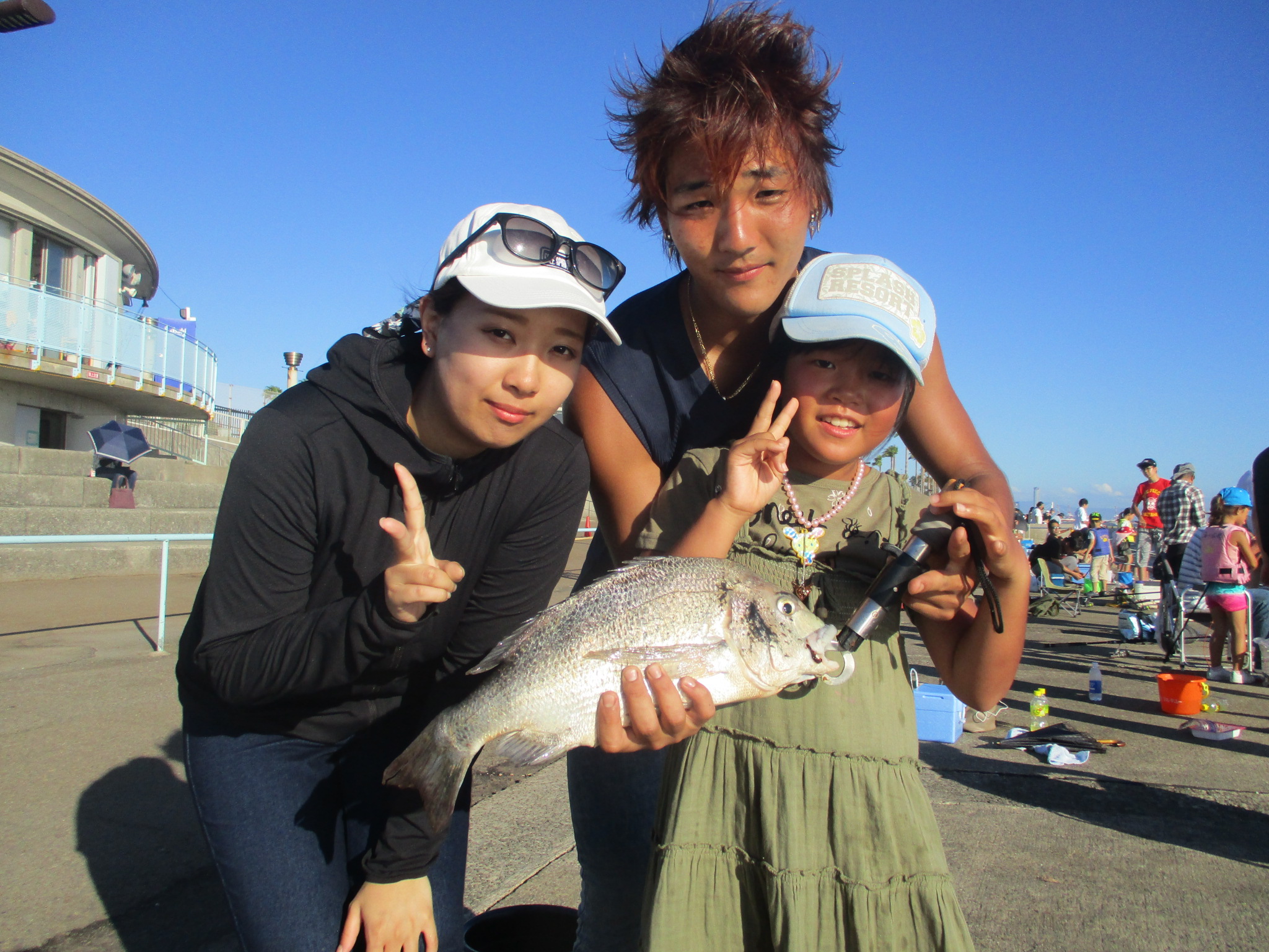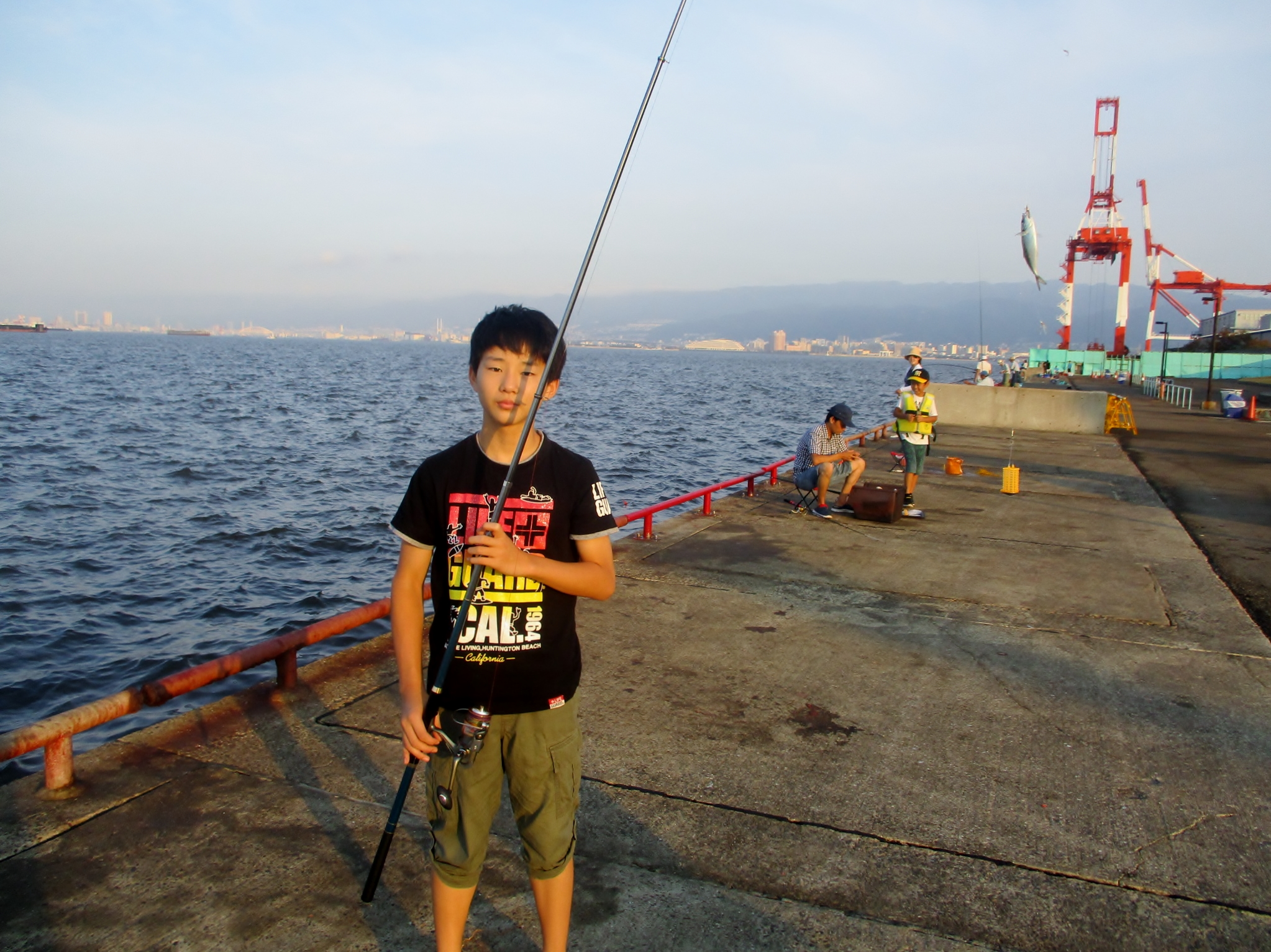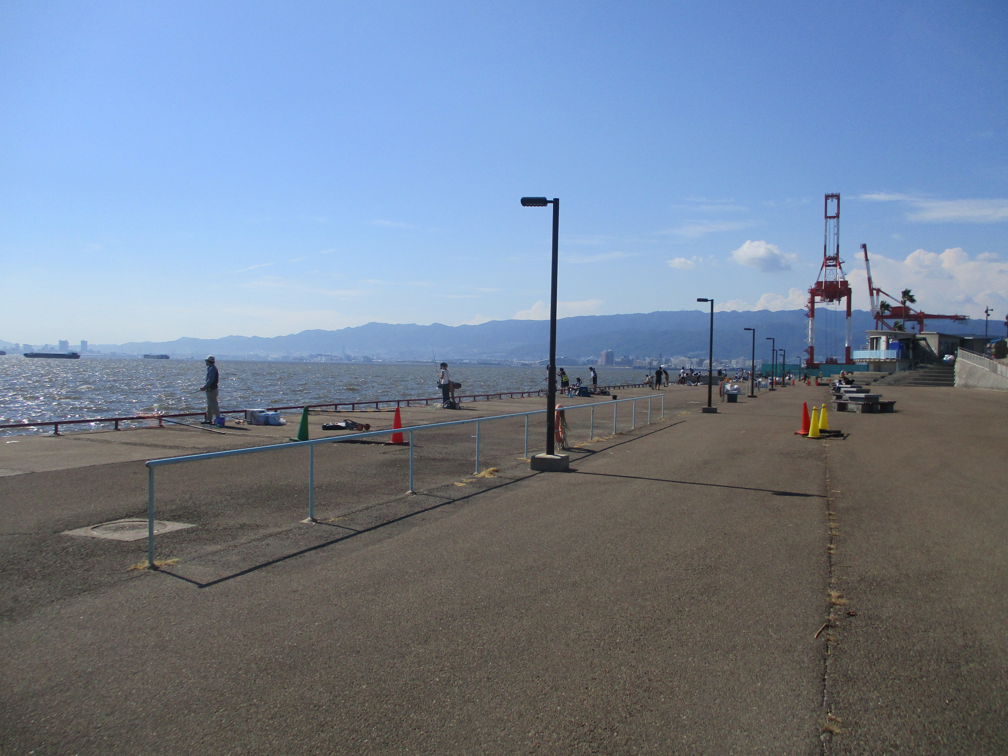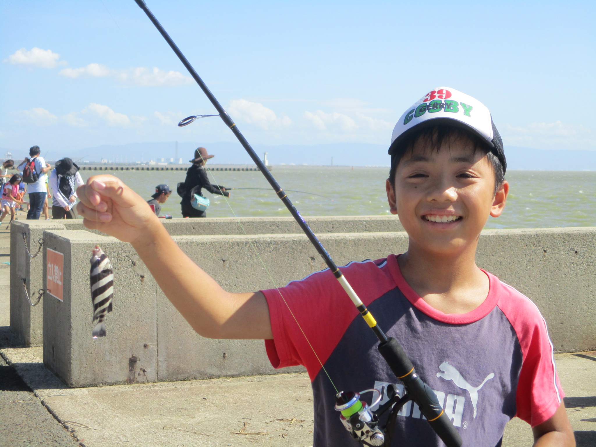 開場後南西の風が吹き、波も立ってきました。始めはカタクチイワシが釣れ、6時前ぐらいから、昨日同様サバがあちこちで上がり出して、釣り場が盛り上がっています。7時前ぐらいにアジが釣れ出しました。サビキ釣りでチヌ45.5cmを釣られたつわものもいらっしゃいます。
