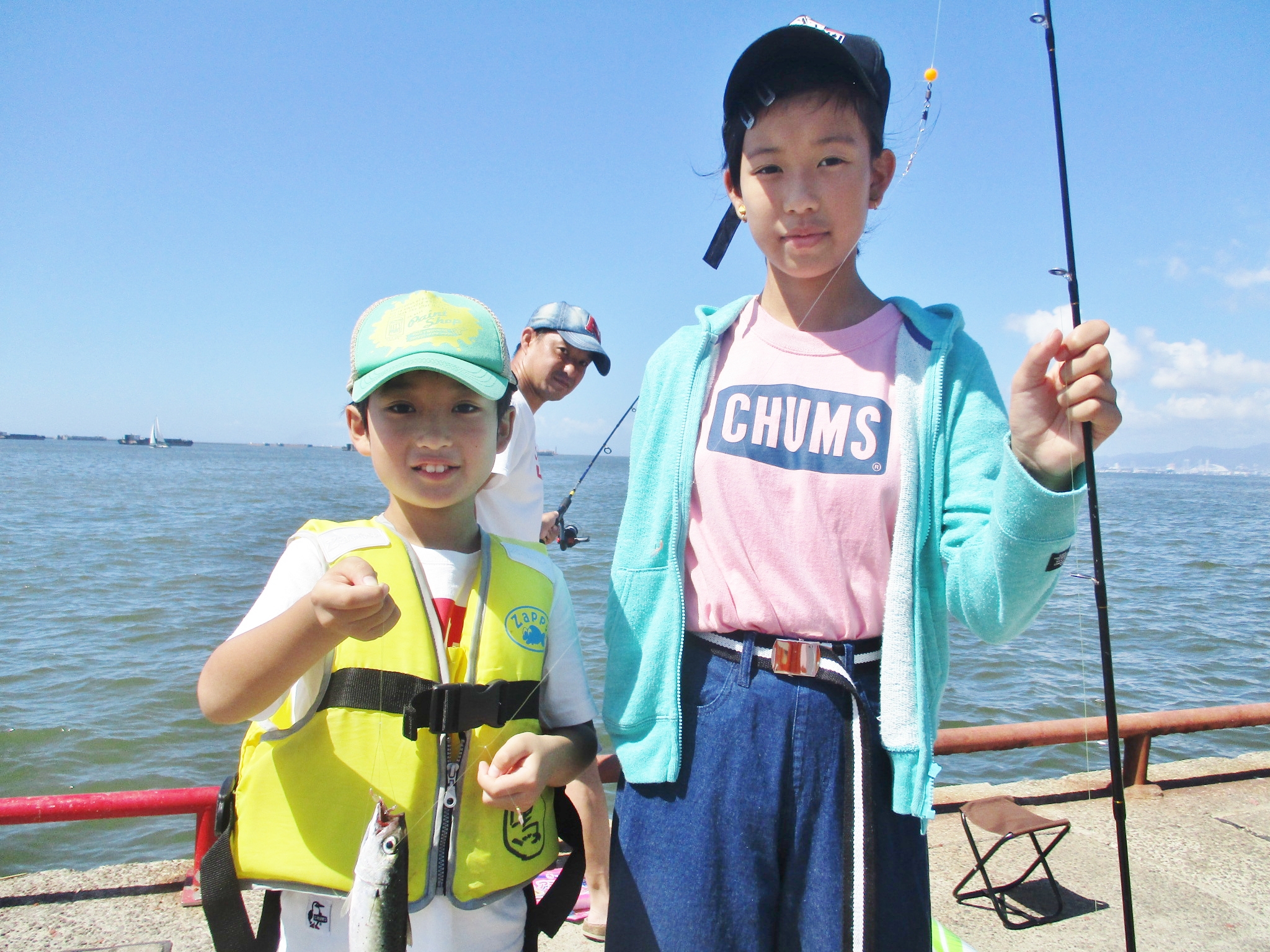 午後3時半現在、西の風2~3mやや風強し、波高0.5~1m、天気晴れ、気温28℃。サビキではサッパ・カタクチ中心で、時折サバ・アジが混ざります。群れが小さいのかポツポツあがる程度。