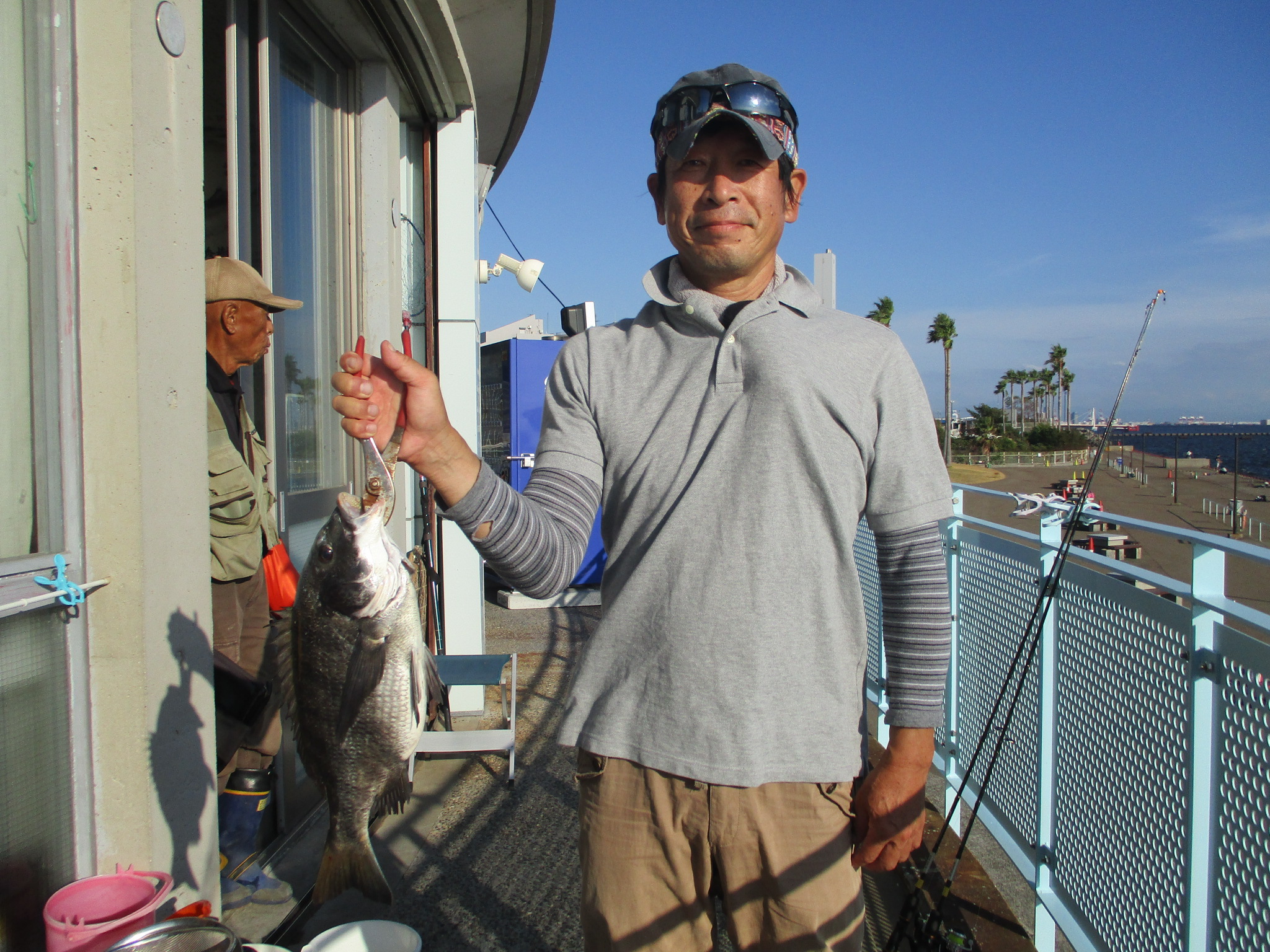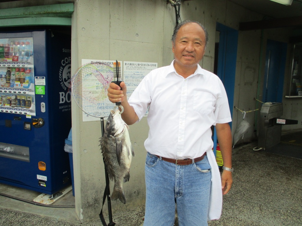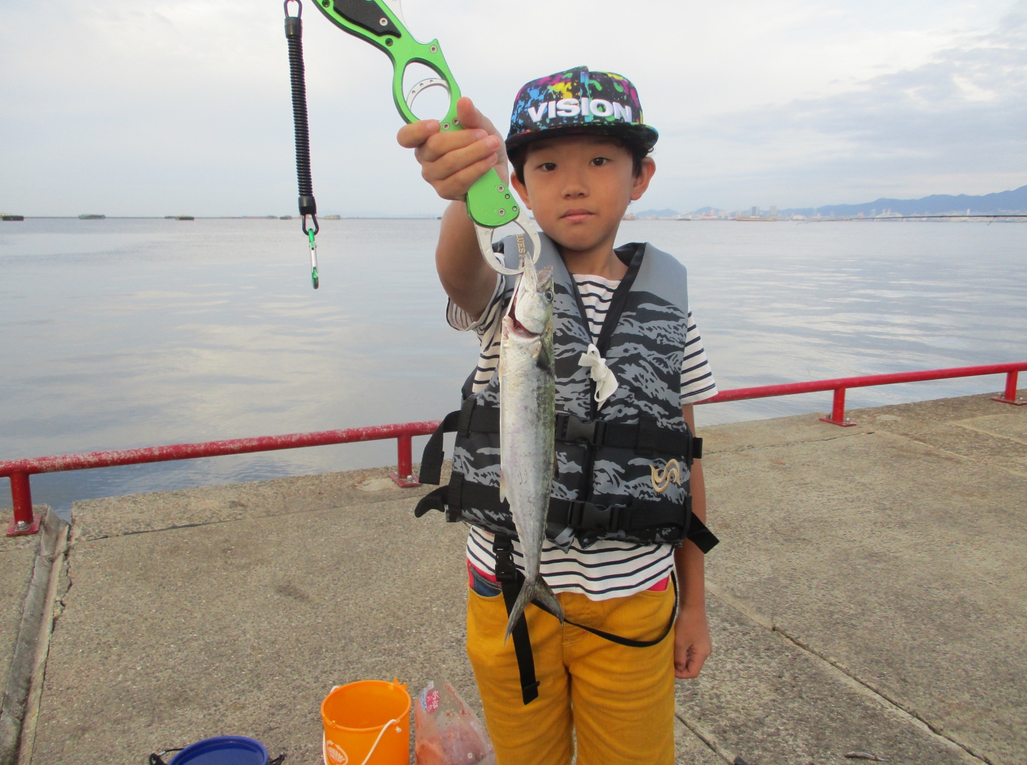 午後3時現在、南西の風2~4m、天気晴れ、気温28℃。台風の影響か風が少しづつ強くなっています。向かい風で投げつらい状況ですが手前でも専用仕掛けでサヨリがあがっています。サビキではサッパ・カタクチなどがぽつぽつです。3時半ごろからアジも混じり始めました。午後4時半、西で西宮市濱田様ズボ釣りでチヌ46.5㎝。