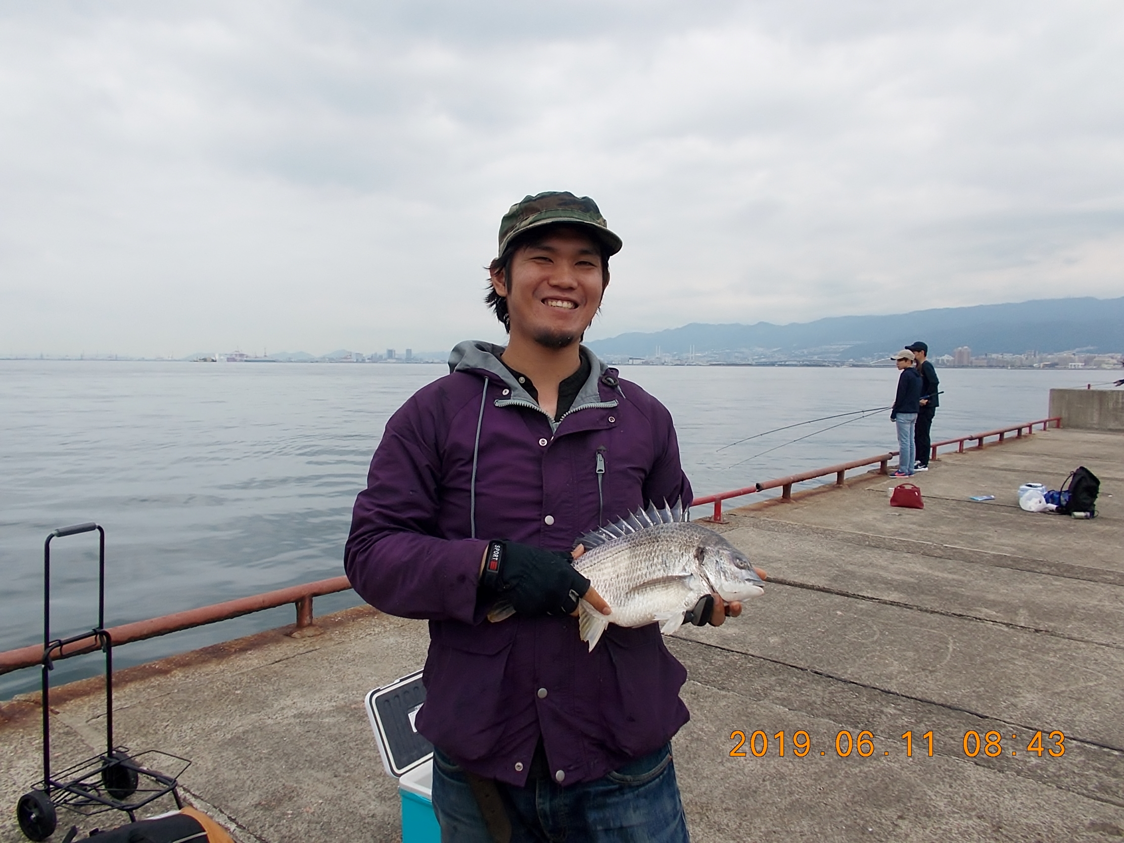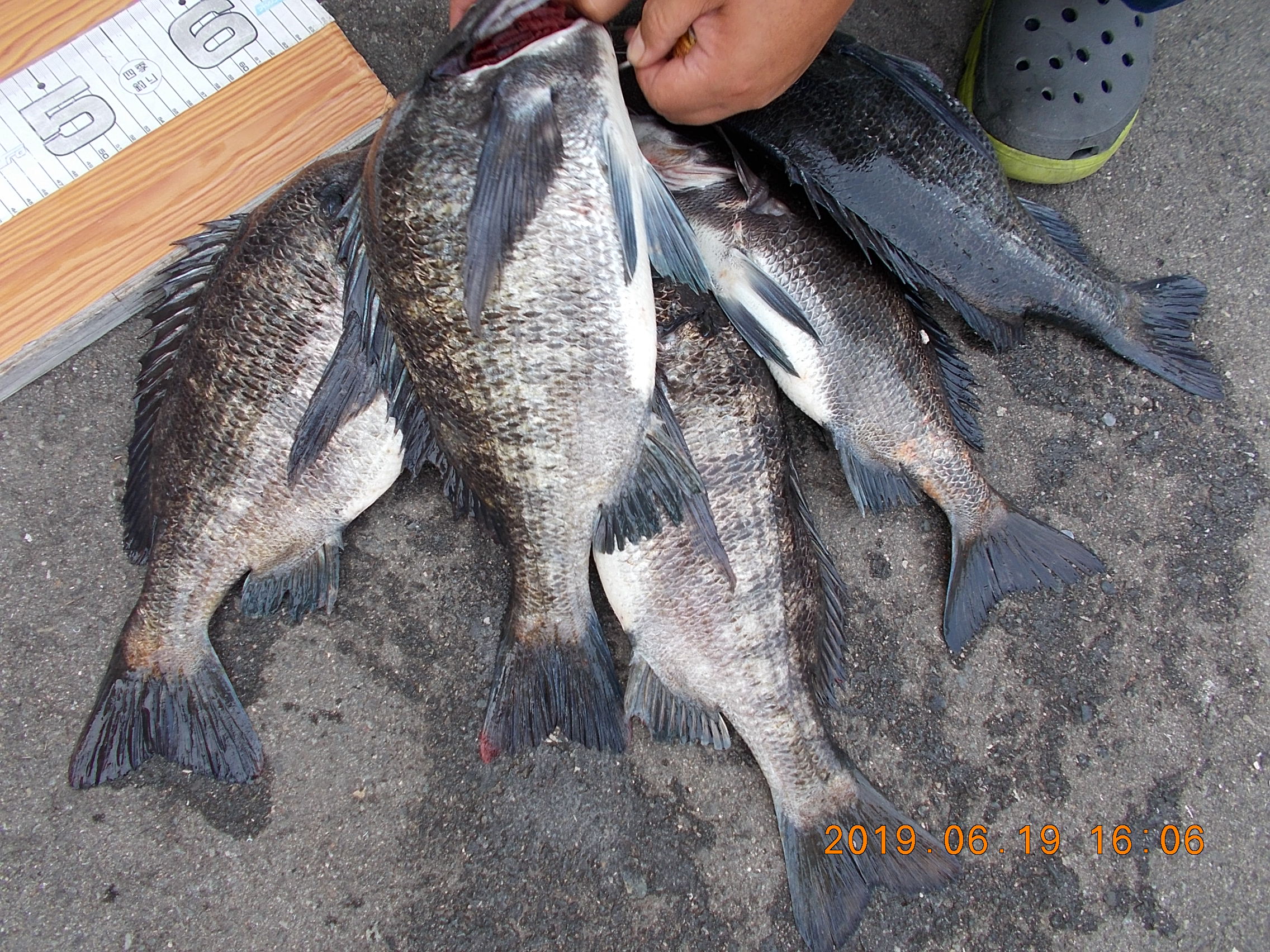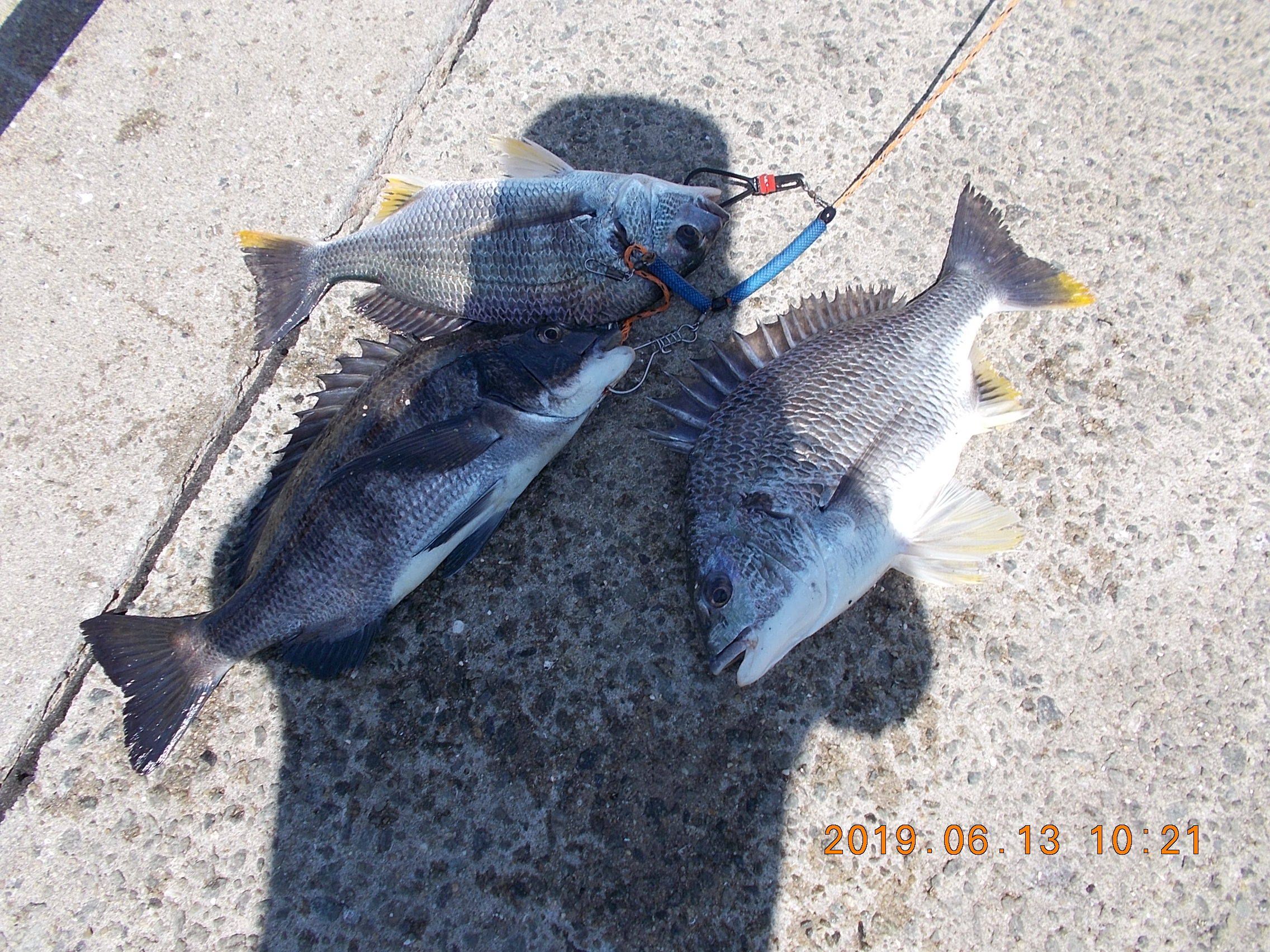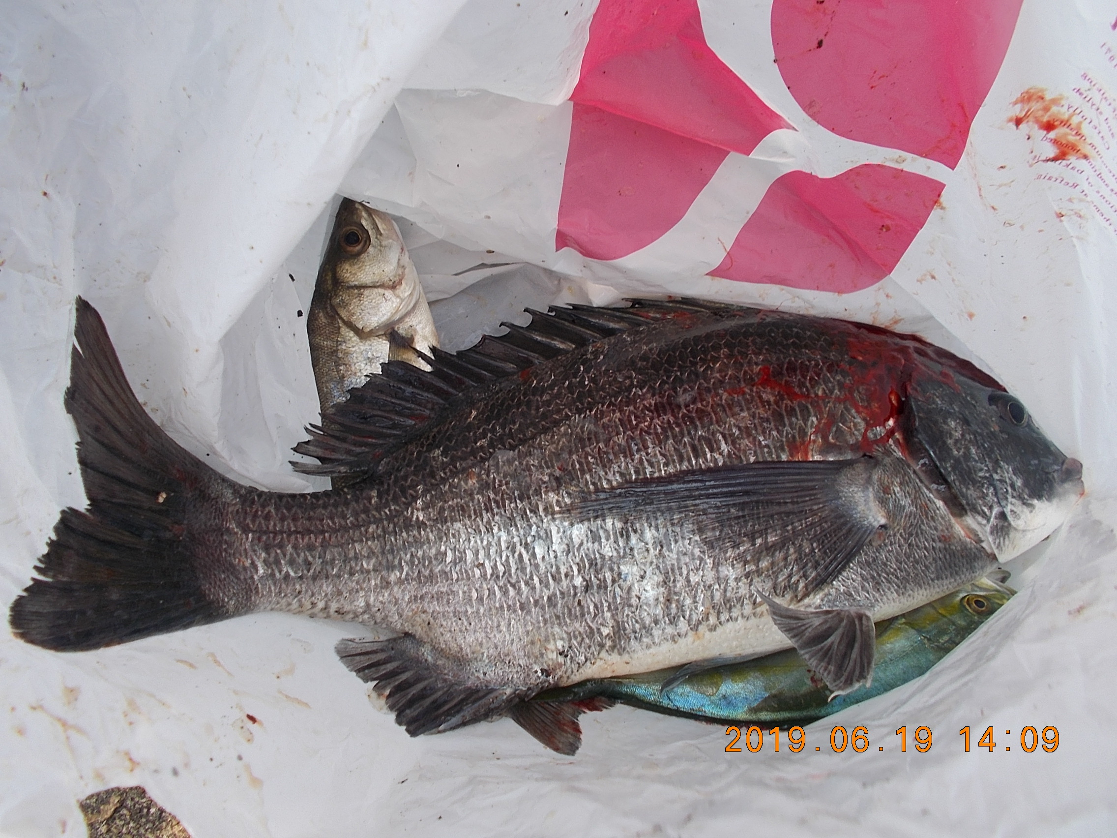 午後2時半現在、南西の風2~3m晴れ、海面おだやか。半分以上はサビキの方。大きいウキで4~5mサビキを飛ばしている方もちらほらでサッパもしくは豆アジがぽつぽつ。西端の釣り人は午後だけでチヌ8枚あげられました(写真)餌オキアミ。5時半を過ぎ豆アジが多くなってきました。