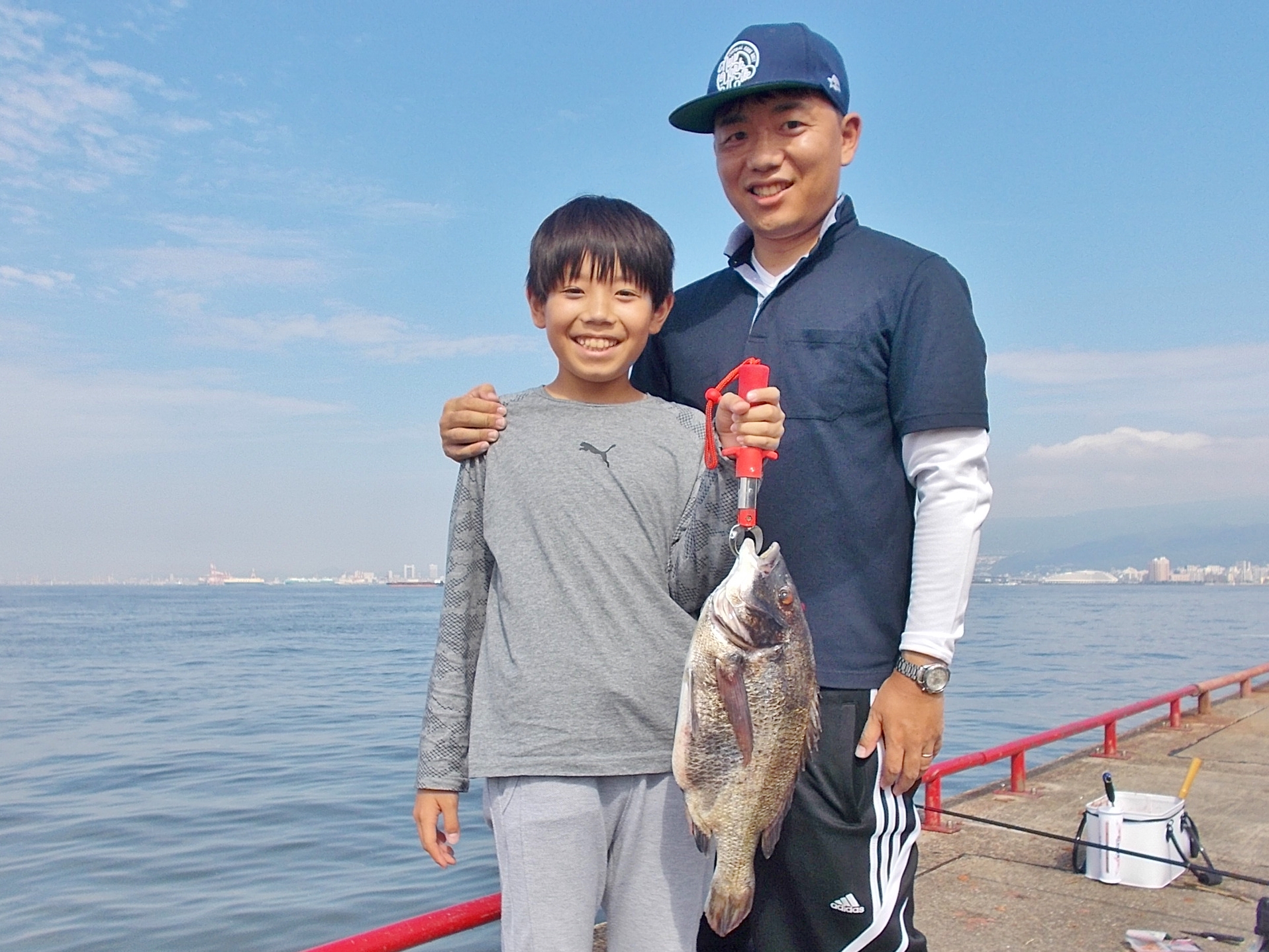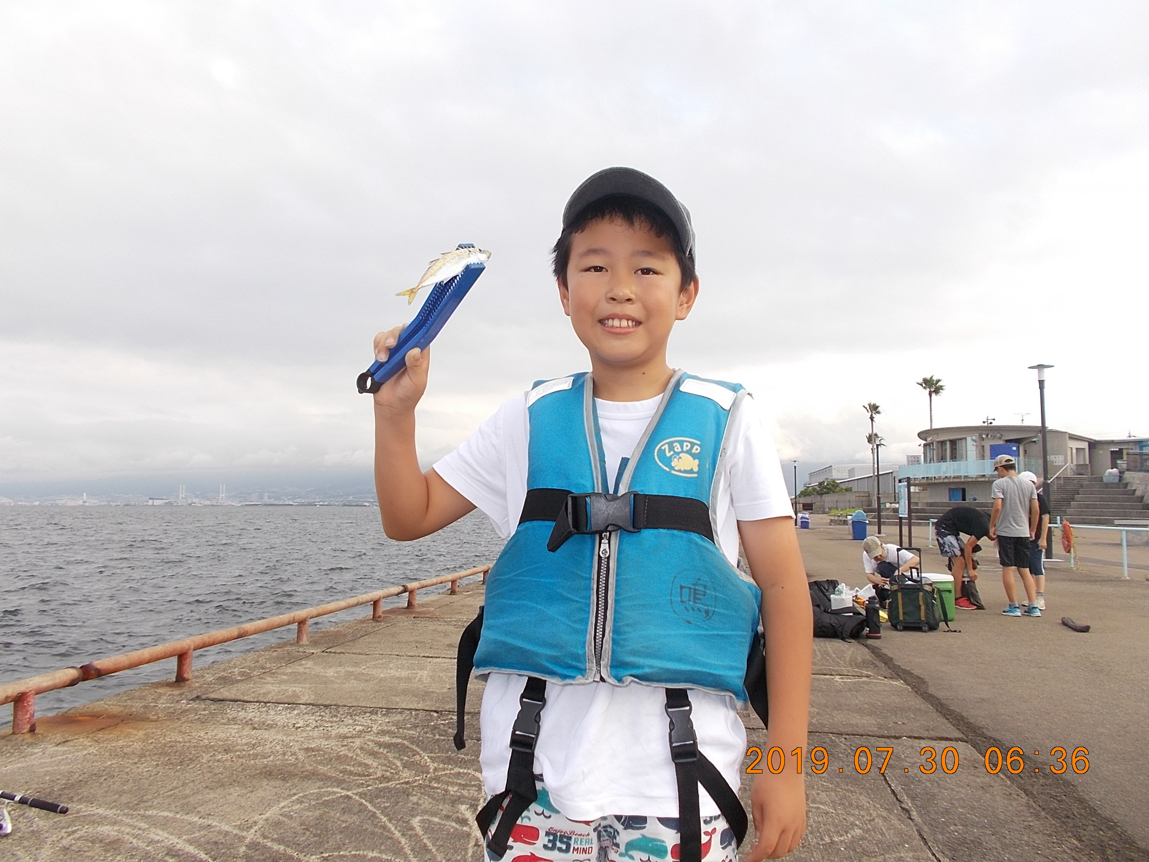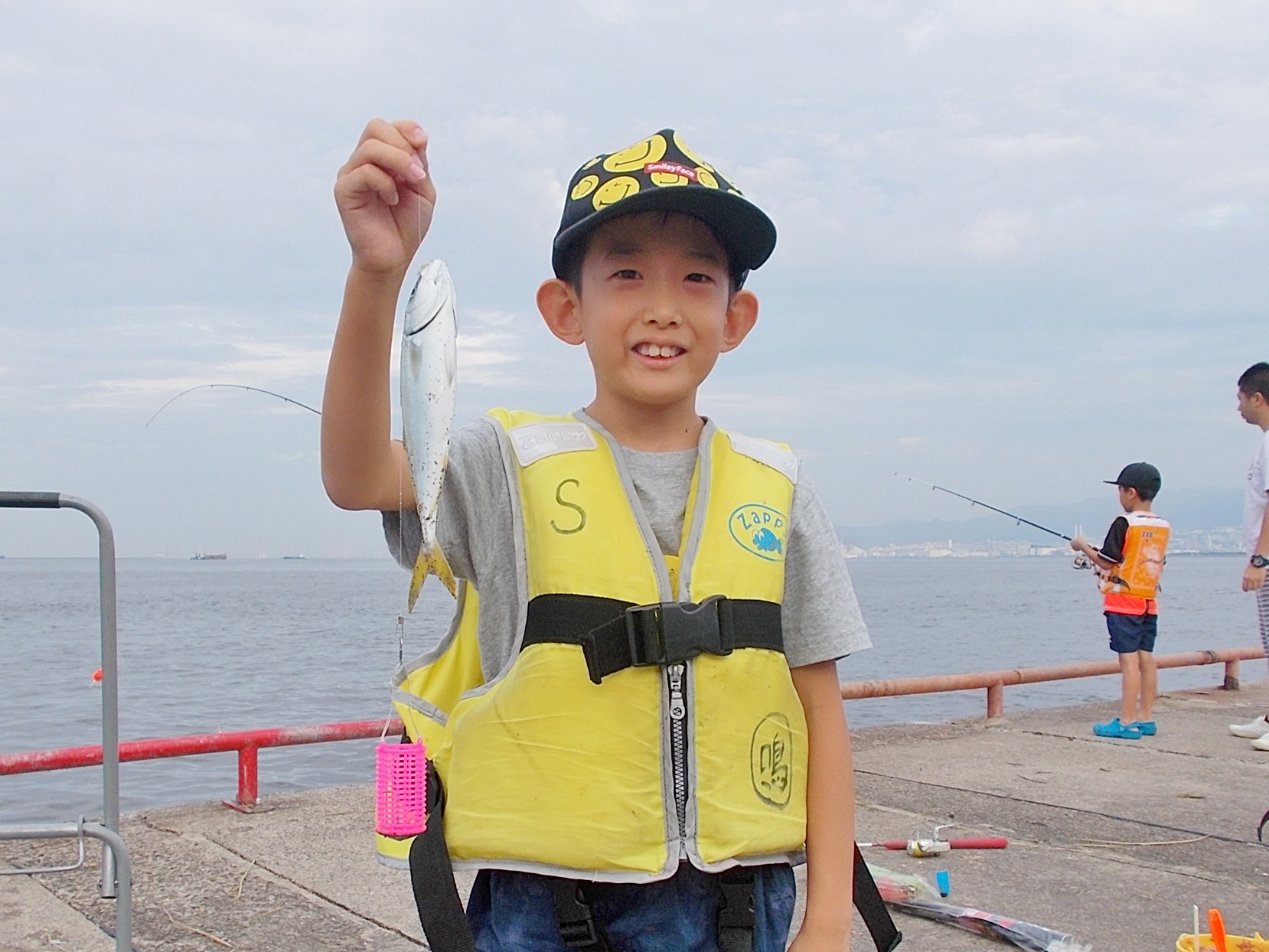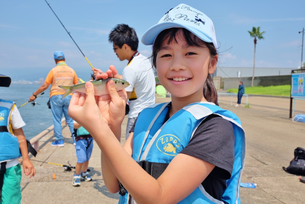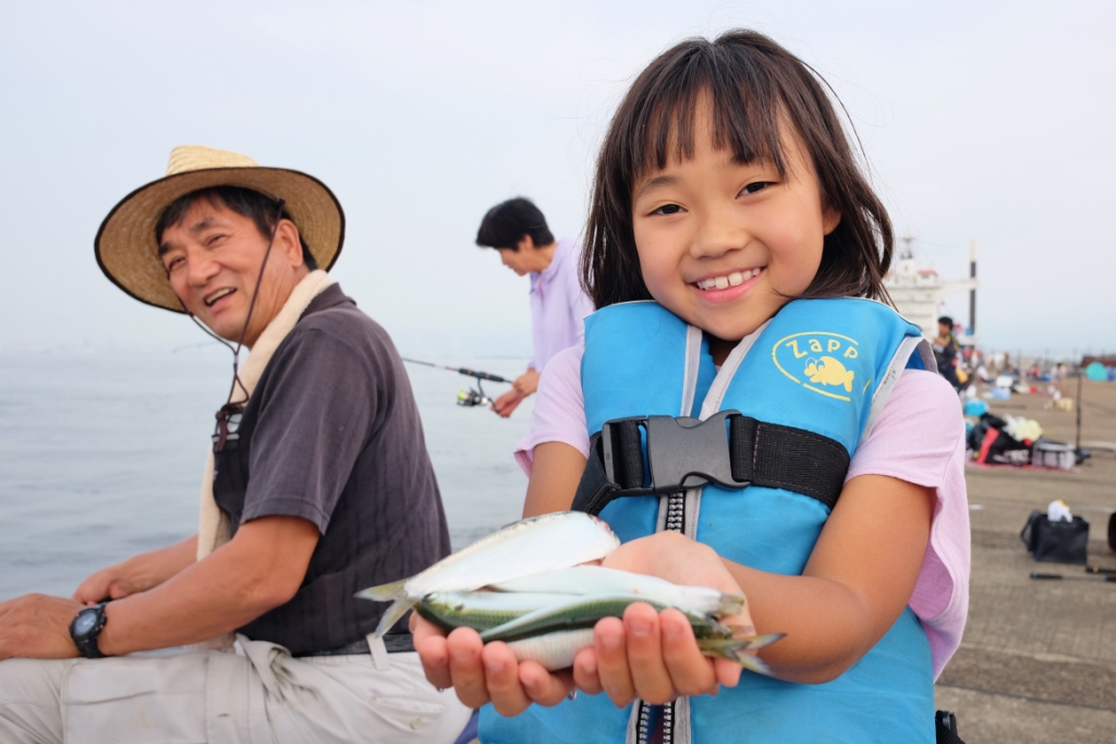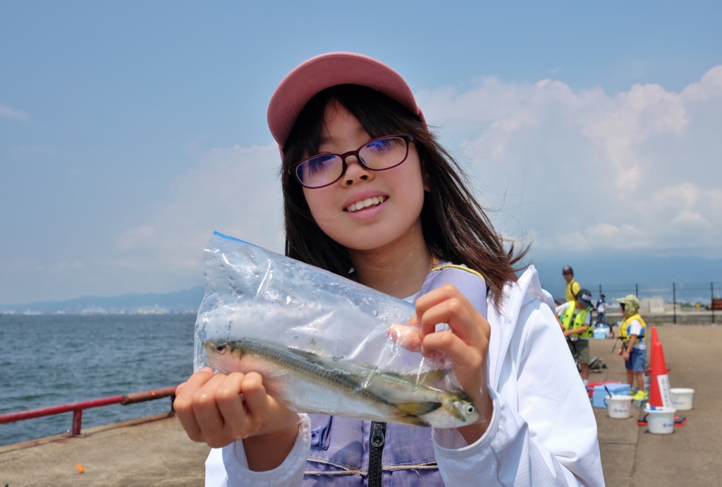 肝心のサビキ釣りの釣果はサッパがポツリポツリと釣れ、他にはツバスやサバ、小さな豆アジが釣れる釣果状況で、なんと47㎝のチヌをサビキで釣られたお子さんもいらっしゃいました。皆さん魚が釣れる度大きな歓声が上がっていましたょー。
