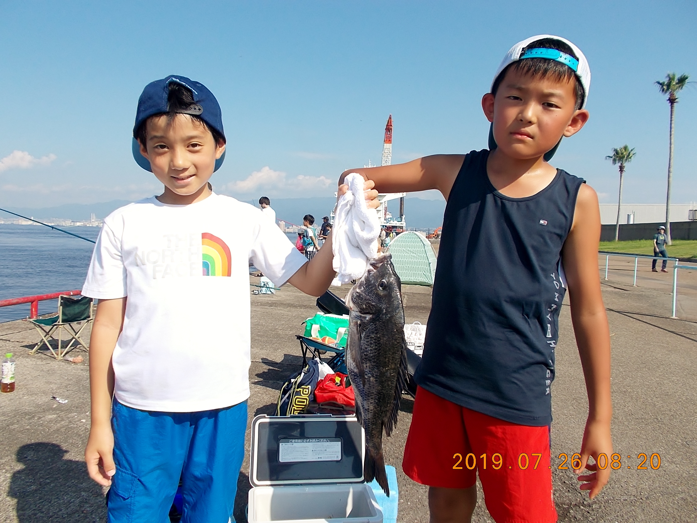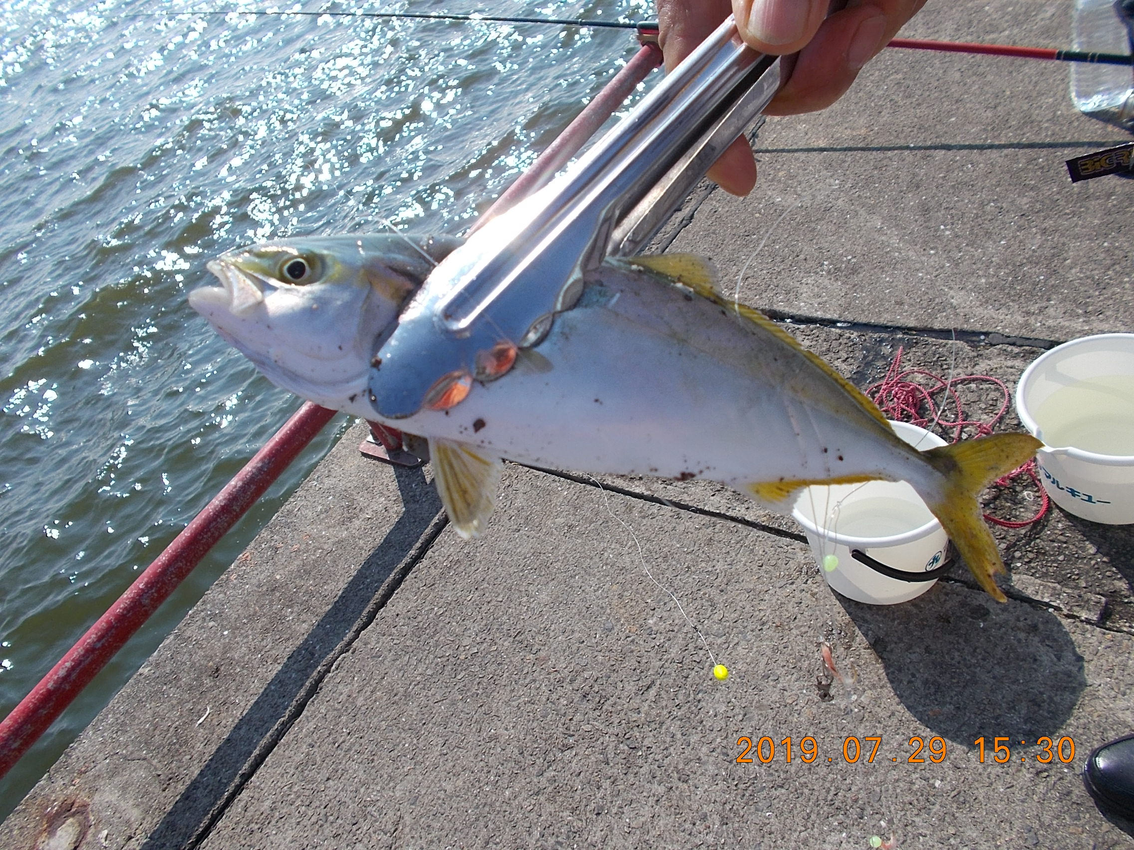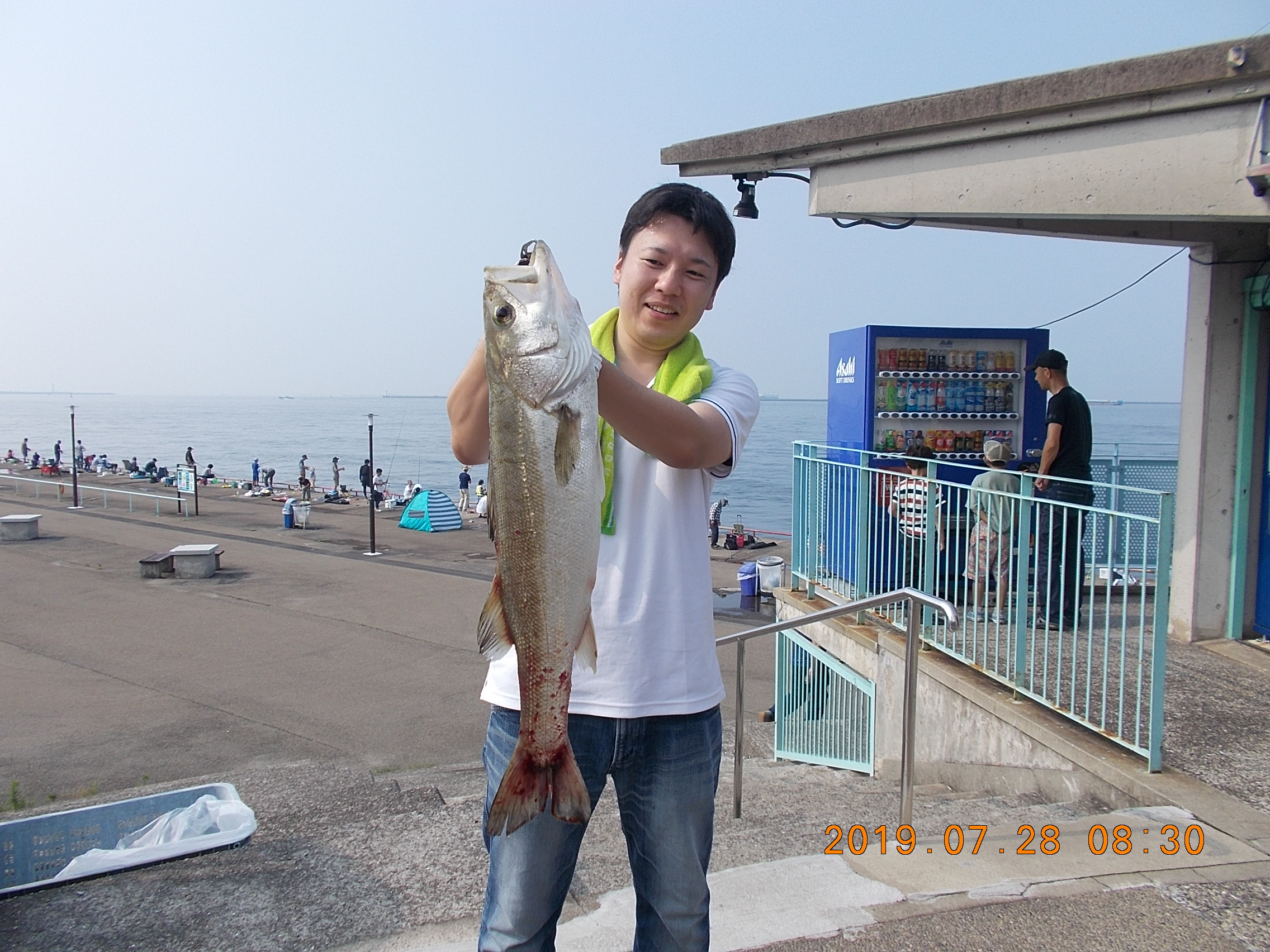 午後3時半現在、南西の風0.5~1.0m、天気快晴、気温34.0、波0.5m。向かい風のためゴミや泡が岸壁に寄せています。午前中の釣り教室が終了し今現在40数人の方々が竿を出されています。サビキはサッパがポツリぽつり。時には強い引きがあってツバスがあがることもあり。