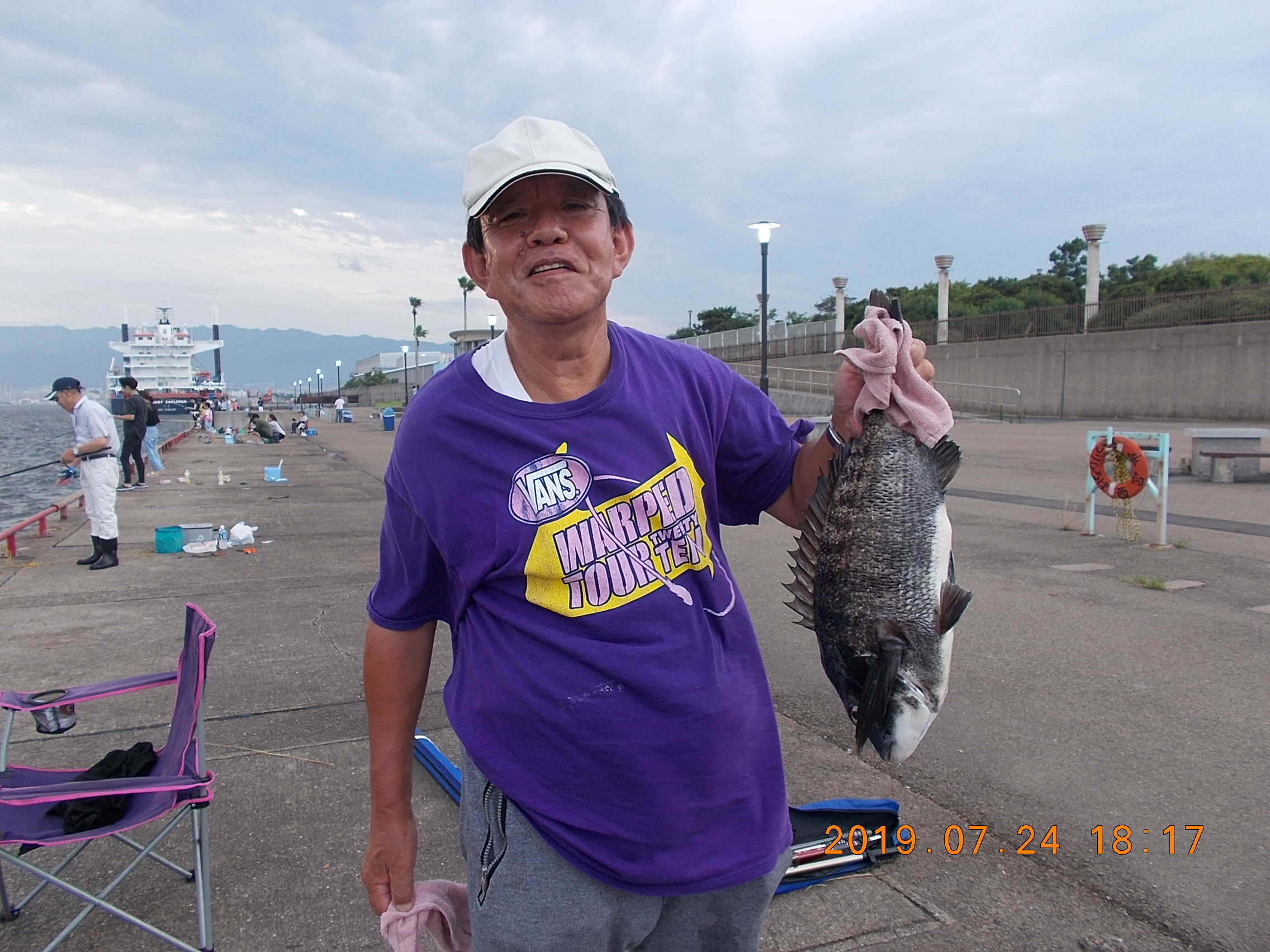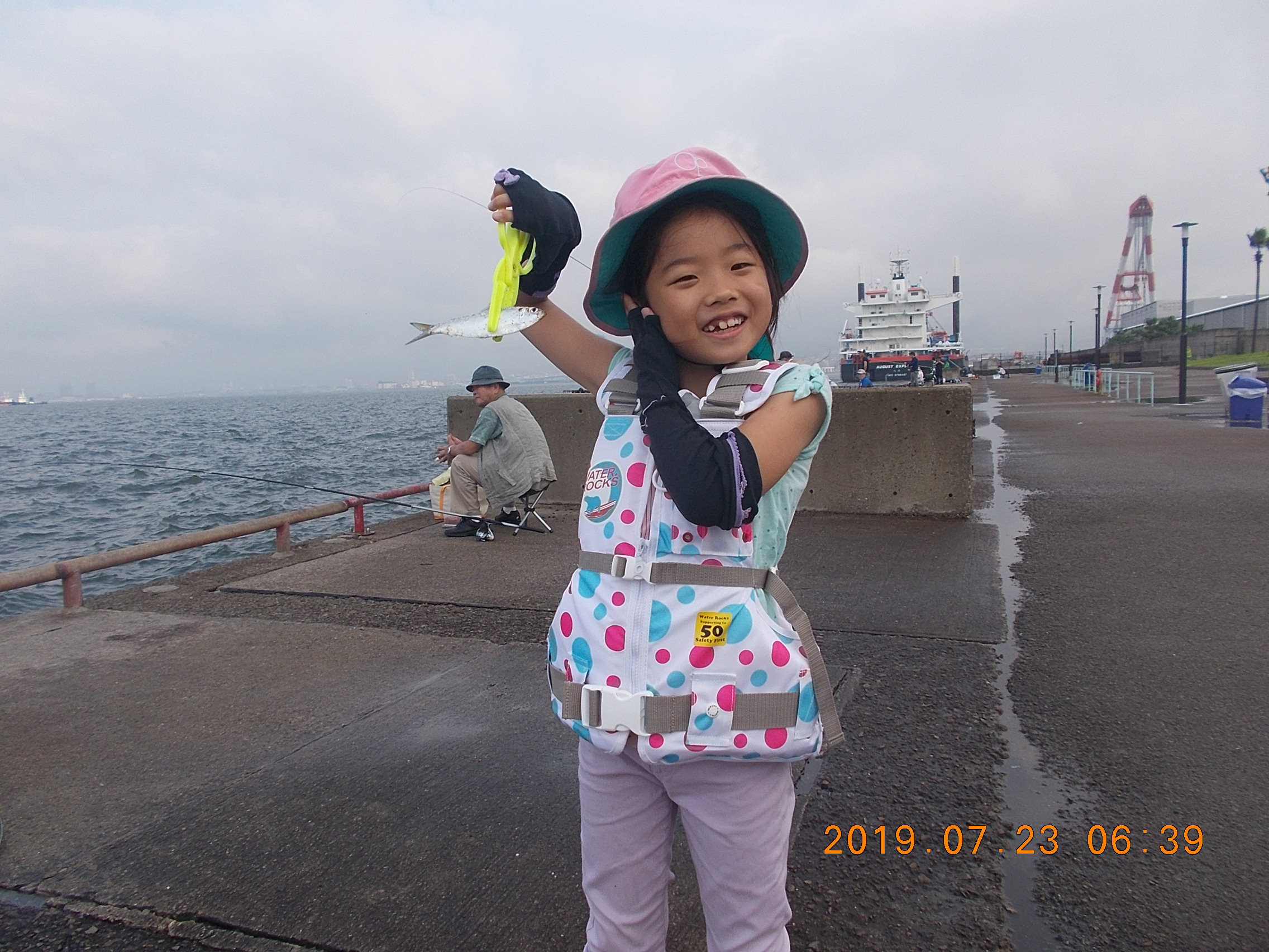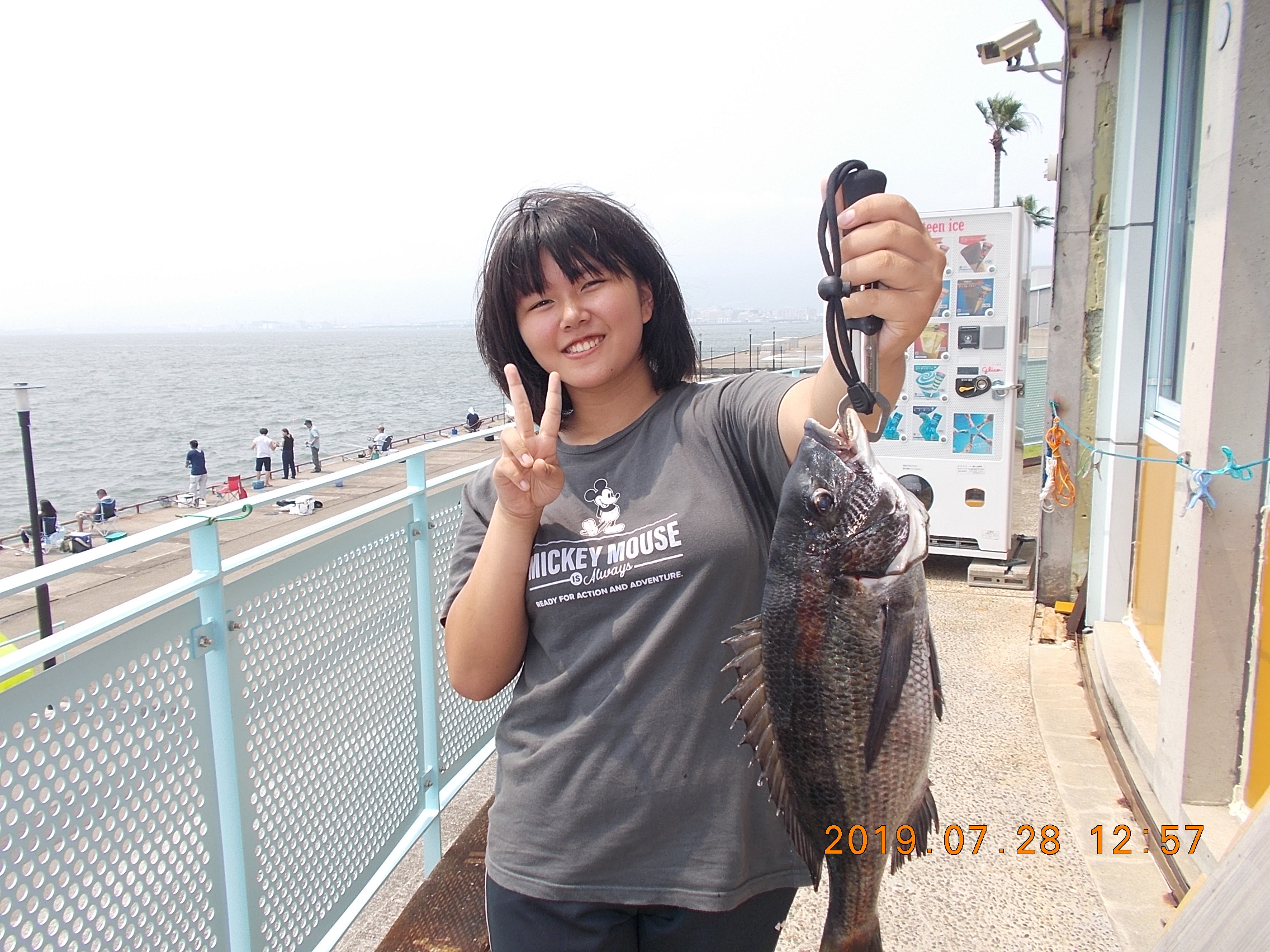 午後3時半現在、南西の風0.5~1.0m、天気快晴、気温34.0、波0.5m。向かい風のためゴミや泡が岸壁に寄せています。午前中の釣り教室が終了し今現在40数人の方々が竿を出されています。サビキはサッパがポツリぽつり。時には強い引きがあってツバスがあがることもあり。