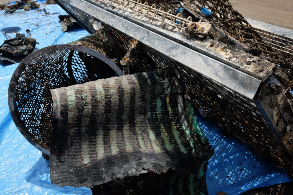 そんな悪環境でしたが、釣り竿、プラカゴ、様々なライン、ルアーやジグ等があり、もっとも目が引いたのは数多く上がったフェンス! このフェンス、数枚は海づり広場とリゾさんを隔てていたモノや、西側のフェンスでした。このフェンスは昨年の台風20号と21号で崩壊し海に転落したもので、これで一部引き上げられた事になります。