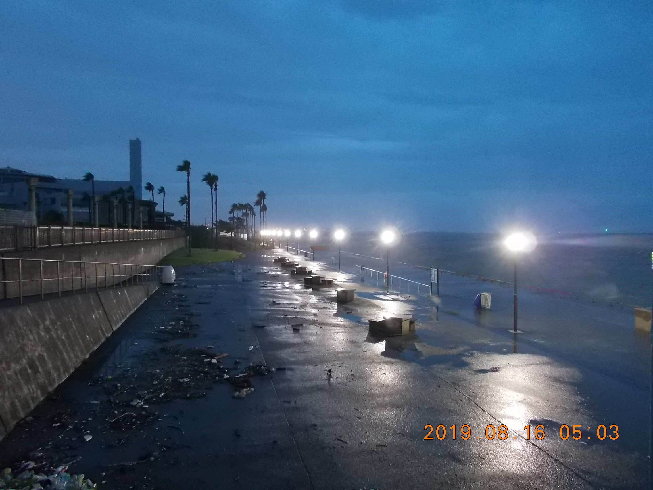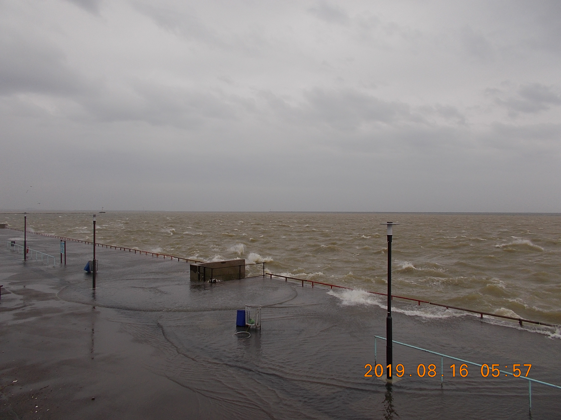 開園時、南西の風5~7m、風でゴミが岸壁近くに集まっています。