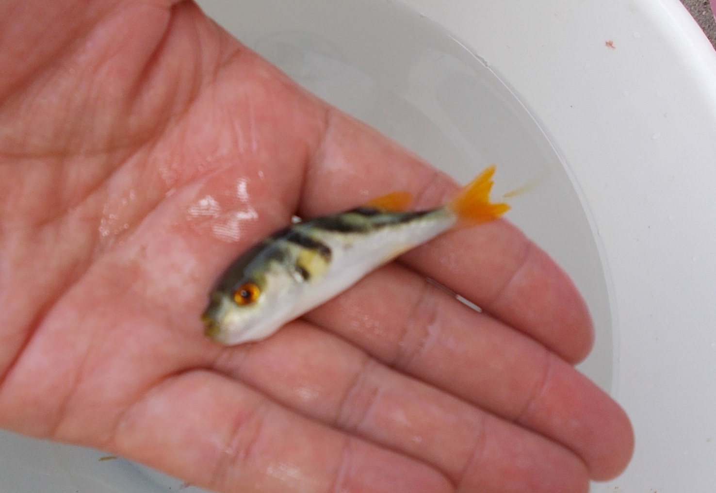 小さくてもフグ、毒があります!大きさは約5㎝、尾ビレ、背ビレ、胸ビレがオレンジです。