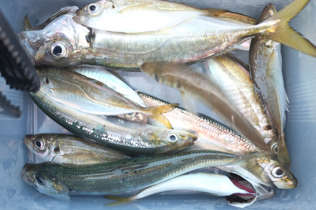 早朝のアジ回遊は少なく、海面にマイワシとサッパの大きな回遊が始まり、仕掛けを投入するとすぐにマイワシとサッパが喰いついて来ます。その為、仕掛けが底まで到達出来ないのも、アジの釣果が少ない理由の一つかもしれません。
