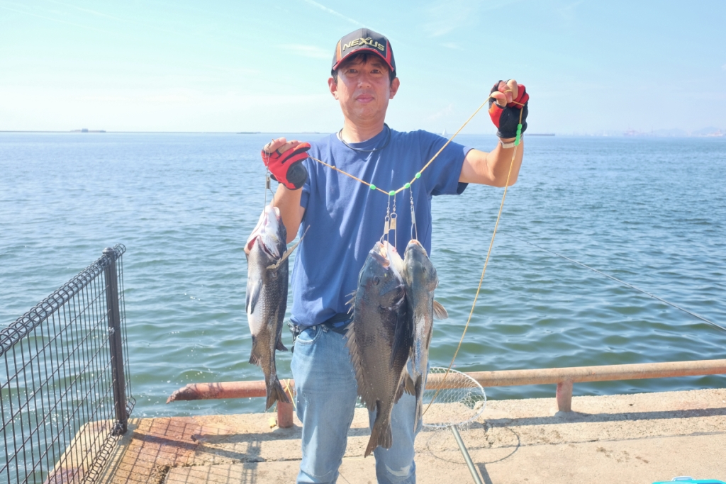 チヌの釣果。フカセ遊動ウキ、餌オキアミの方が45㎝オーバーのチヌを4匹、30㎝程のチヌを6匹の釣果。棚2.5~3ヒロ(1ヒロ1.5m)。全て壁際との事で7時以降に釣果が出てきたとの事、それまでアタリはなく諦めかけていたそうです。。