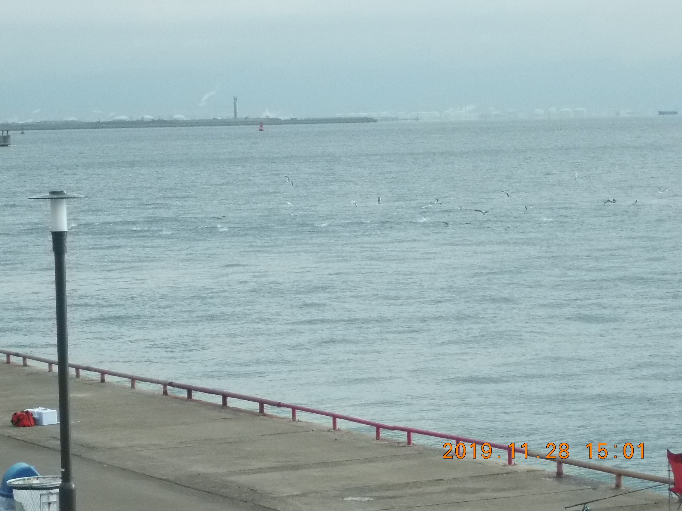 午後3時現在、北西の風2~3m、天気くもり、気温12℃。先ほど東側で大きなナブラが発生、海鳥が多数飛び回っています。日没を過ぎて気温が10.0℃まで下がりました。皆さん寒い中で防寒着を着こみタチウオをねらっておられます。今夜のタチウオは結果まずまずです。