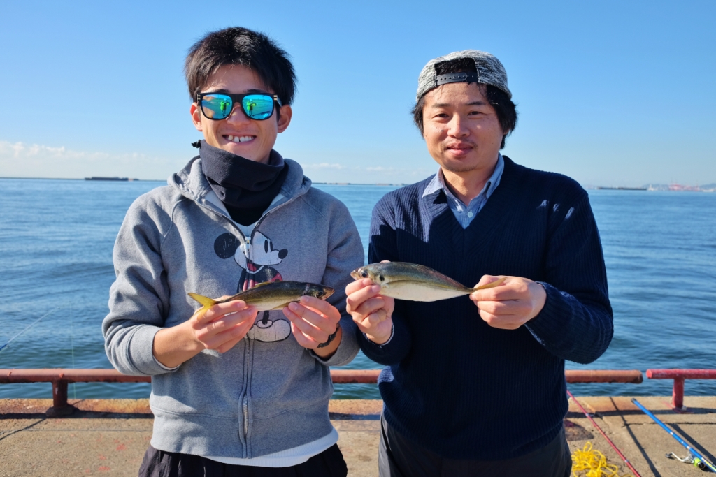 夜明け前からサビキでアジがポツリ…ポツリ…の釣果。20㎝をこえるアジの釣果もあり、小アジと違った引きに驚かれる方もいらっしゃいました。アジの釣果は1時間も経たずに終わり、以降は小さなカタクチイワシが30分程釣れましたが、8時を過ぎるとカタクチも止まってしまいました。