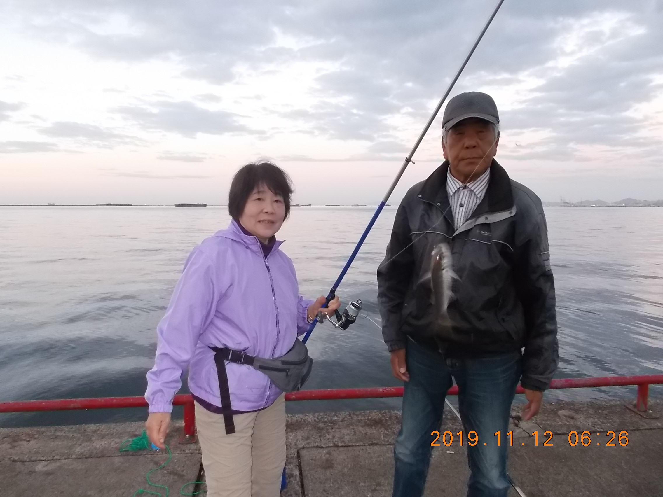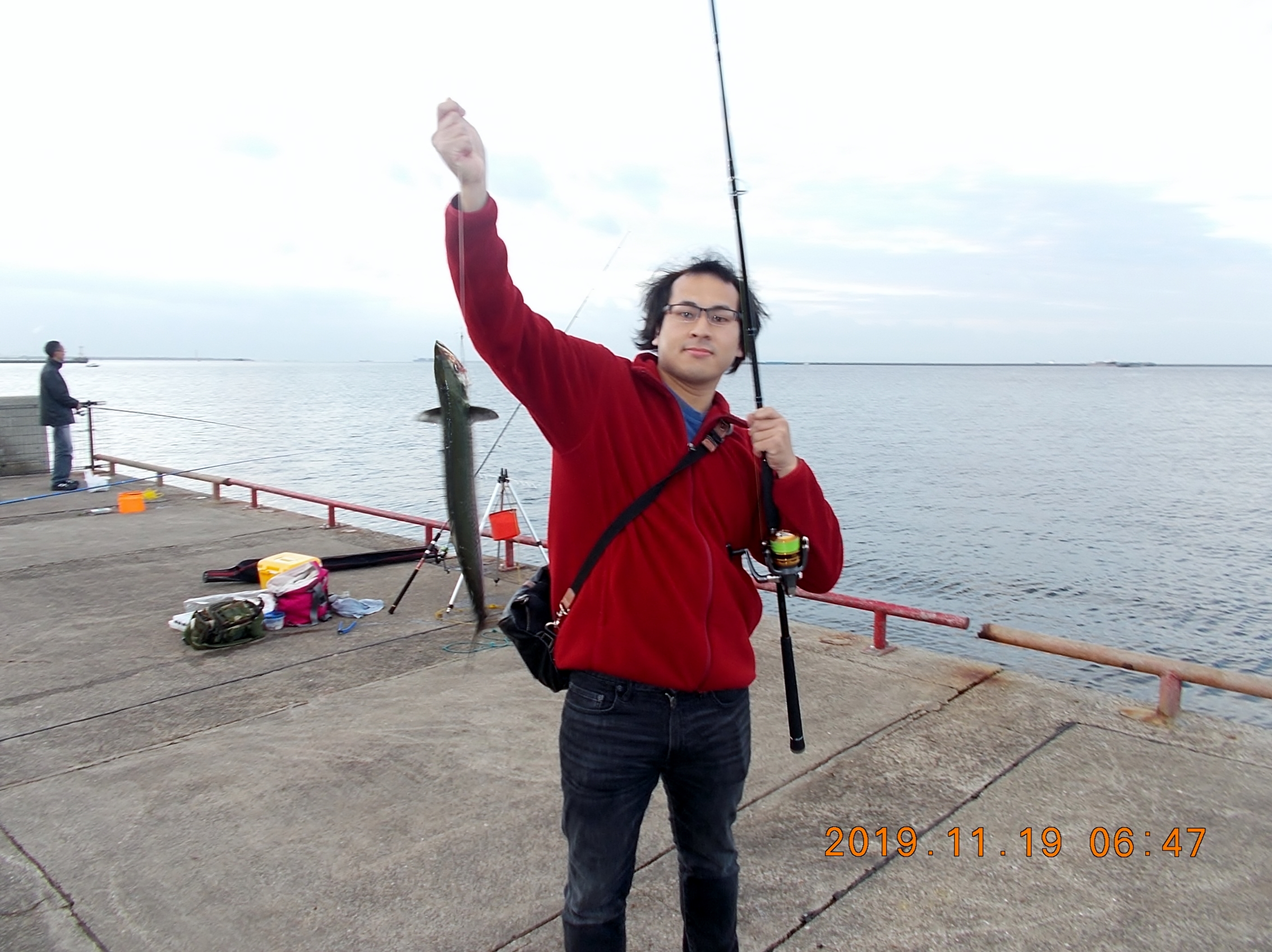昨日とは違って、陽が昇ると同時にアジが釣れだし、多い人で30匹ぐらい釣られていました。たまに大アジが混ざって、今日来て良かったと喜ばれています。一方タチウオは、ウキ釣りで1匹、引き釣りで2匹とあまり良くないみたいです。9時頃から西風が強くなり(4~5m)、白波が立ってきました。悪条件の中、10時頃から管理棟前で数人のお客様がサヨリ釣りをされて、少ないですがポツリポツリと上げられています。