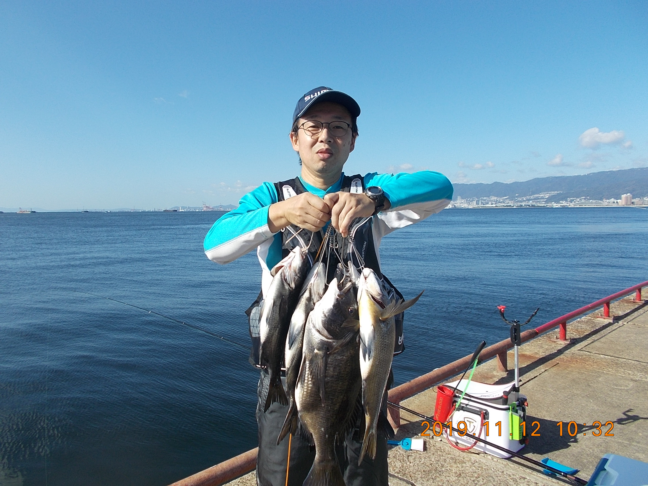 4時半、ワームでハマチ45.0cm。5時半にサビキでチヌ45.0cm。6時前後にアジの短い時合いがありました。キビレ43.5cmも上がっています。