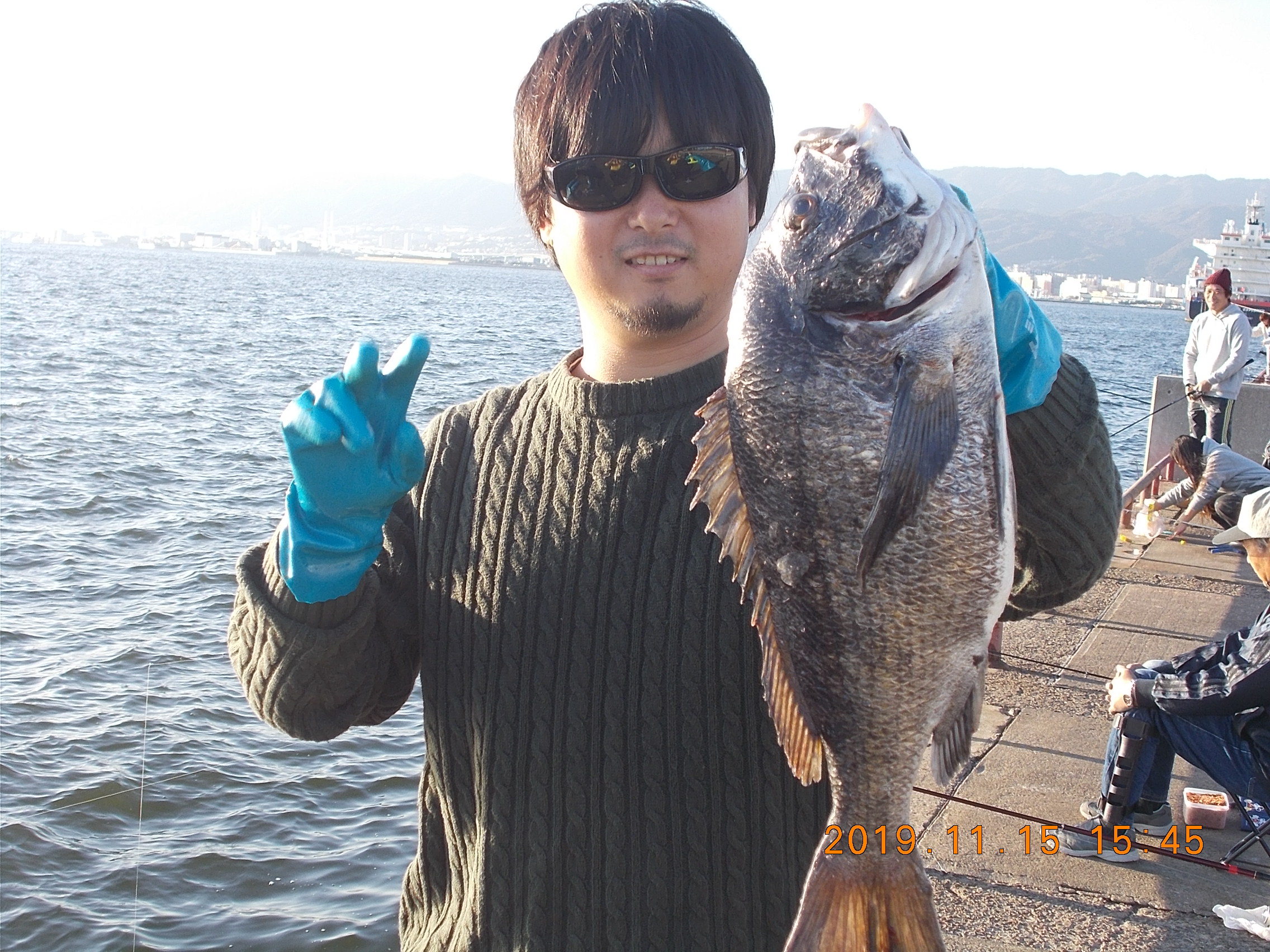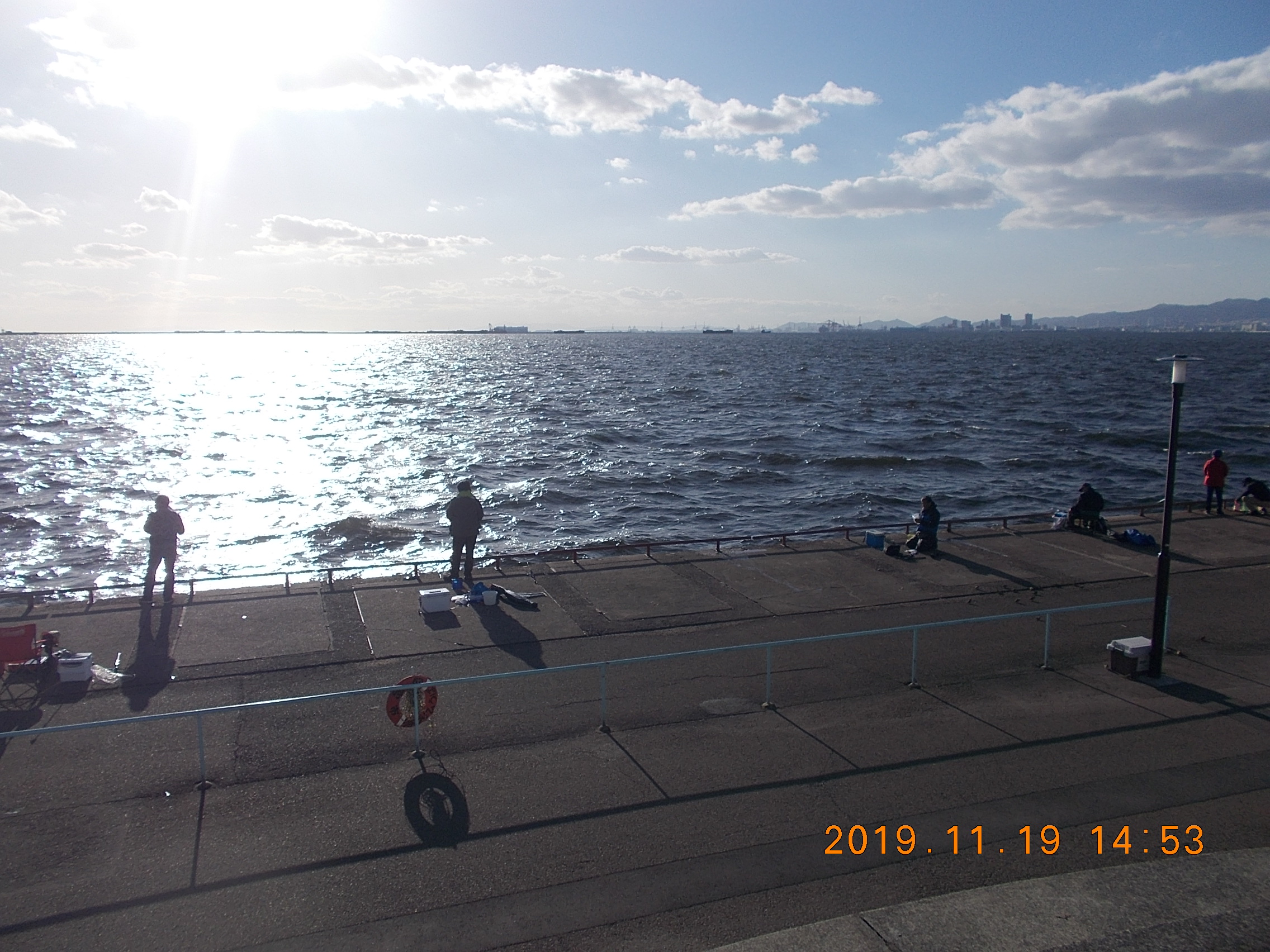 午後3時現在、西の風2~3m、天気晴れ、海上波ややあり。午前中の強風はほぼ治まりました。サヨリ狙いとサビキの方が半々くらい。気温が17℃までしか上がらず肌寒いです。夕方からもっと冷えるかもしれません。午後4時管理棟前、イソメでチヌ43.0cmあがりました。