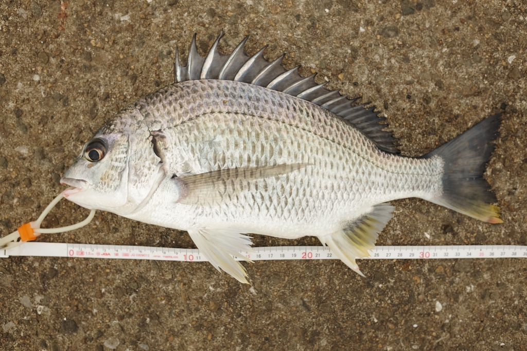 この1週間程、チヌがコーンなどの黄色い刺し餌に反応しているようだとお話を聞く事が幾度かありましたが、本日の3匹ともオキアミでした。岸壁近くには全くアタリが無く、竿一本分前にポイントを作るとアタリが出たそうです。ボラアタリも無かったとの事。正午~2時の間に連続して東でチヌ47㎝、中央でキビレ40㎝の釣果、この二匹も刺し餌はオキアミ。