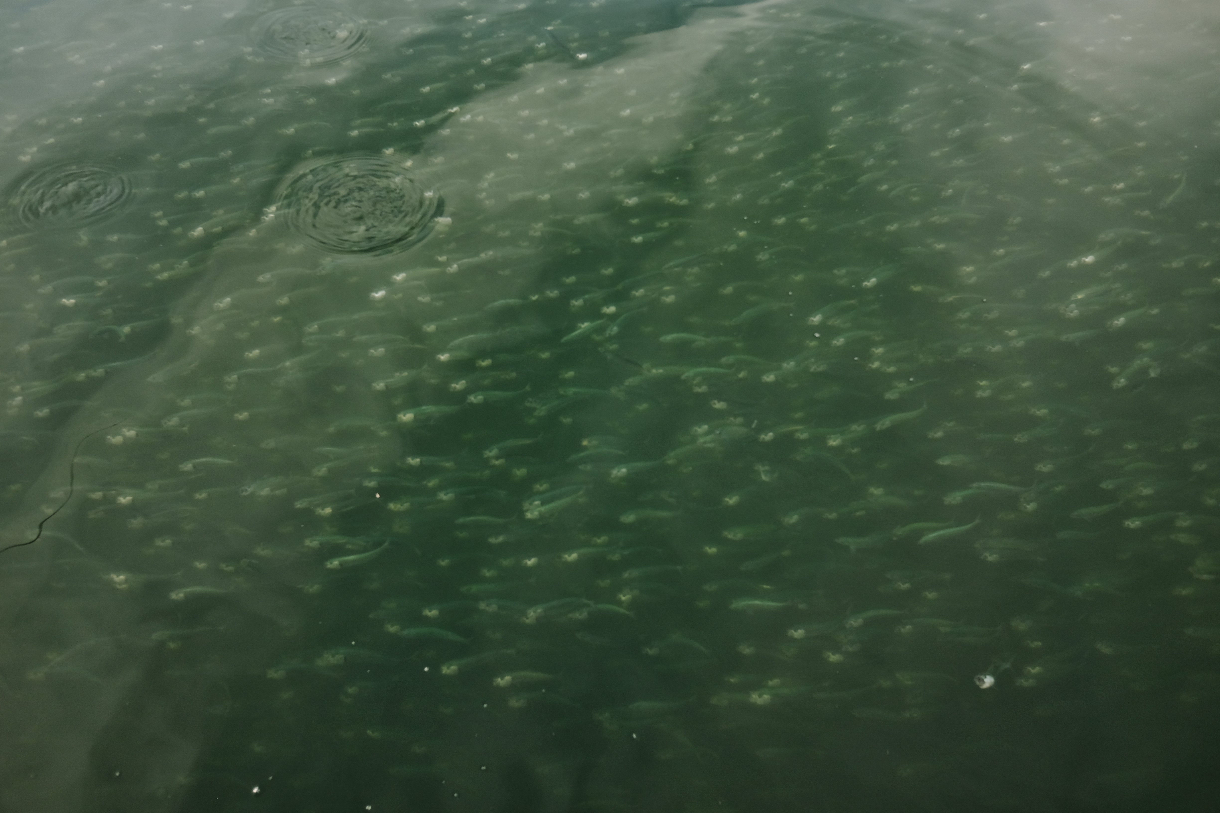口を大きく開けプランクトンを食べているようですが、サビキのハリにも餌にも反応はありませんでした。通り過ぎた時に釣果が2匹ありましたが、通り過ぎた後は何の反応も無し。