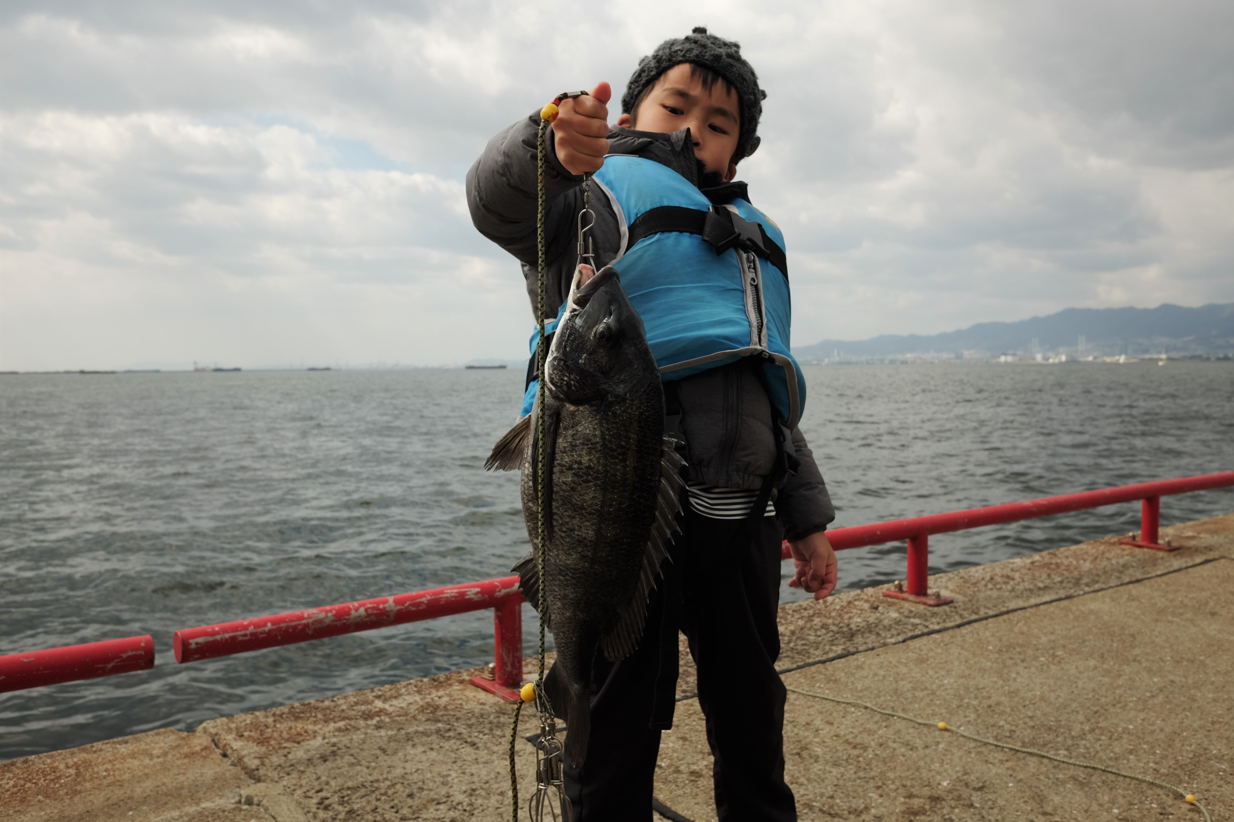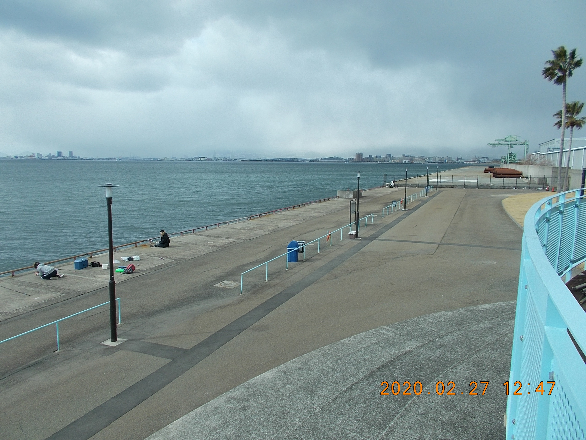 午後2時半、気温は12℃まで上がっています。海面は南西の風0.5mでおだやか。釣り人は約10人ほど。中央付近、えさオキアミで44.0cmチヌ上がっています。今日の釣果はこれまで。