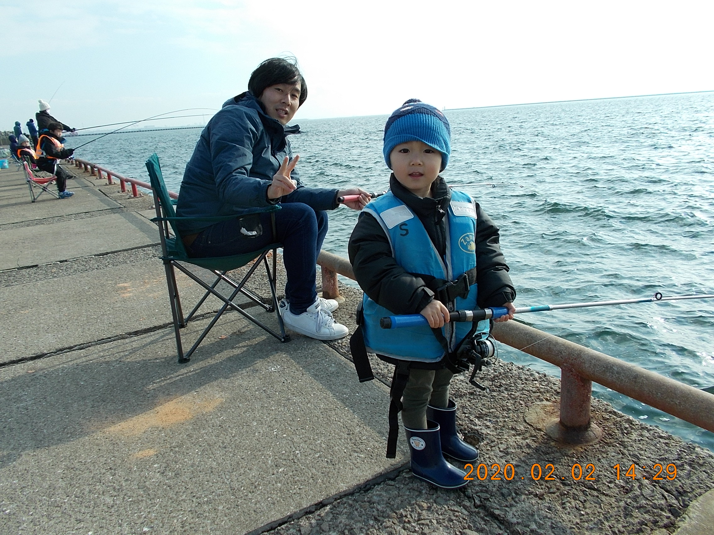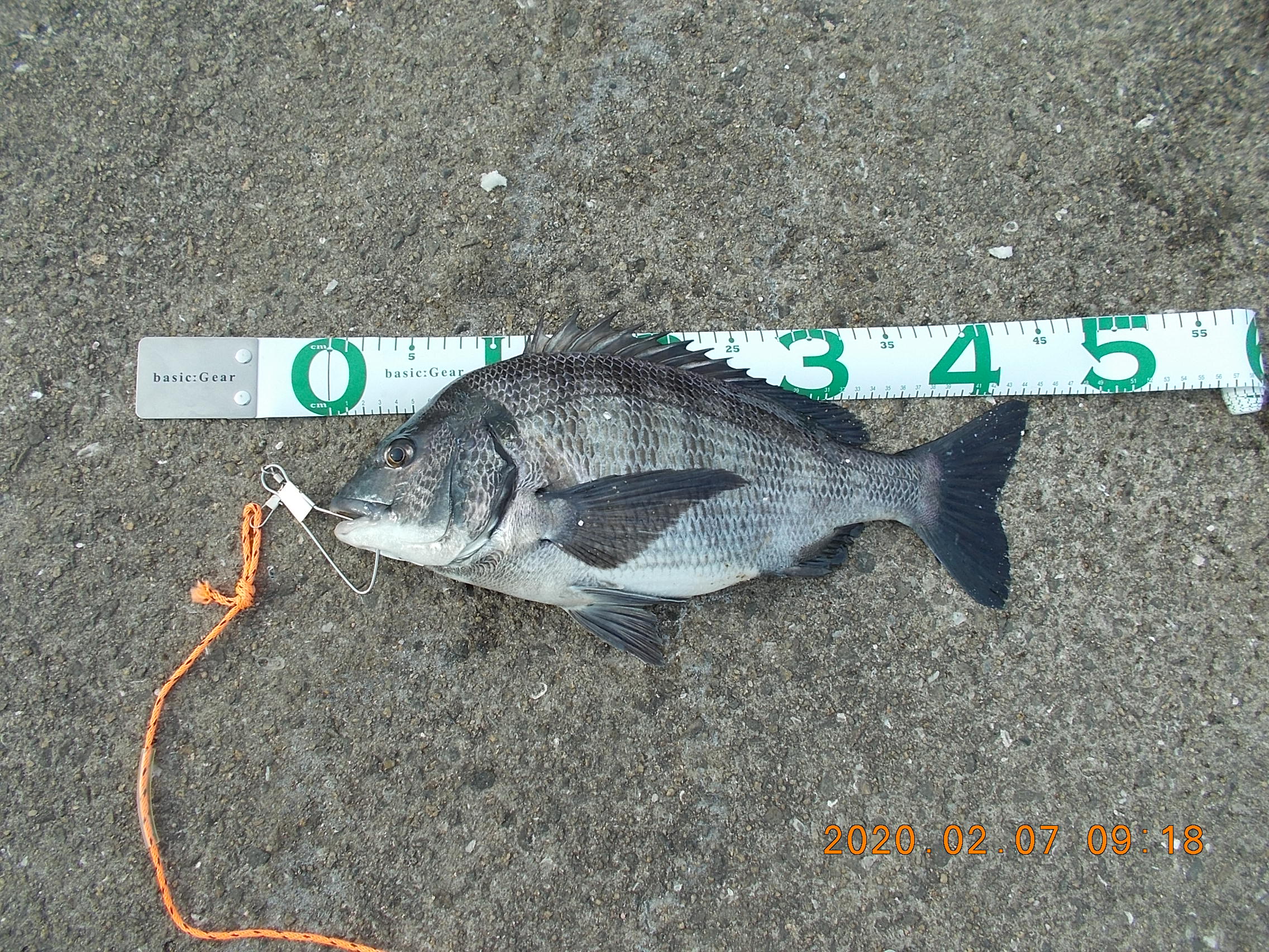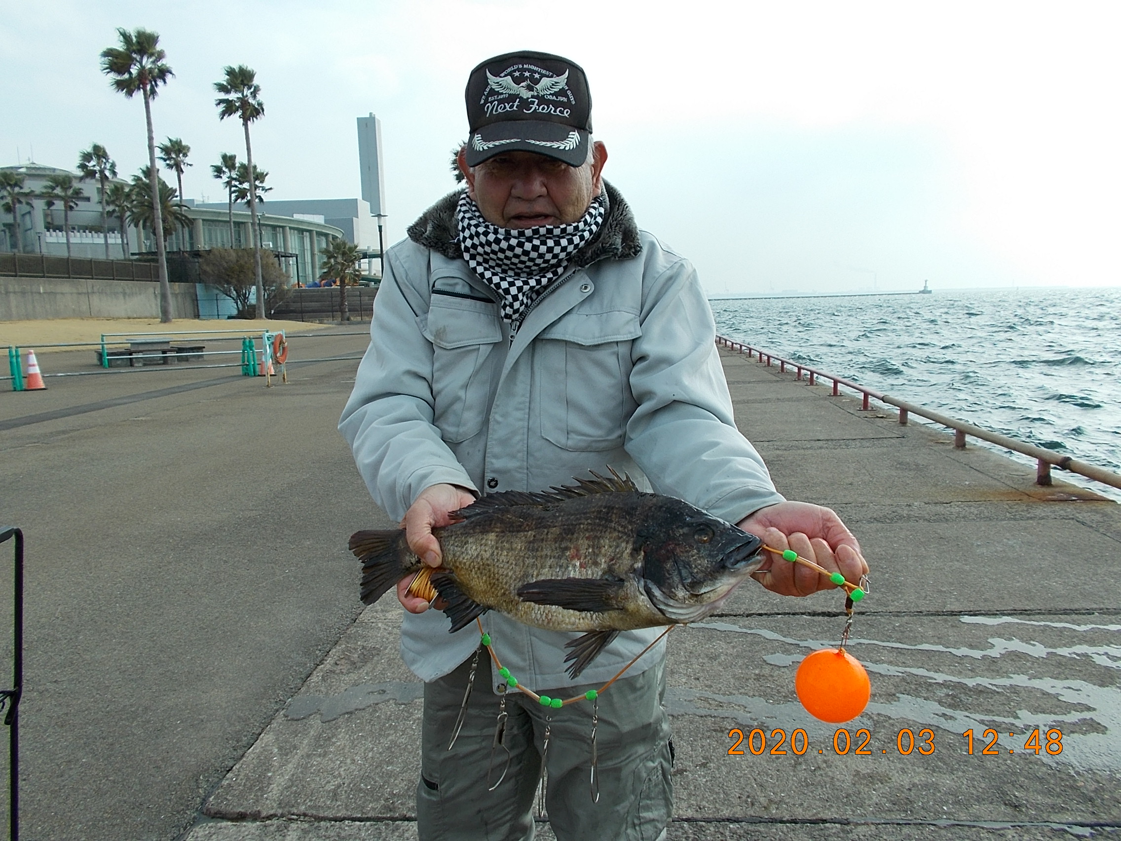 北西の風1~2m、波は穏やかです。今の気温は0℃と厳しい寒さとなり、是非防寒してお越しくださいます様お願いいたします。朝から若者3人がサビキ釣りとルアーで挑戦していますが、何の反応もないみたいで半ば諦めかけていました。9時過ぎ頃に、中央付近でフカセ釣りをされている方が45cmのチヌをゲットされました。