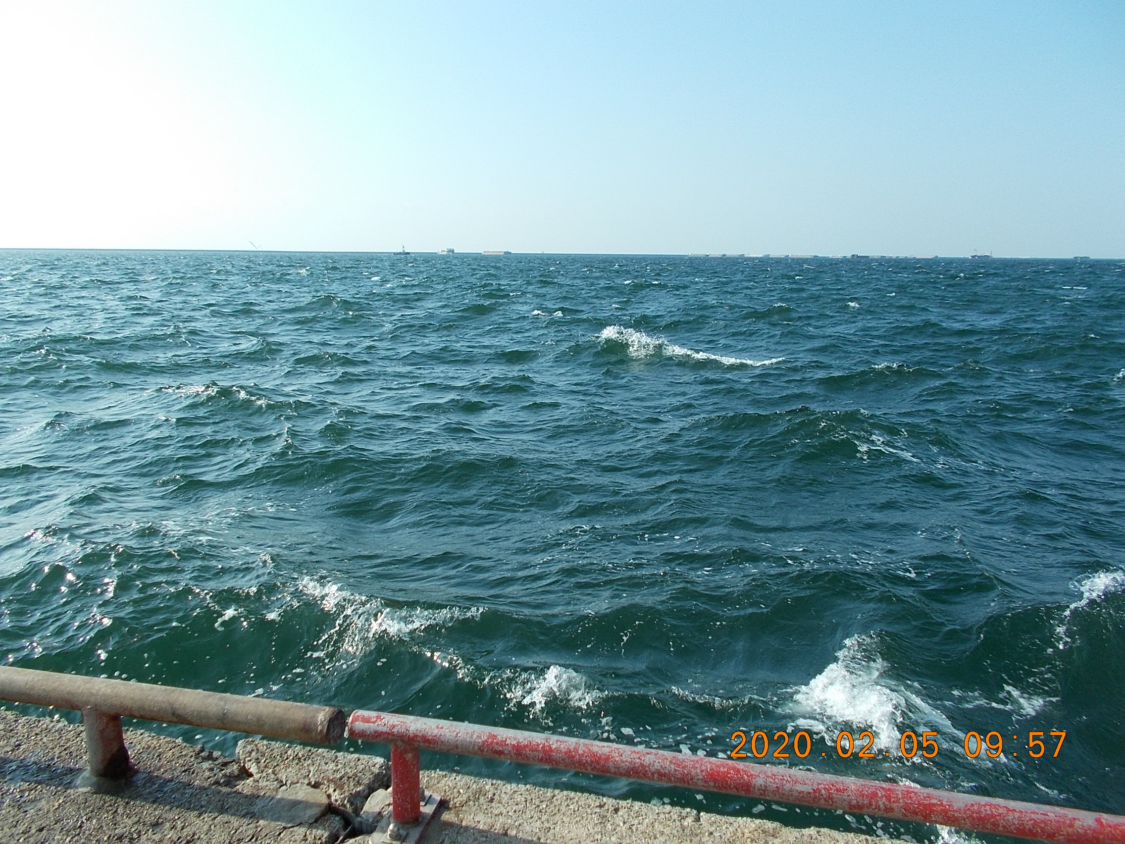 午後3時現在北西の風3-5m天気晴れ気温5.0度。風が強く右から左へ川のように波がながれています。釣り人はお二人。釣果はまだなし。