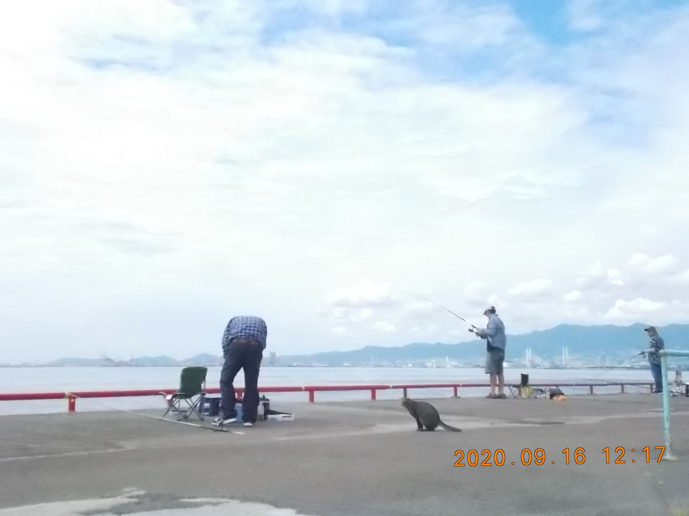 午後4時半現在、西の風1~2m、天気薄曇り、気温29℃。午後からは時たまサバが上がるぐらいです。3時半過ぎからカタクチイワシも釣れていますがたくさんとは言えません。チヌは午後に2枚上がりました。エサはシラサ。