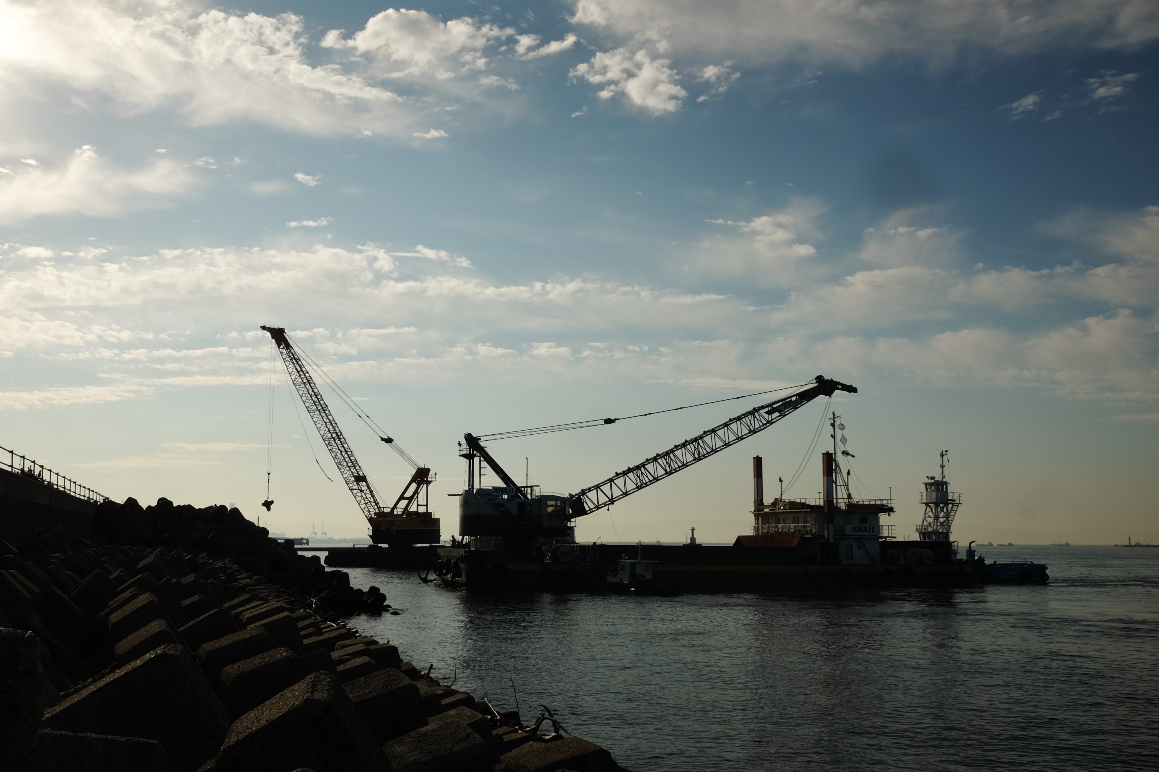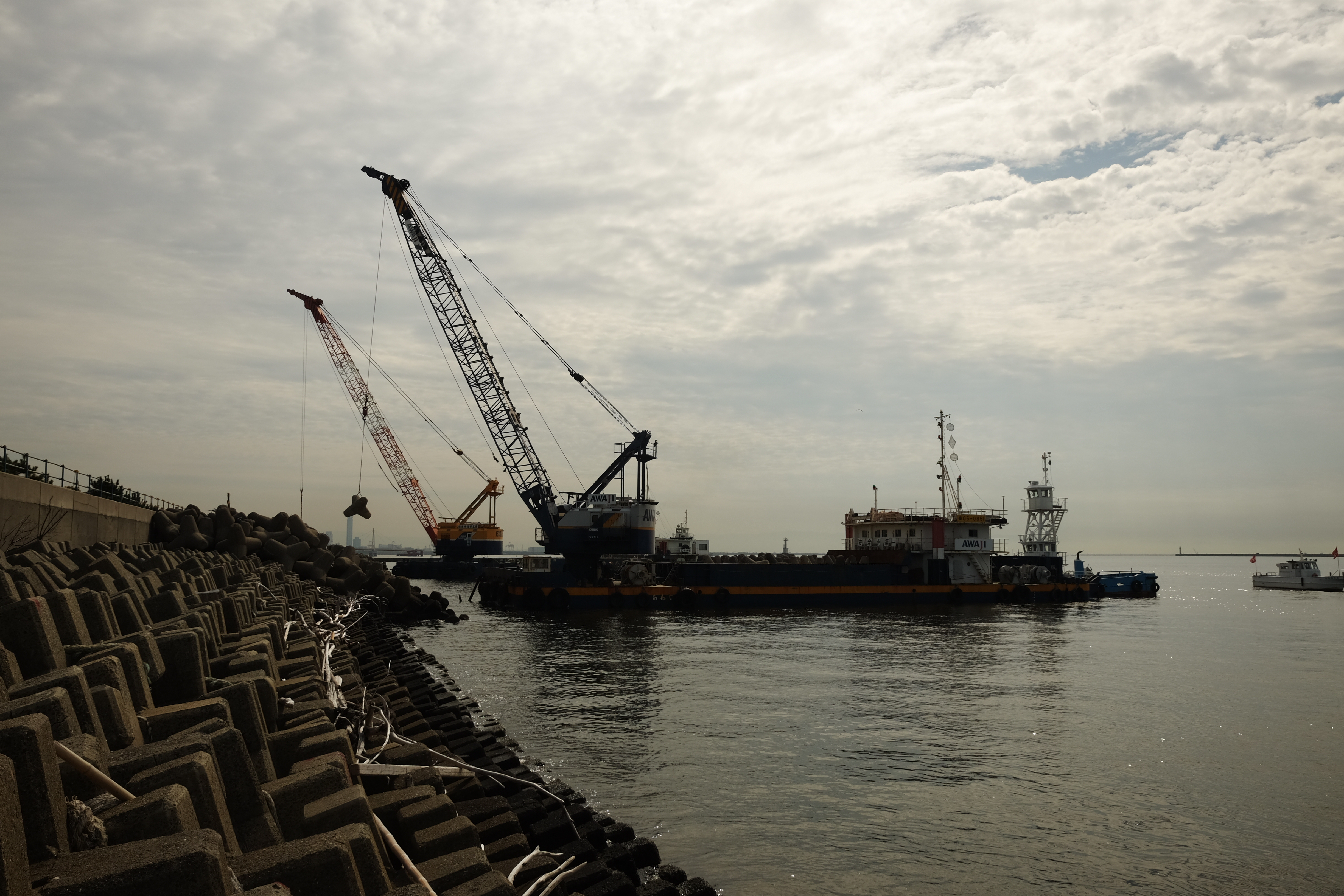 26日から、海づり広場よりも東のテトラ帯で『兵庫県高潮対策10箇年計画』の鳴尾浜東岸防波堤拡張工事にともなったテトラ撤去作業が始まりました。早朝6時~7時に2隻のクレーン台船が入り、12時まで作業を行い13時に戻るようです。
