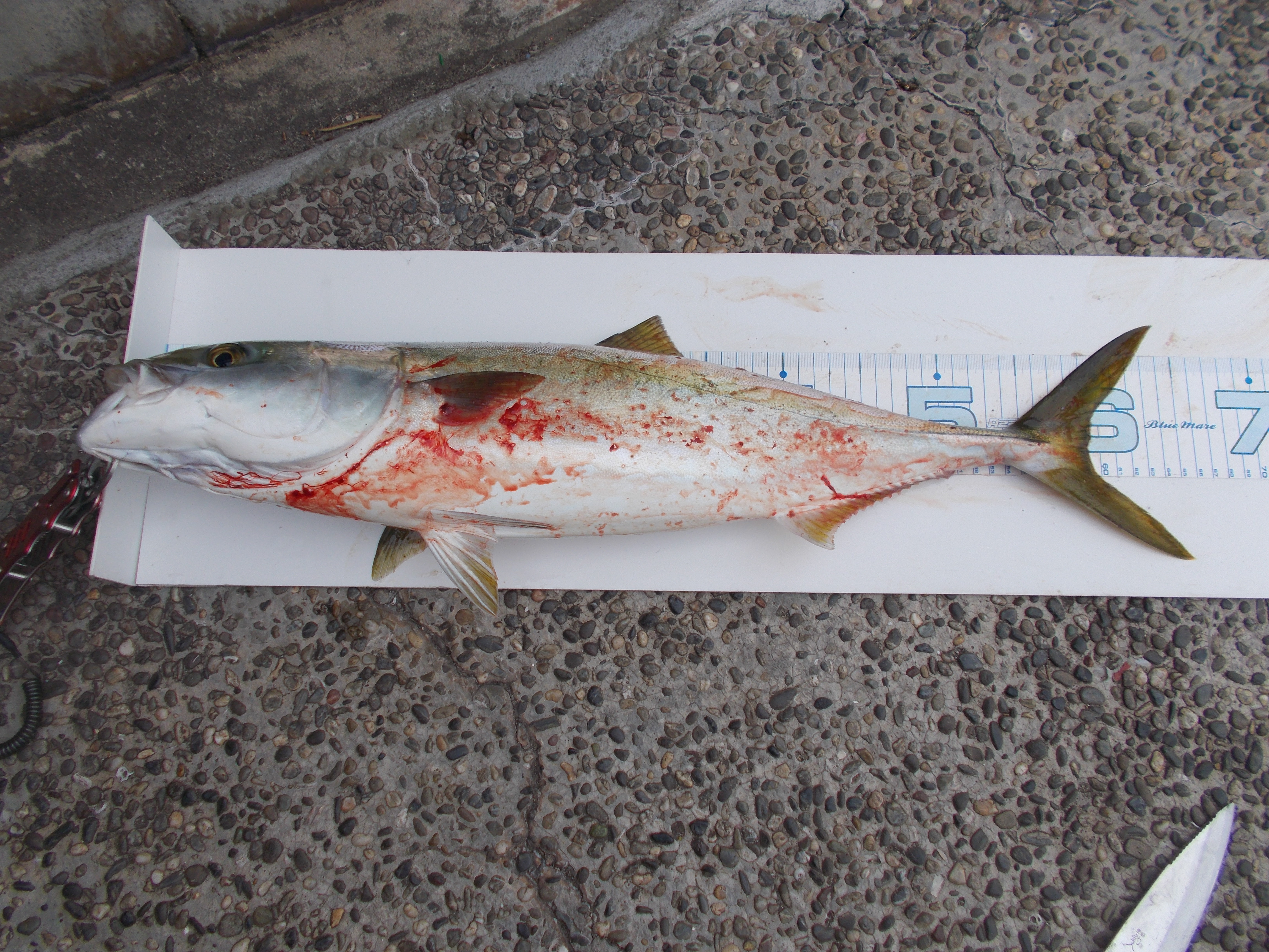 午後3時現在、北東の風0.5-1.0m、天気曇り、気温24.0。夕方から雨の予報で空がどんより曇っています。中央付近、ルアーでメジロが連続ヒットしました。サビキはいまいちでしたが、夕方に短いアジの時合いがありました。。