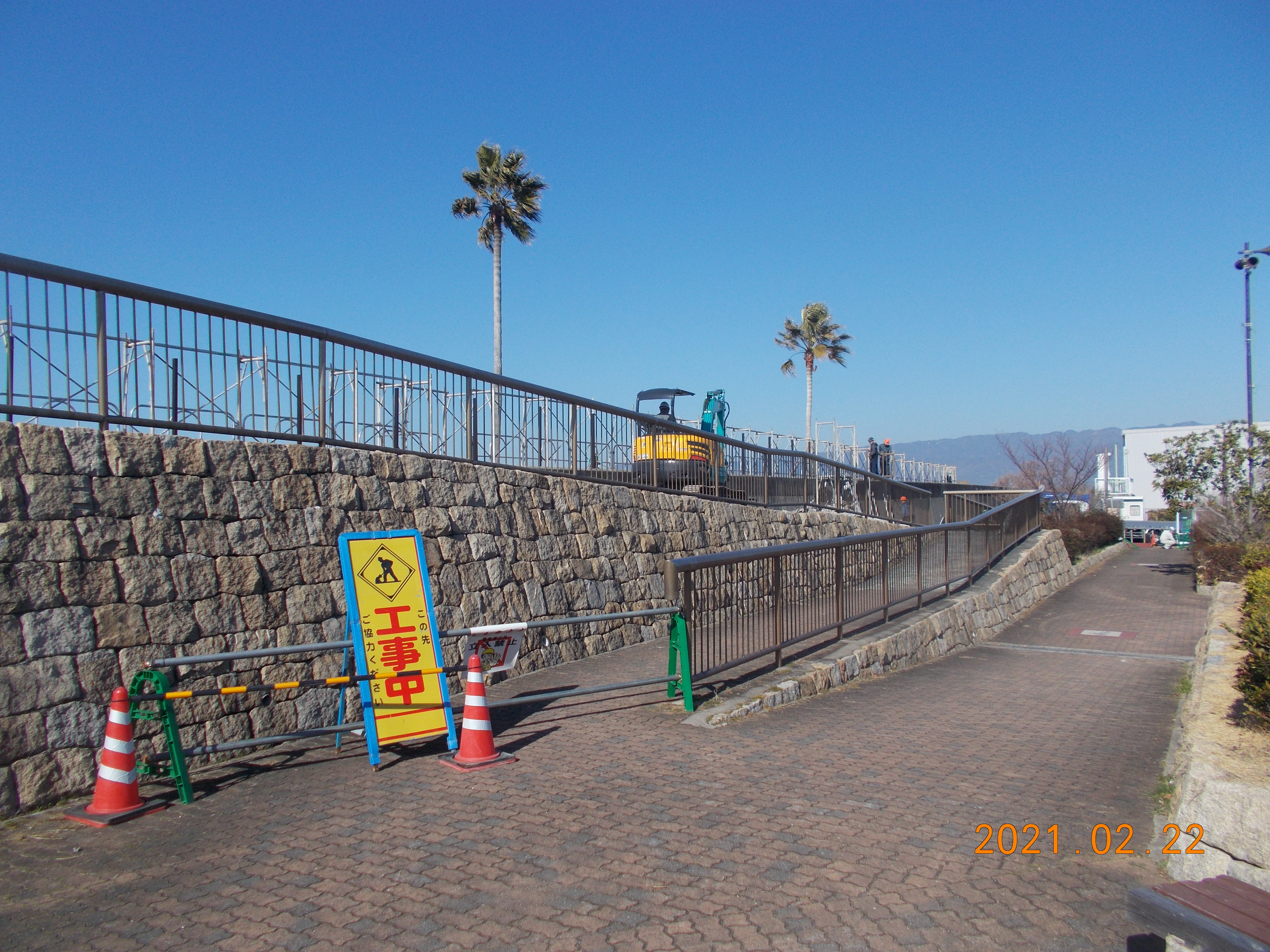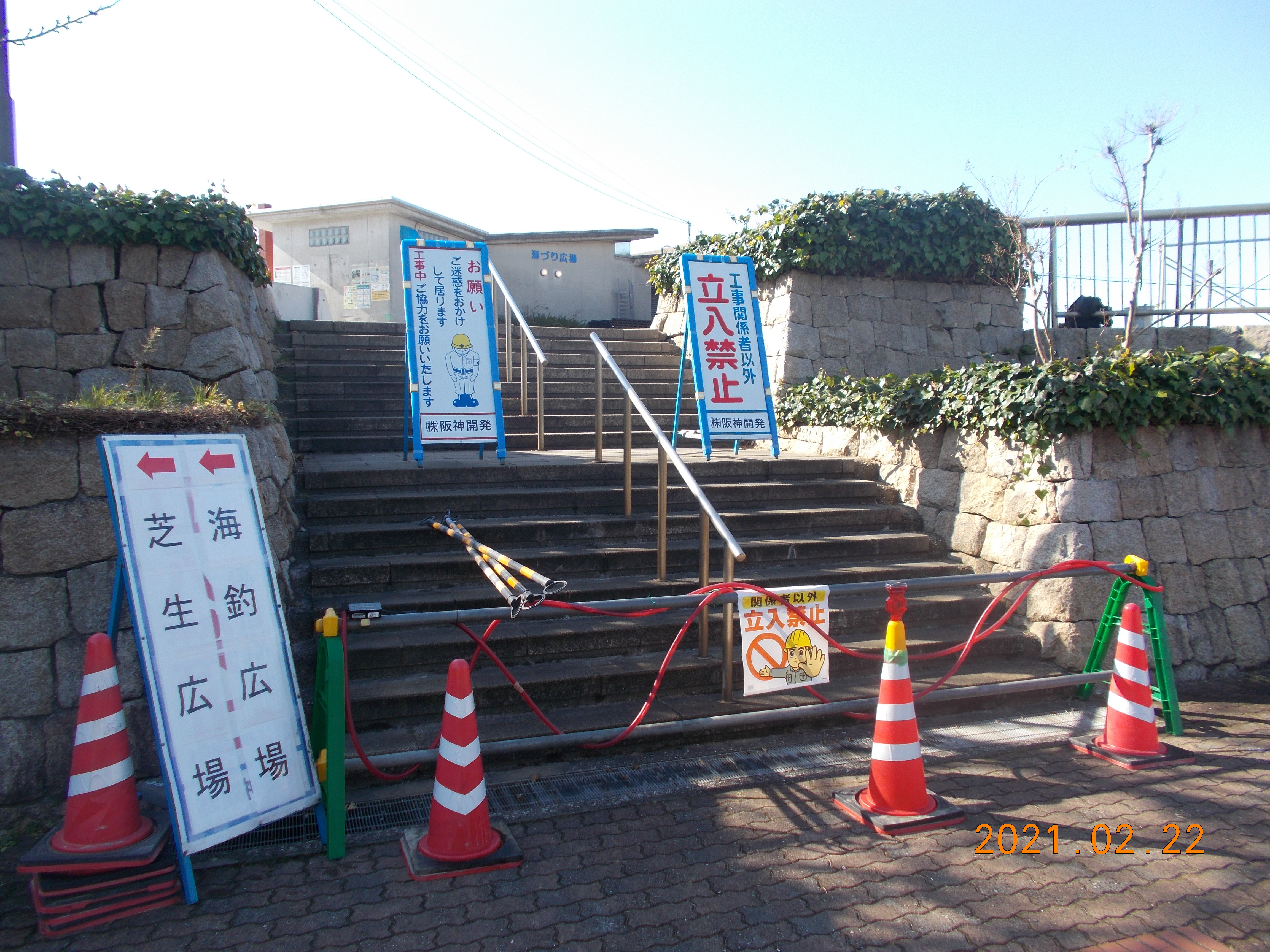 鳴尾浜海づり広場も工事区画に入り、管理棟より東側(大阪方面)の嵩上げ工事を行い、2月22日月曜日から海づり管理棟より西側へ工事区画が変更となります。