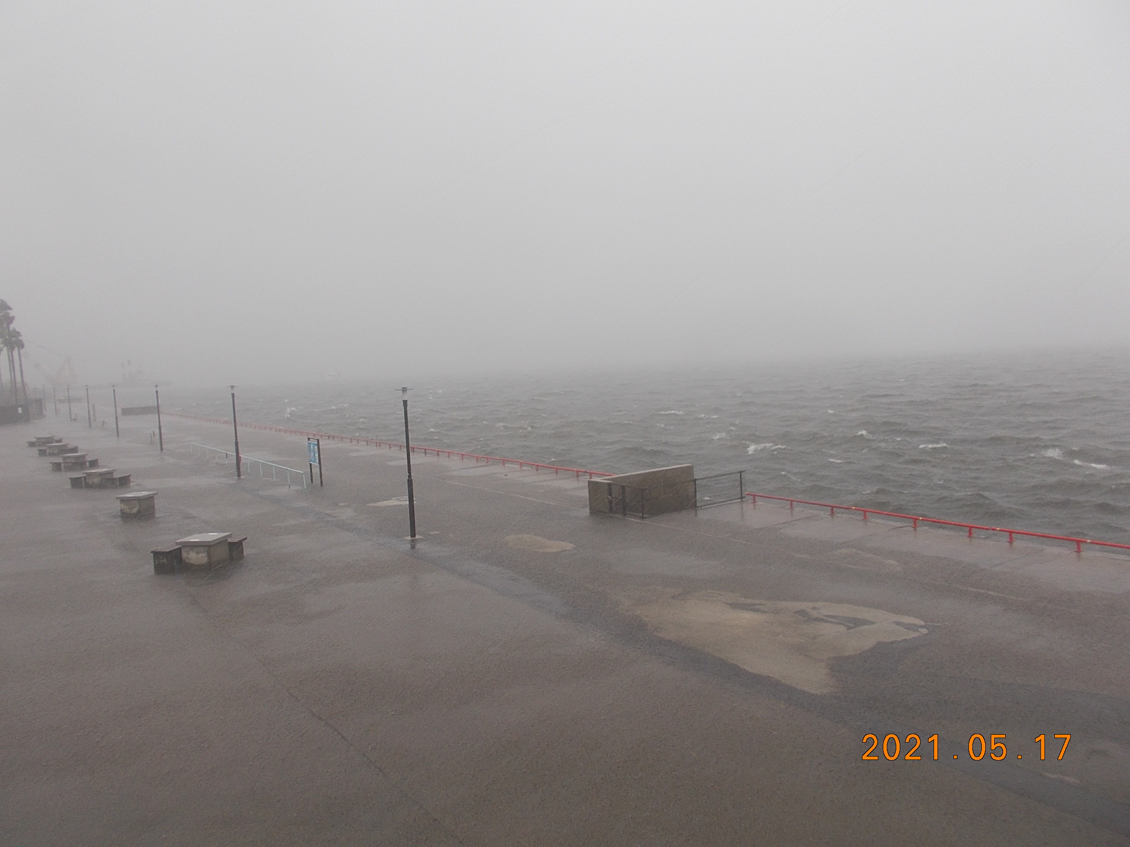 昨日から雨が降っていたのですが、今日は昨日より激しく降っています。特に海の色は澱んで、激しく波を打ってるように感じられます。