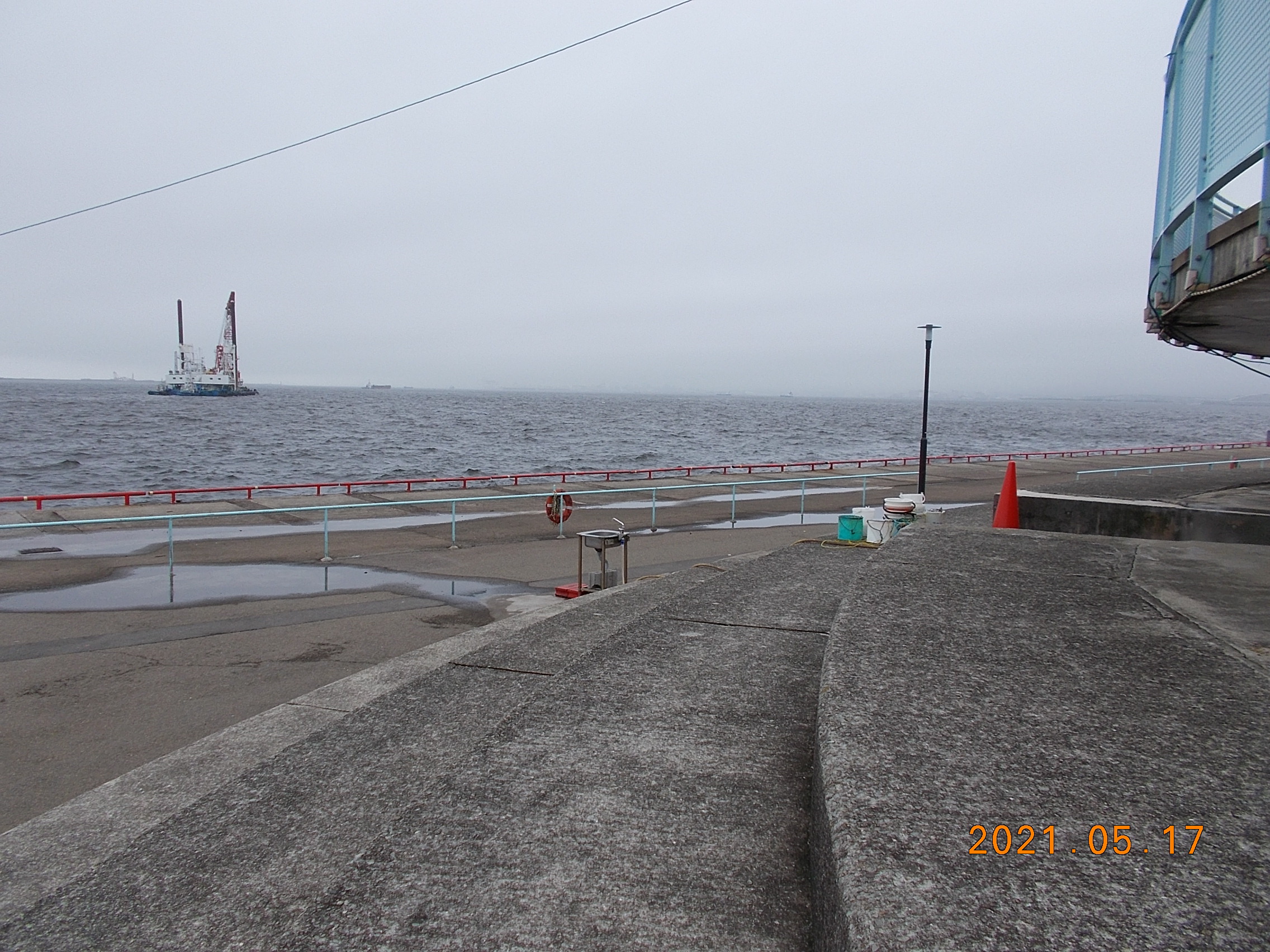 開園時、南西の風5~7m/s、波 約50㎝うねりが有り、満潮時間と重なっているため、時折 潮が釣り台に打ち上っています。とても荒れた天候です。