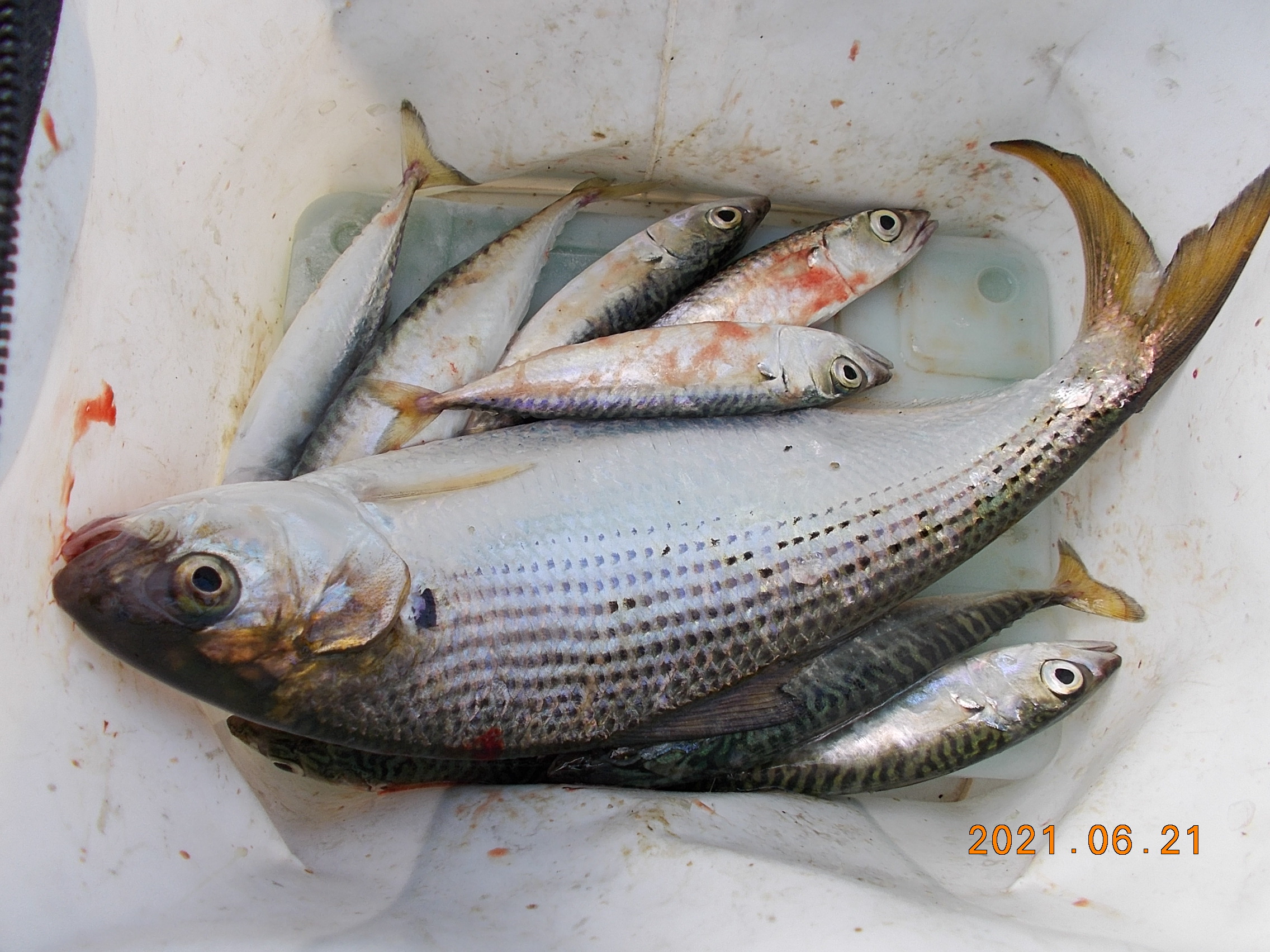 サビキ釣りでは、小サバ以外に、ごく稀にですが、美味しそうなマイワシや良型のコノシロが釣れたりもしています。