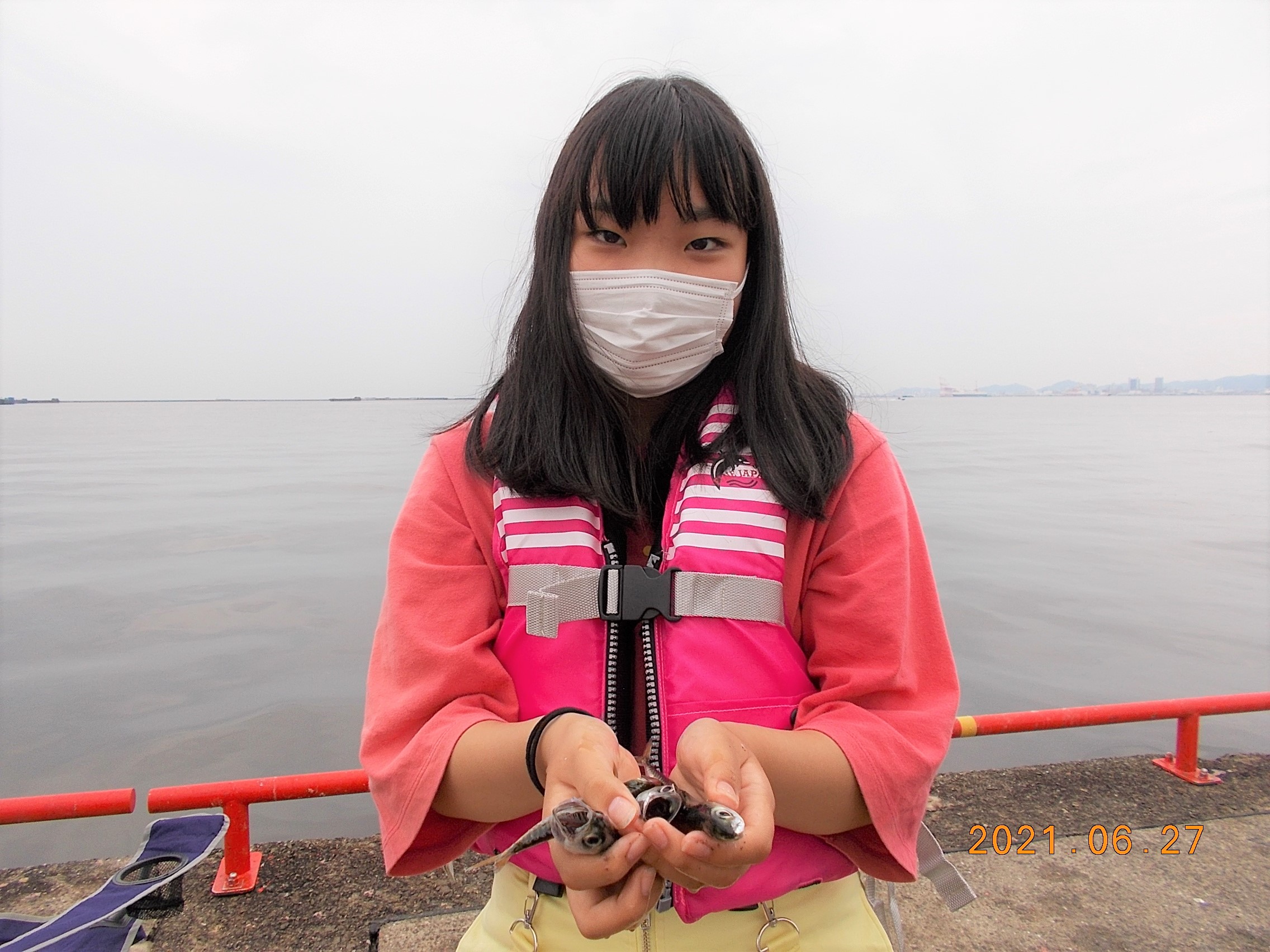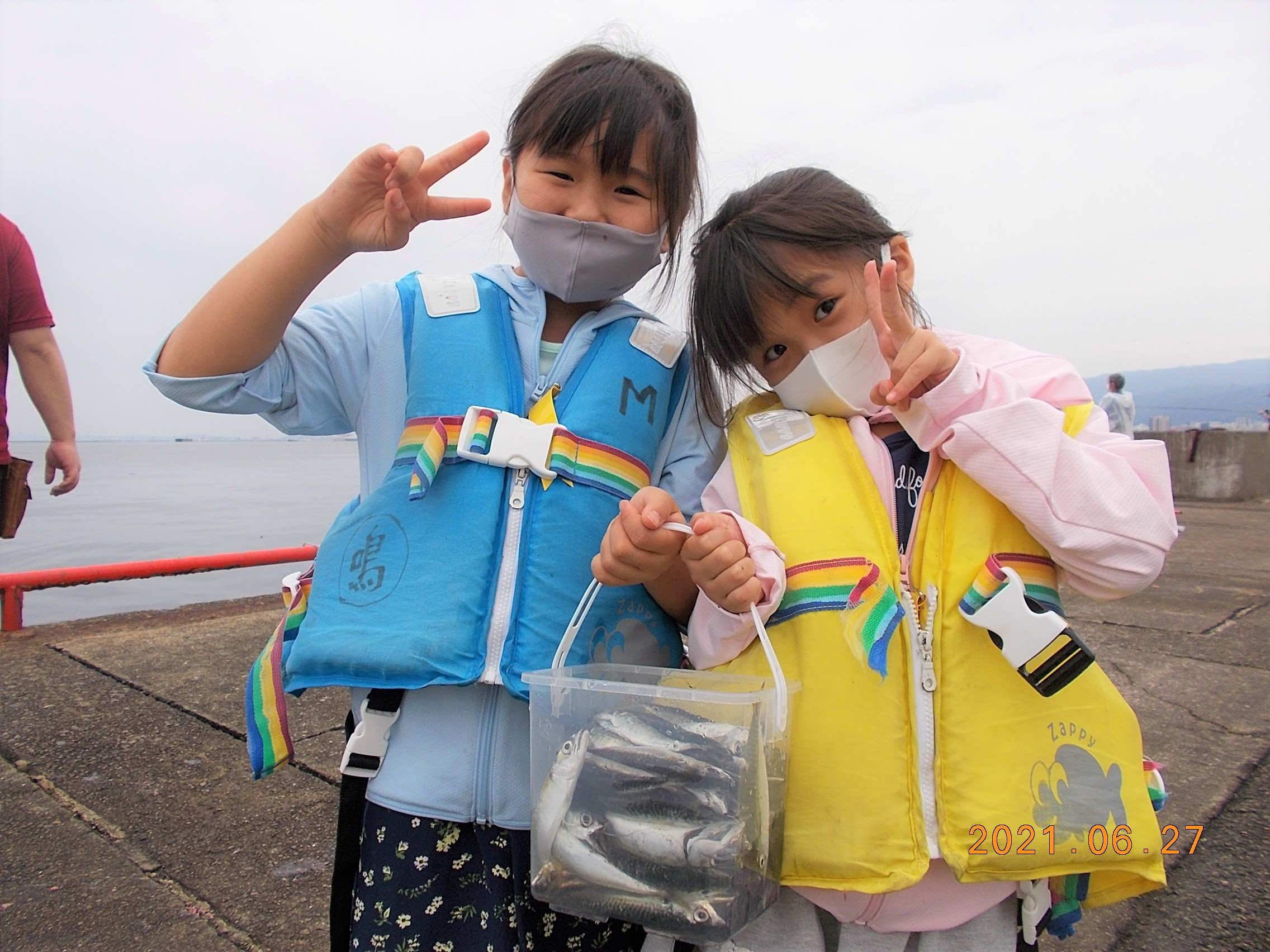 サバの数が減っている代わりに少しずつ大きくなり、サイズにバラツキが出てきました。連で掛かってしまうと仕掛けがもつれてしまって、ほどくのに時間がかかってしまいます。油断せず掛かればすぐに釣り上げたり、アミエビを入れるカゴを重い物に交換した方が良いですよ。釣りに夢中なお子さんの隣で、仕掛けをほどくのに四苦八苦するお父さんお母さんを沢山見かけました!みんな気をつけてぇー!