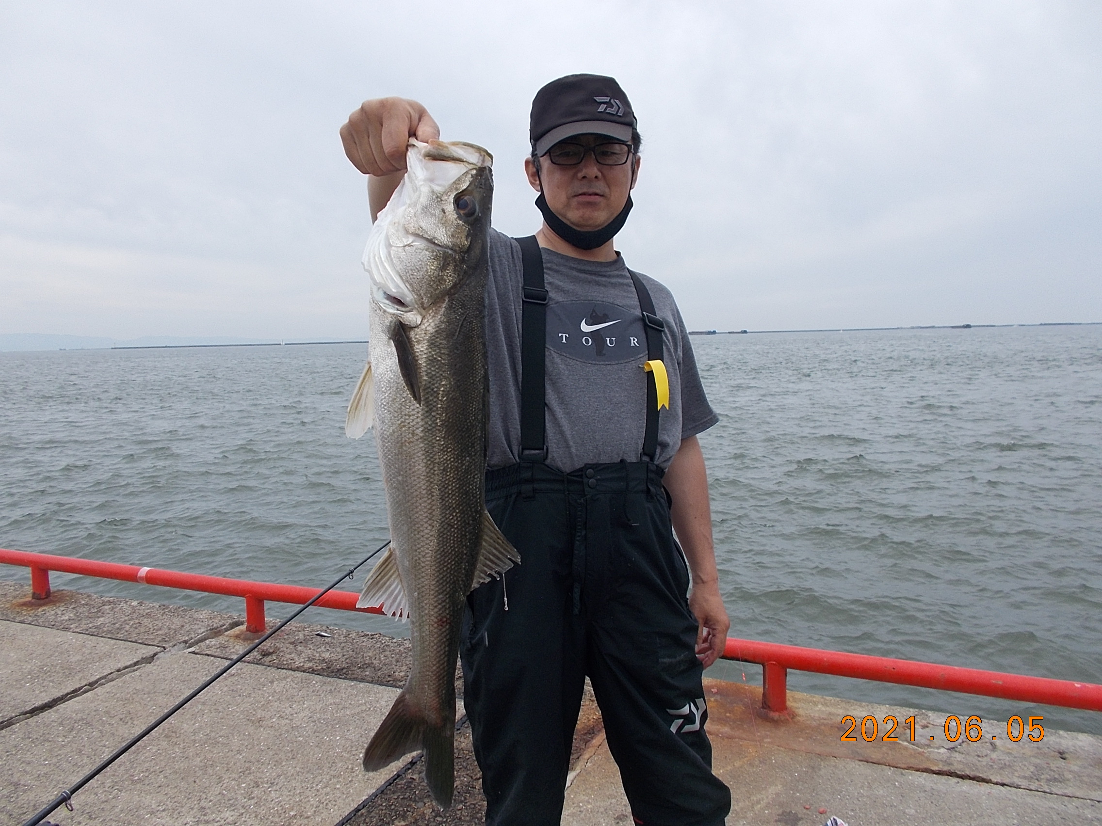 開場後予報通り雨が降り出し、お客様も9時半ごろにお一人入られています。その方が、イガイの落とし込みでキビレの43cmを上げられました。11時頃から南西の風が強くなり、白波が立ってきました。