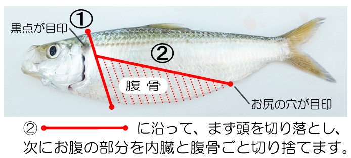 小さいですので包丁よりハサミの方が捌きやすいと思います。まずハサミで頭を落とし、切面の背骨の下からお尻の穴まで内臓ごと切り捨てます、尻尾も落としましょう(3番目の添付画像、4番目の画像はサッパの捌き方ですが同じ捌き方となります、図のようにハサミで切ってみて下さい)。