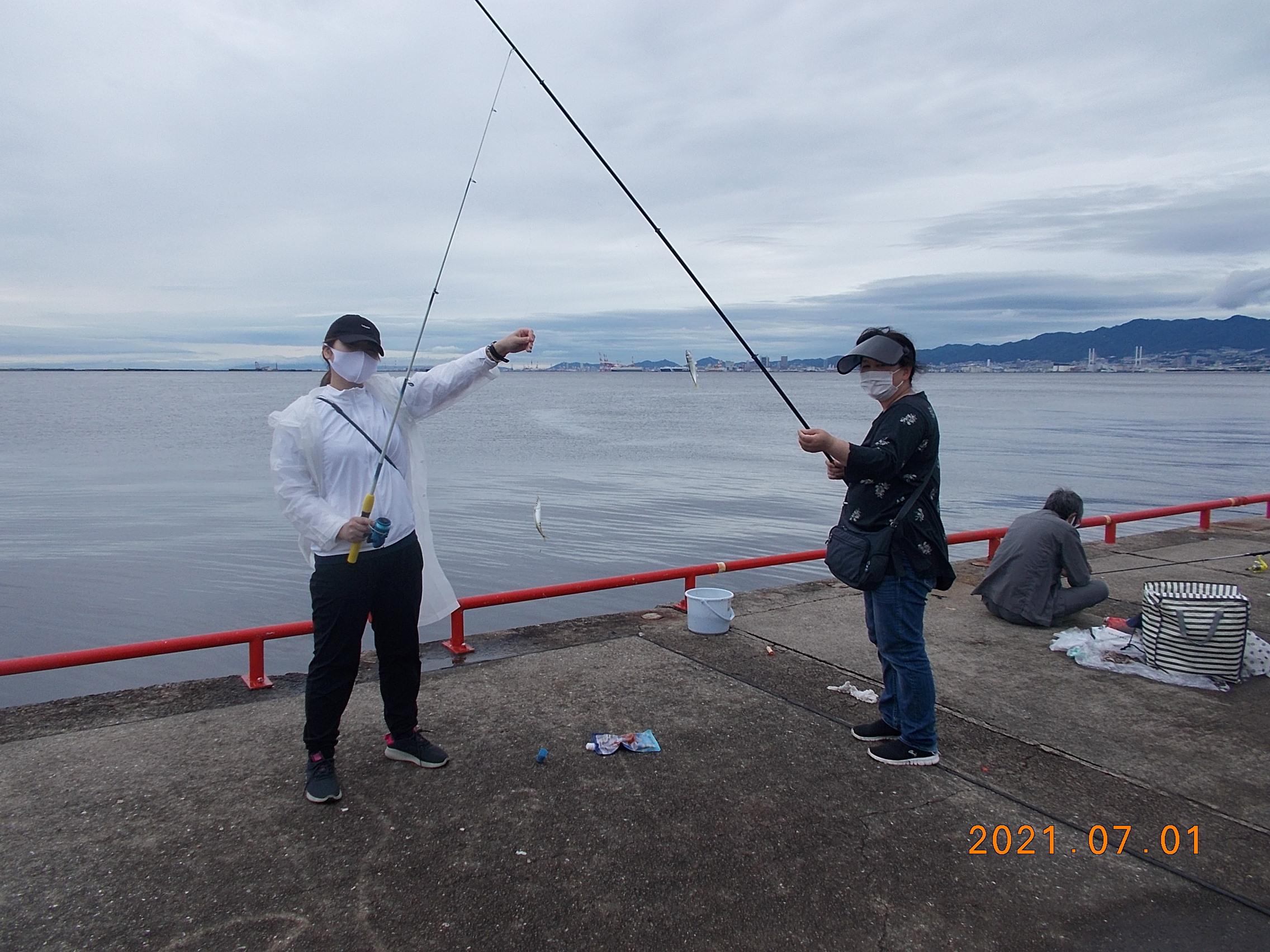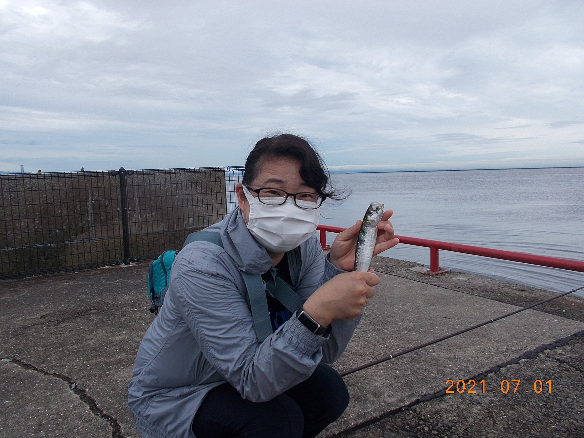 午後2時半現在、北東の風0.5-1.0m、曇り空、海面穏やか。気温26℃。雨は止んでいます。ご来場者わずか。サビキで小サバが順調です。