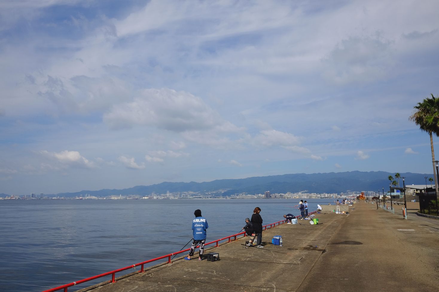 すがすがしい鳴尾浜です。波は穏やか。午前7時現在、皆さんまだサバしか釣れていない様子です。一生懸命釣り竿を出しておられます。お昼前だんだんと水温が高くなり、釣りは苦戦を強いられています。午前11時過ぎで只今52人程釣りを楽しまれております。
