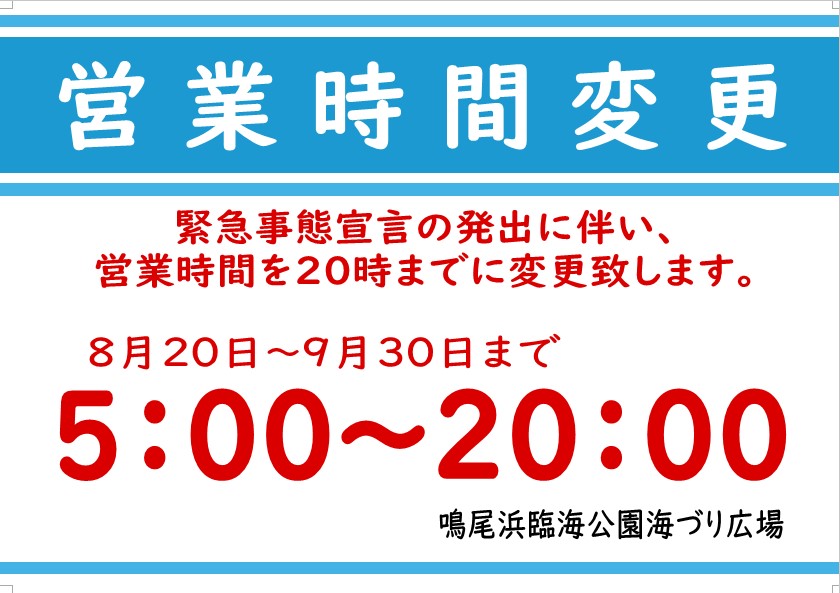 新型コロナウィルスに関する緊急事態宣言の発令に伴い8月20(金)~9月30日(木)の期間、海づり広場の営業時間を20時までに時間短縮といたします。10月1日(金)から営業時間は午前5時開場~午後11時閉場となります。※12月からは午前7時開場~午後10時閉場。 -