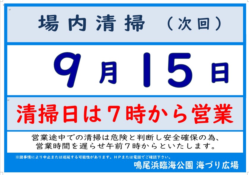 場内清掃日は営業が午前7時からとなります。くれぐれもお間違いがないようにお気を付け下さい。