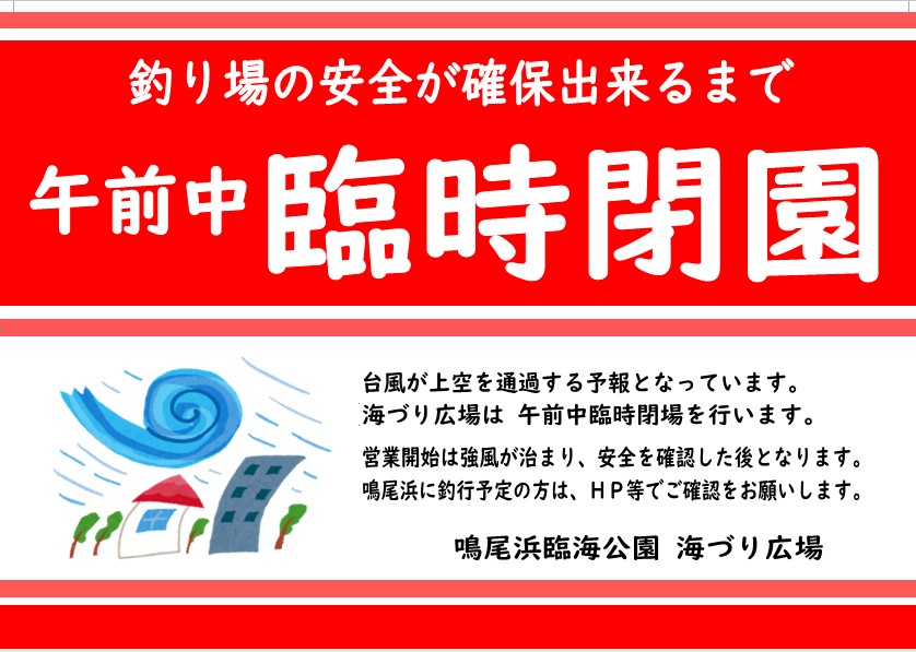 鳴尾浜臨海公園海づり広場は 午前中臨時閉場を行います。