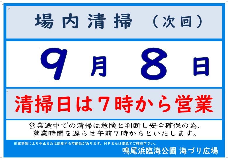 【 明日9月8日(水)は清掃日7時開園 】
