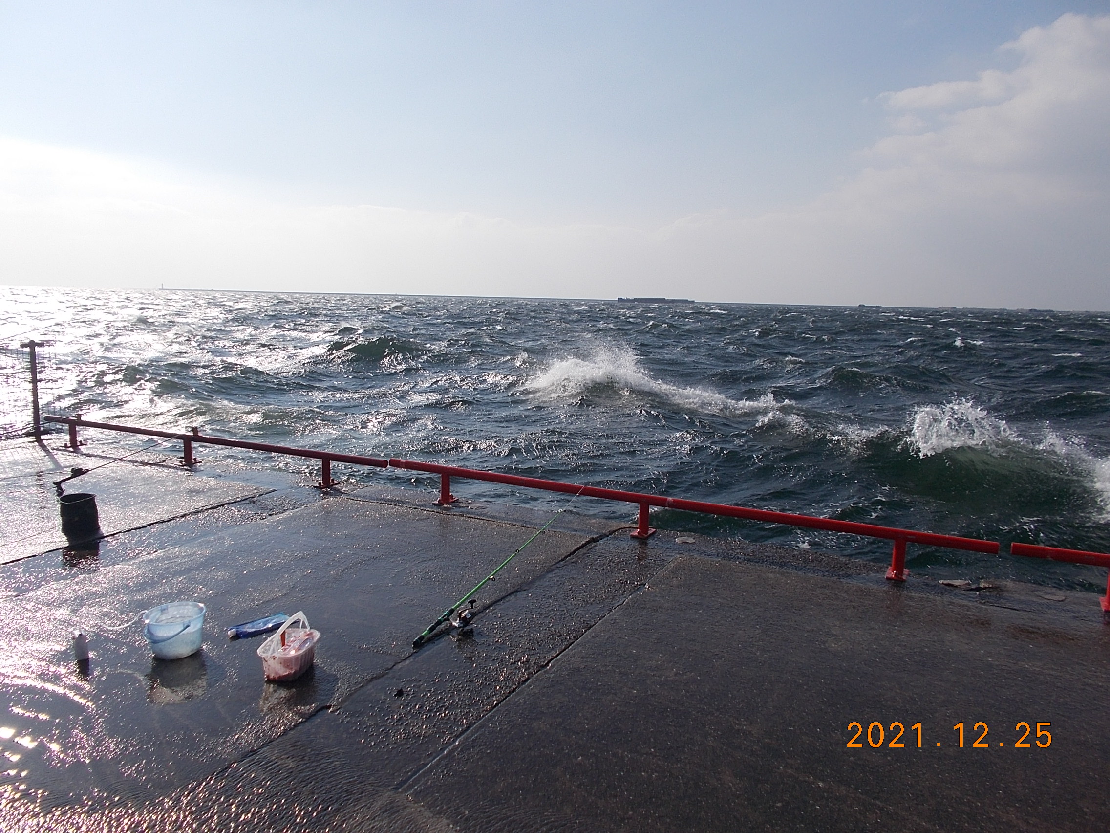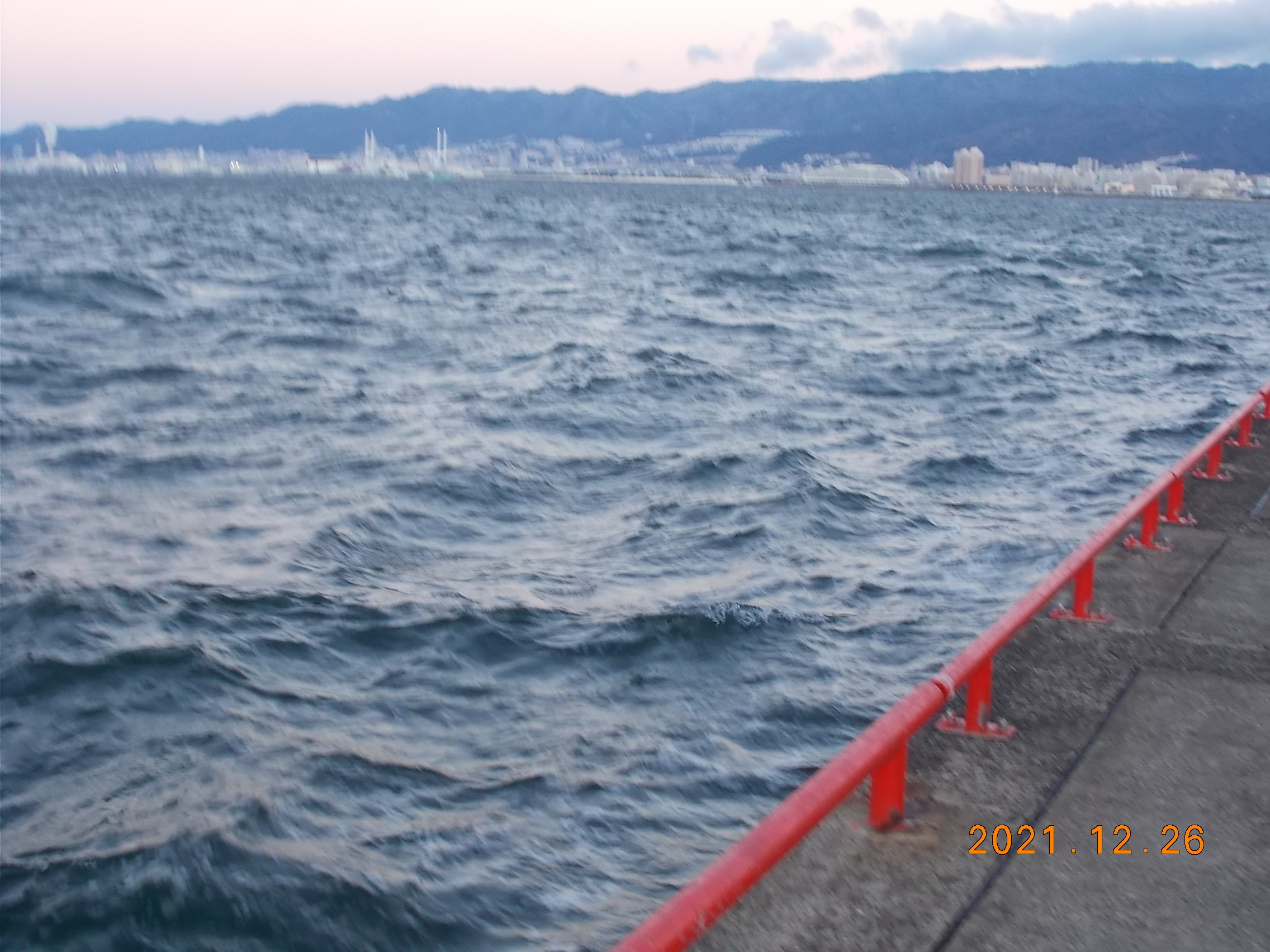 12月27日14時30分 鳴尾浜は15m前後の大変強い風にともない、波が一部釣り台に打ち上がっています。