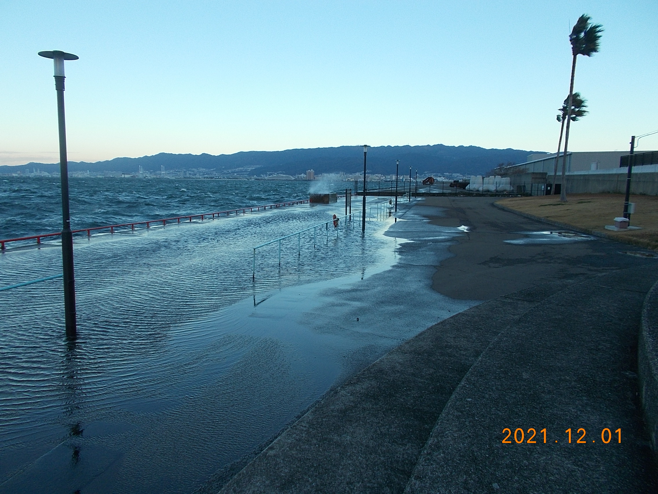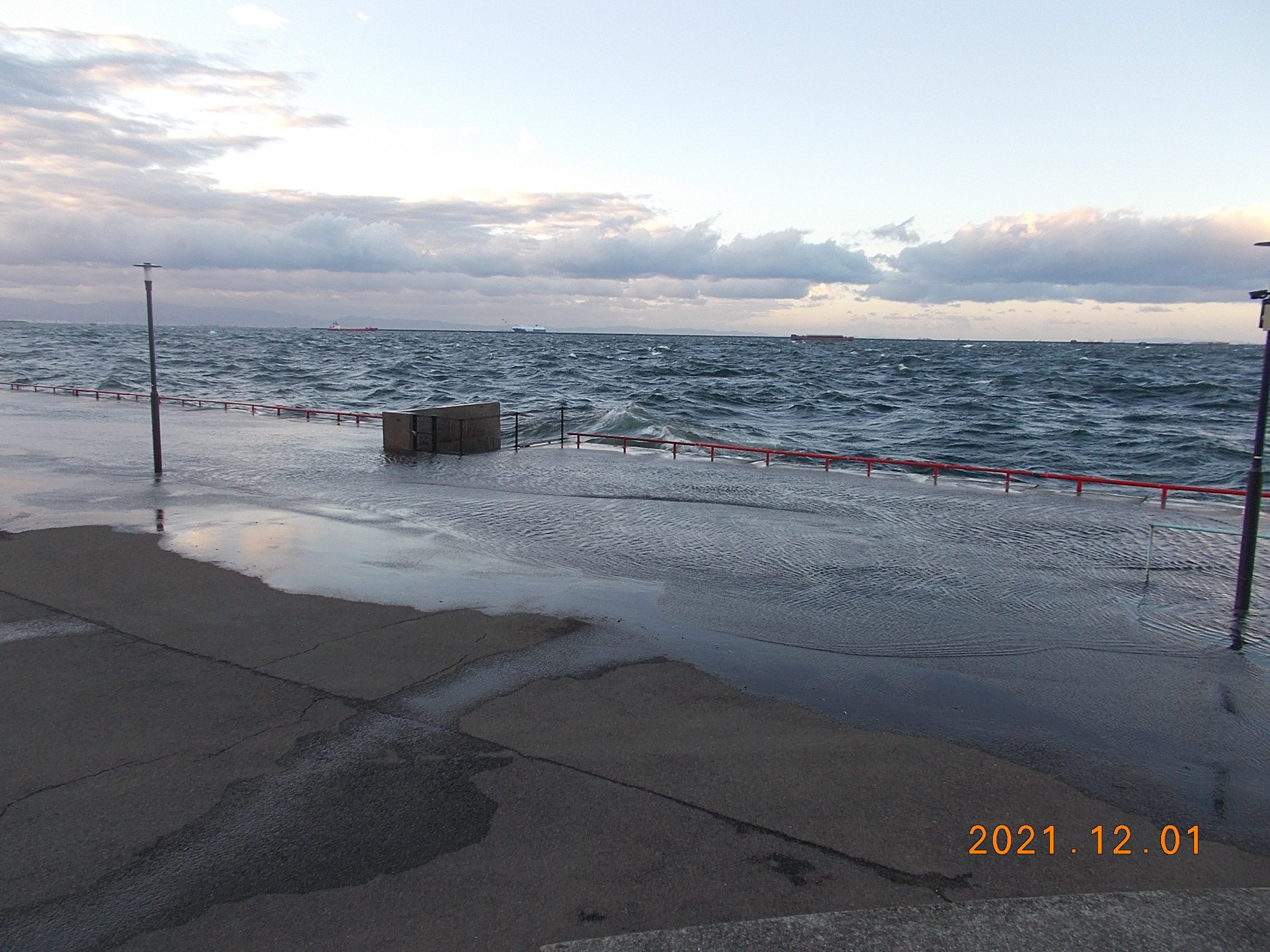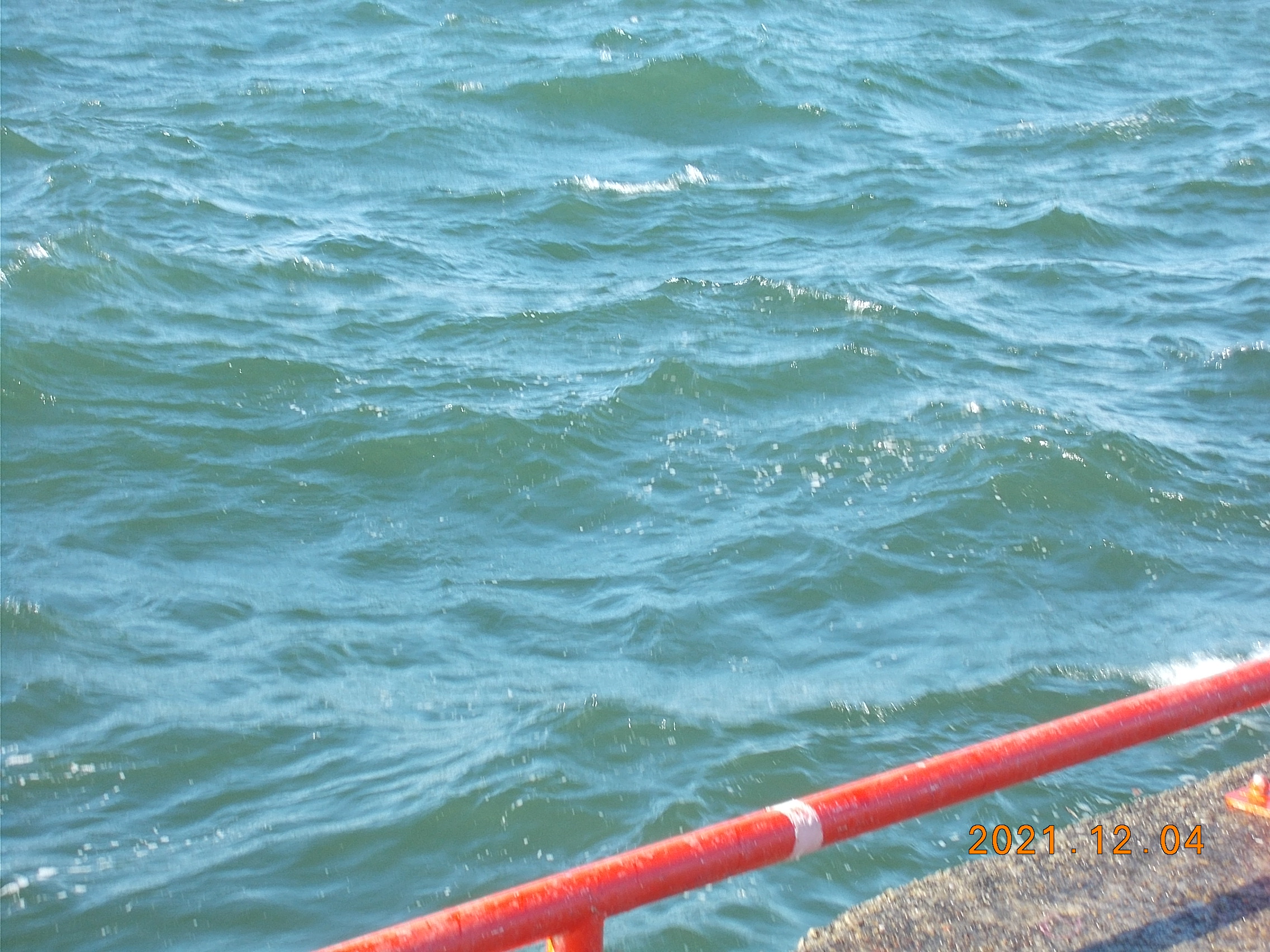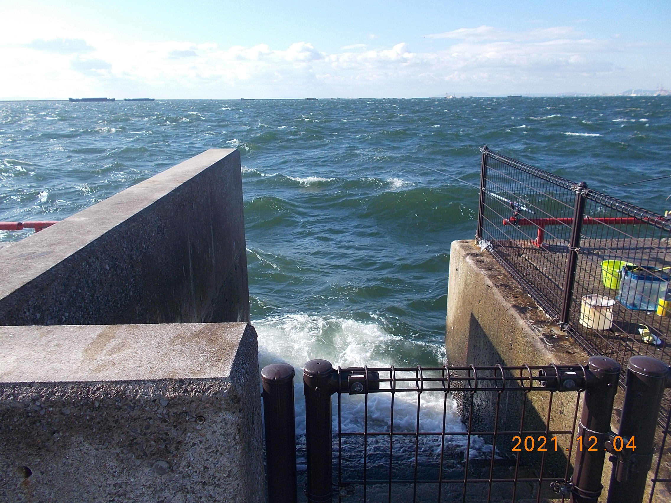 西の風5~6m、白波が立って所どころ波が打ち上っています。今日は大潮で満潮時間が7時ですので、釣行の際は十分気をつけて下さい。