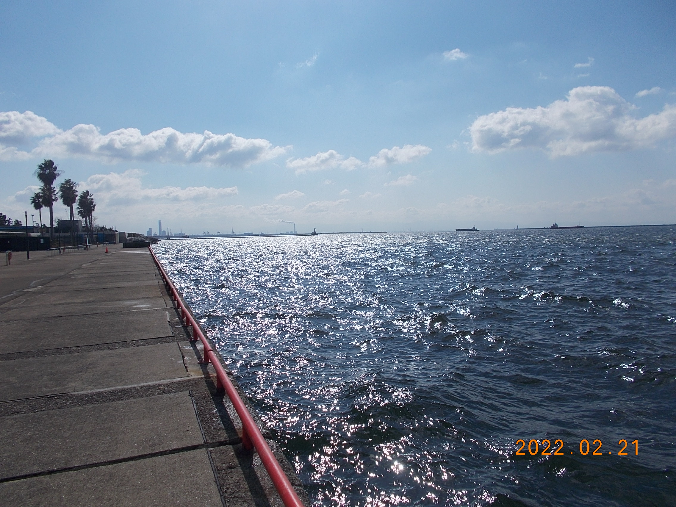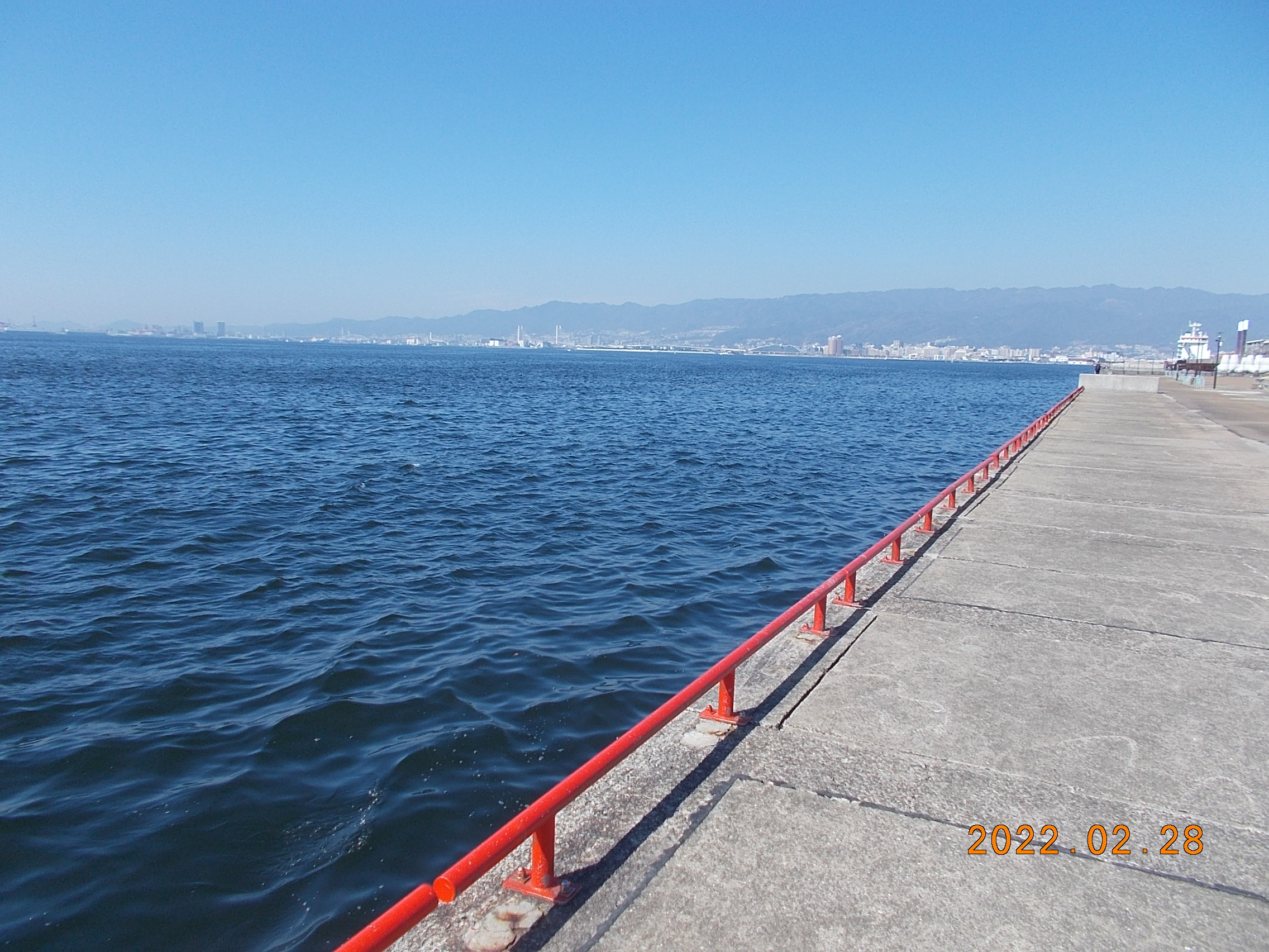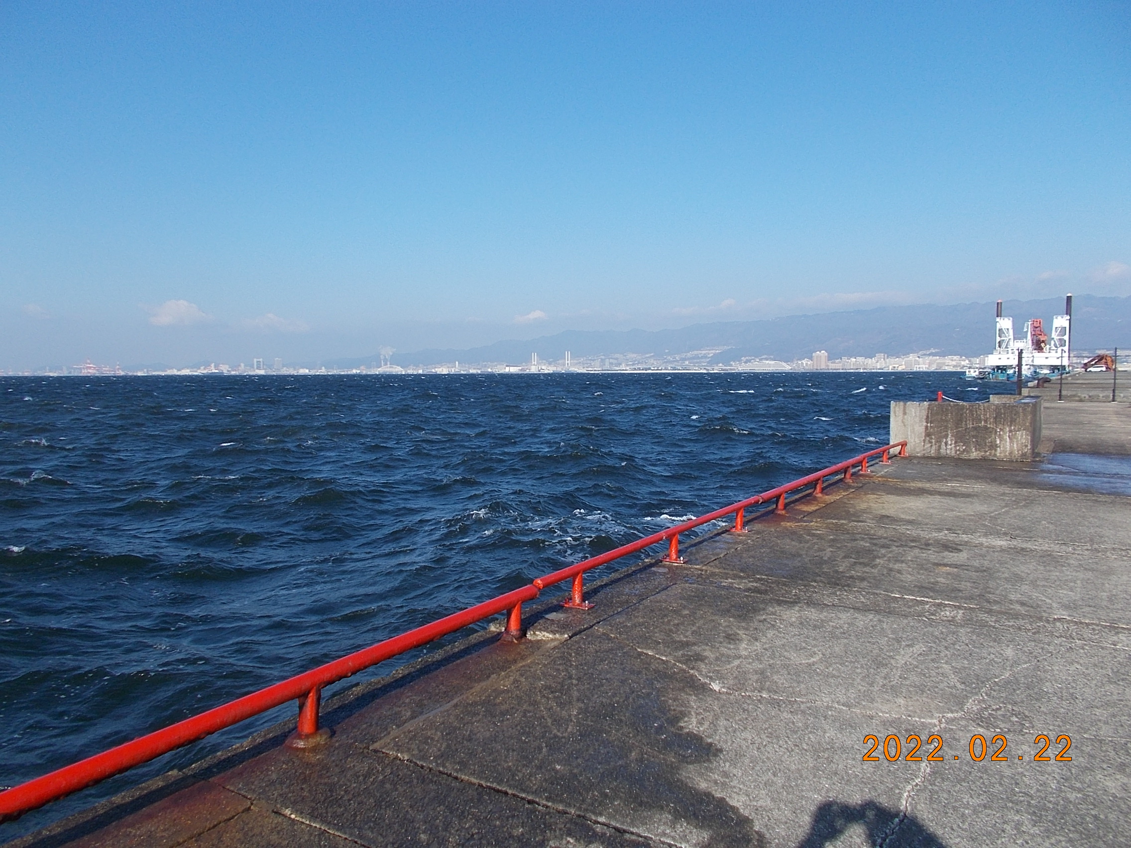 波も風も穏やかな鳴尾浜です。現在、10時を過ぎた所で、西3m/sの風となっています。今数名のお客様が釣りを楽しんでられます。今のところ残念ながら釣果はありません。12時現在、風が強く波が高くなって来ています。西5m/sとなってます。