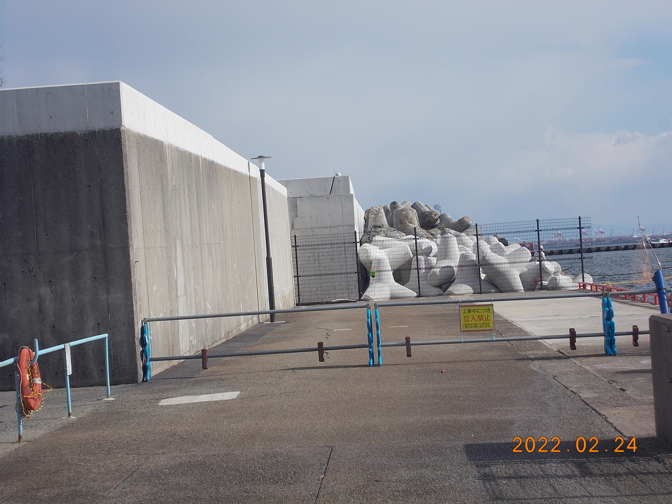 午後3時現在、南東の風0.5m、晴れ、気温7.5℃。写真のように東端向こうのテトラ積み上げ工事がだいぶ進んできました。工事が完了したら立入禁止区域を解除しますがもう少し時間がかかりそうです。