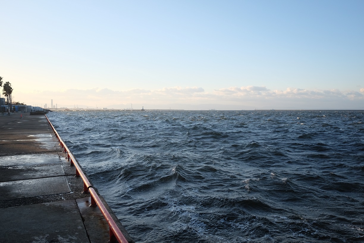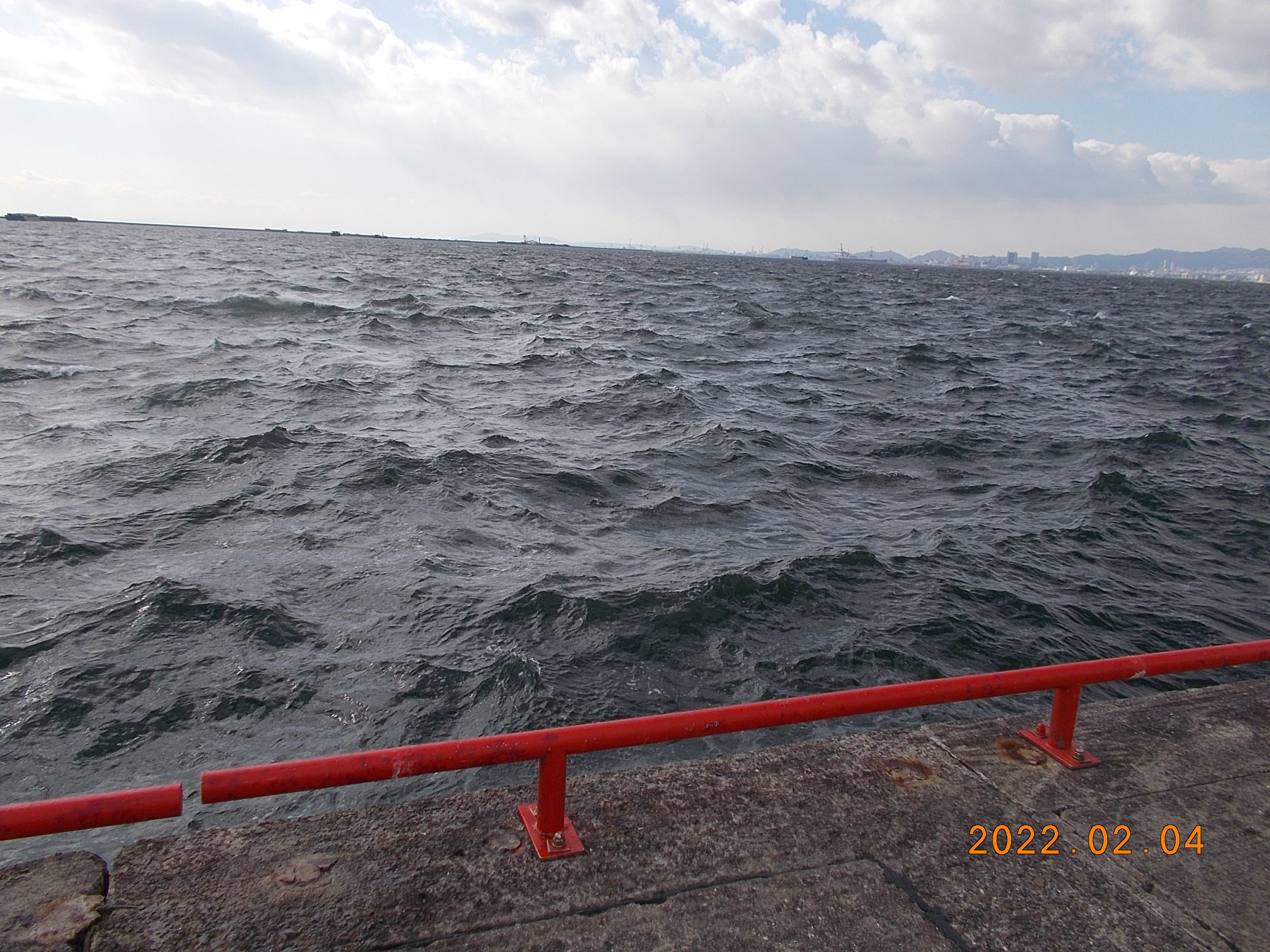 現在も鳴尾浜は7m/s前後の強い風が吹いています。釣り場に潮が打ち上ったり再度風が強まり危険な状態になる可能性もあります。