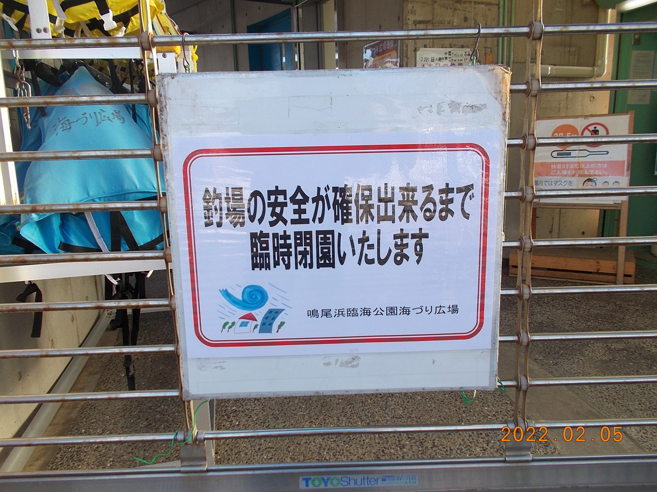 開園時、本日も昨日同様の強風が継続しています。波高く白波が立ち、一部釣り台に打ち上っています。