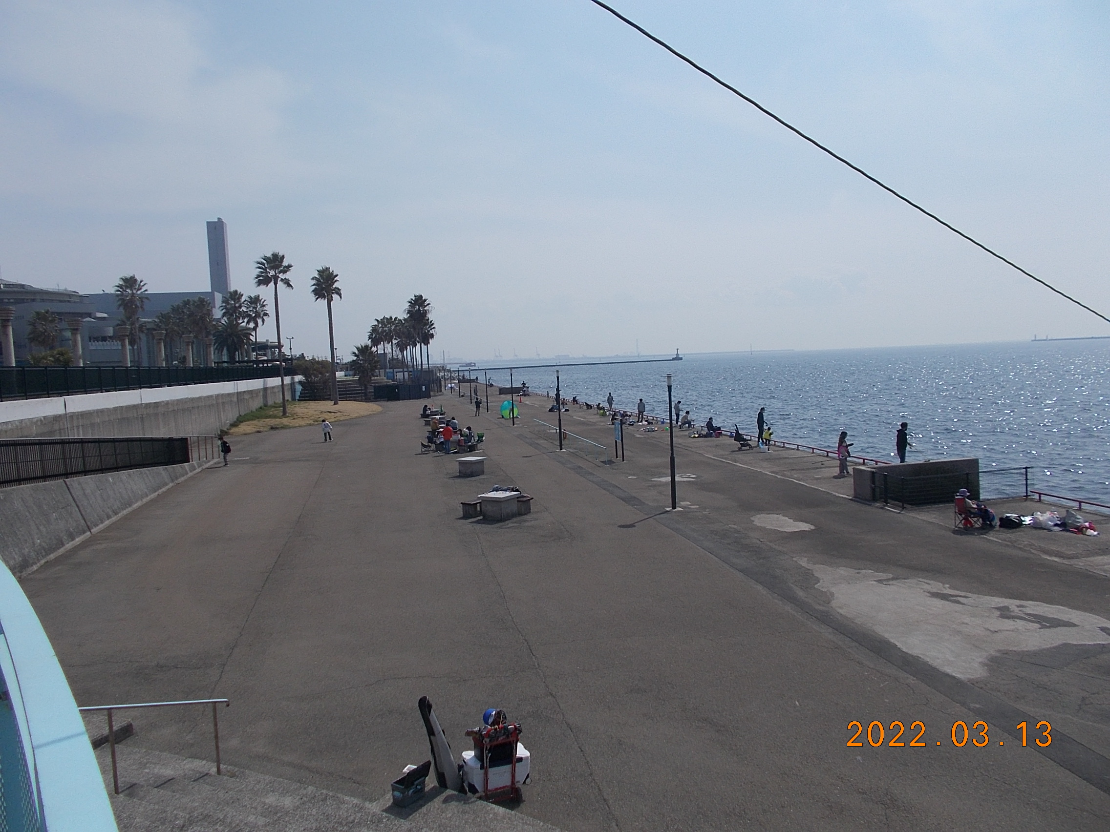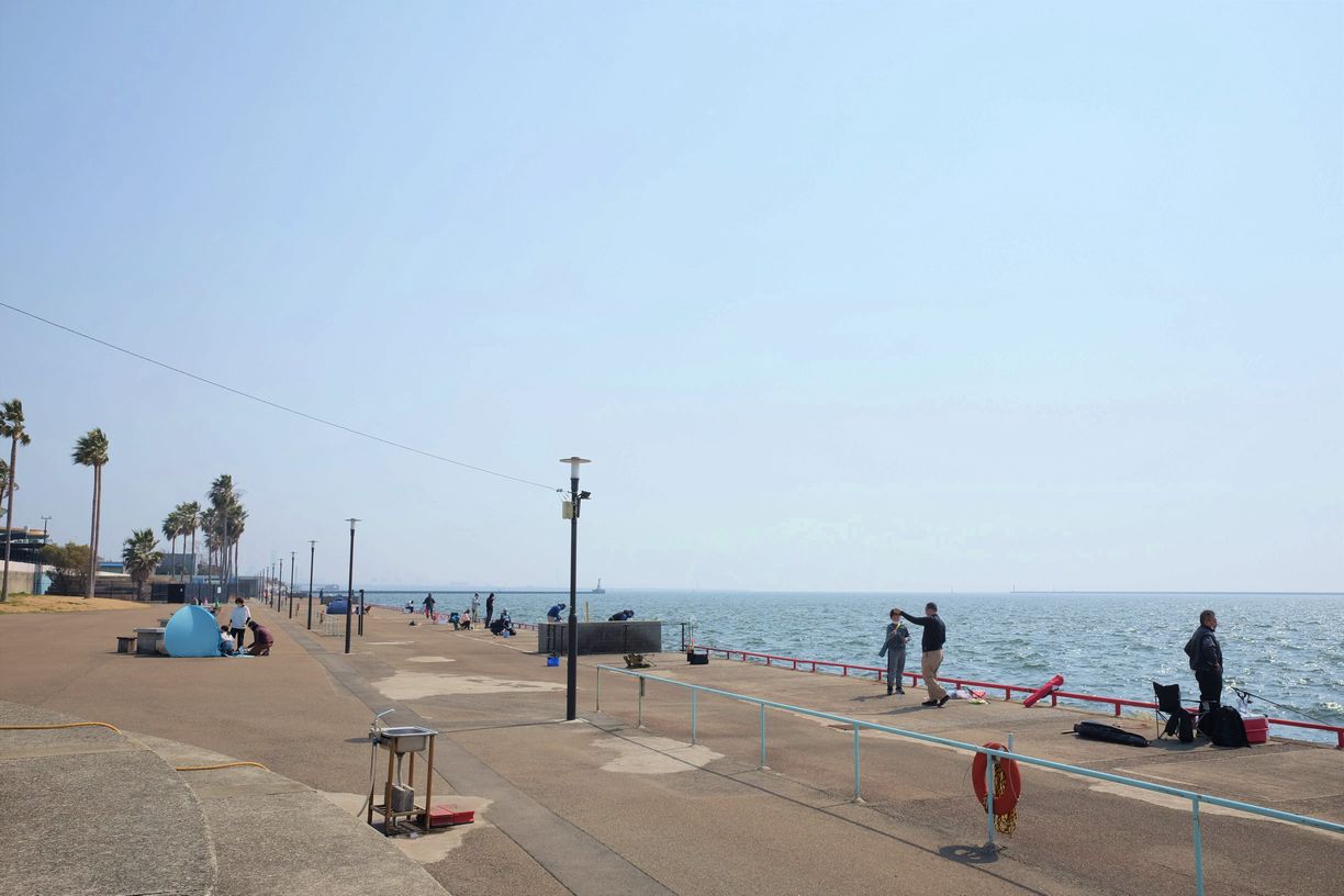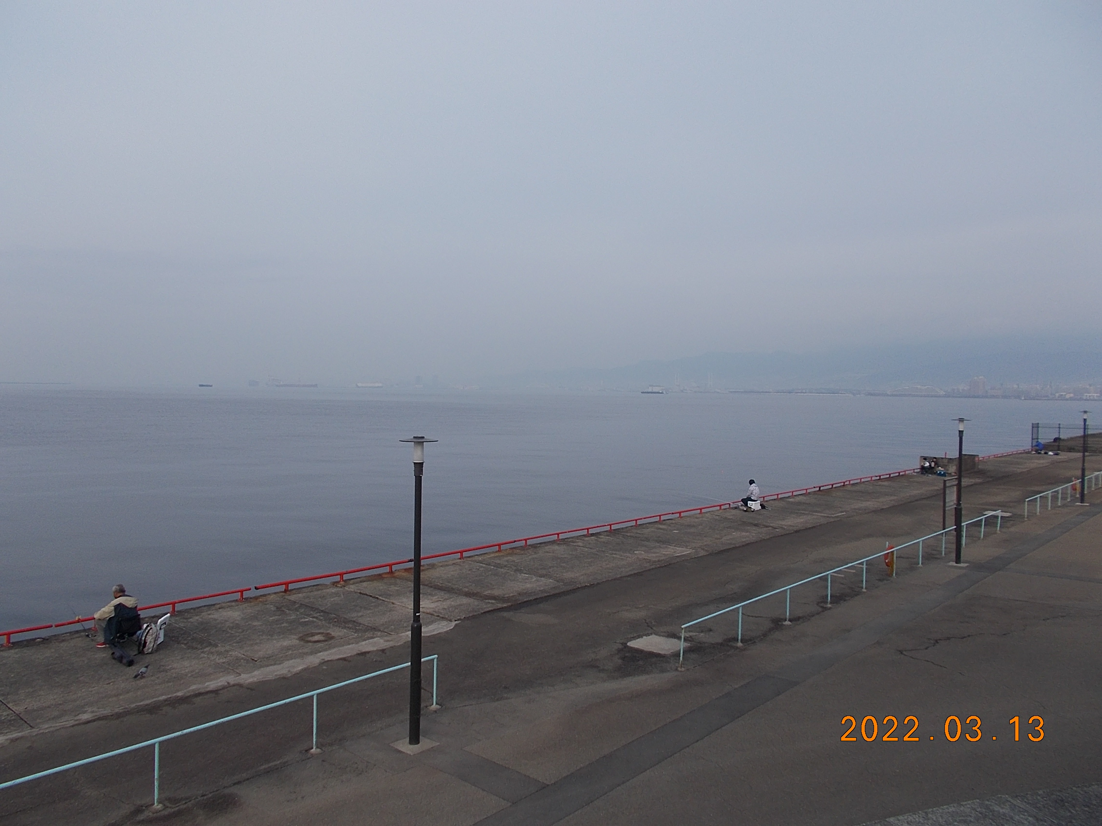 開園時、とても穏やかな鳴尾浜です。風も無く波も大変穏やかです。霞がかかっており神戸の街がみえません。寒くもないためノンビリと釣りをするには持って来いの日です。所々でボラが跳ねていて、少しは魚の気配が感じられる様になって来ました。