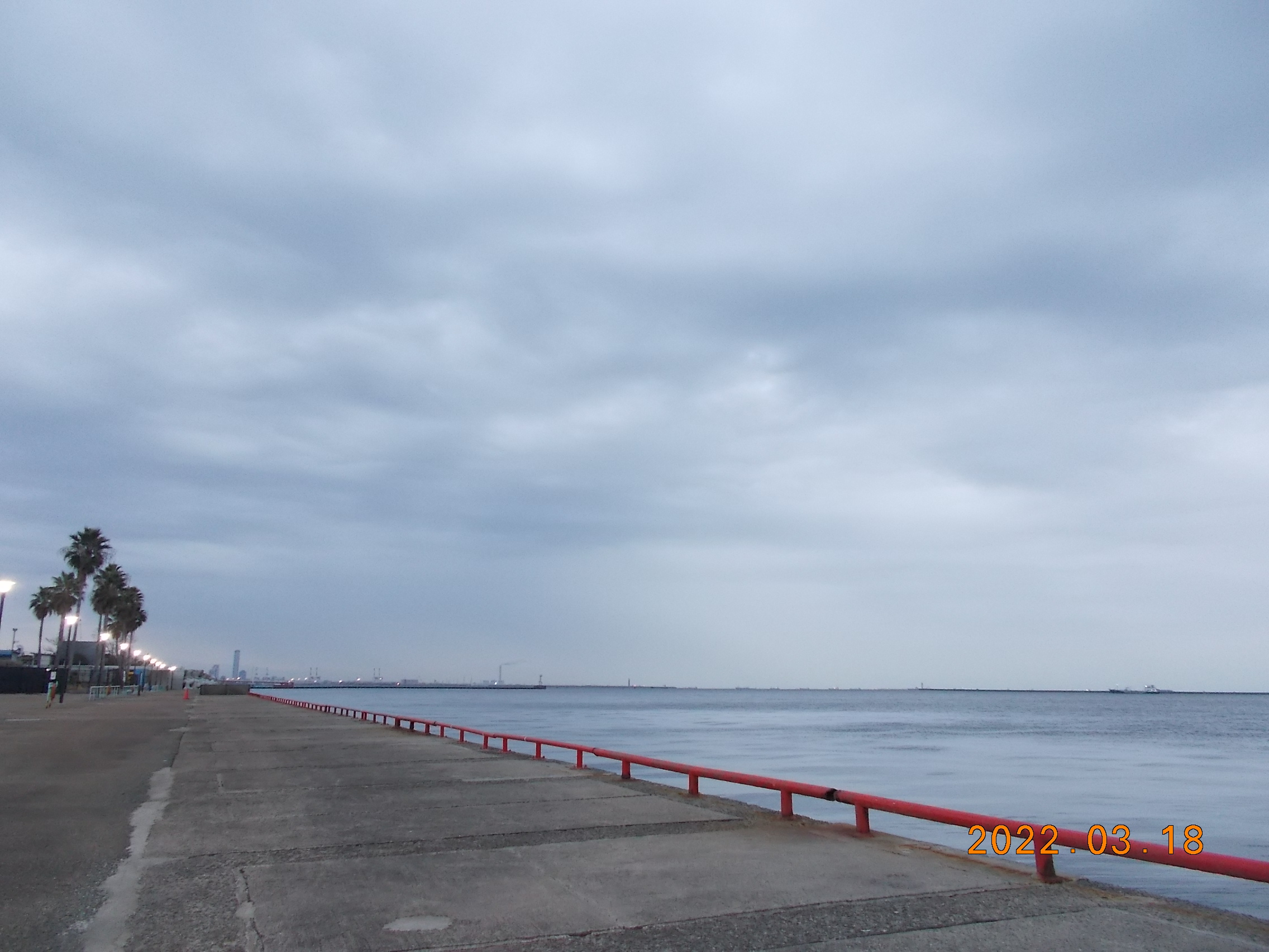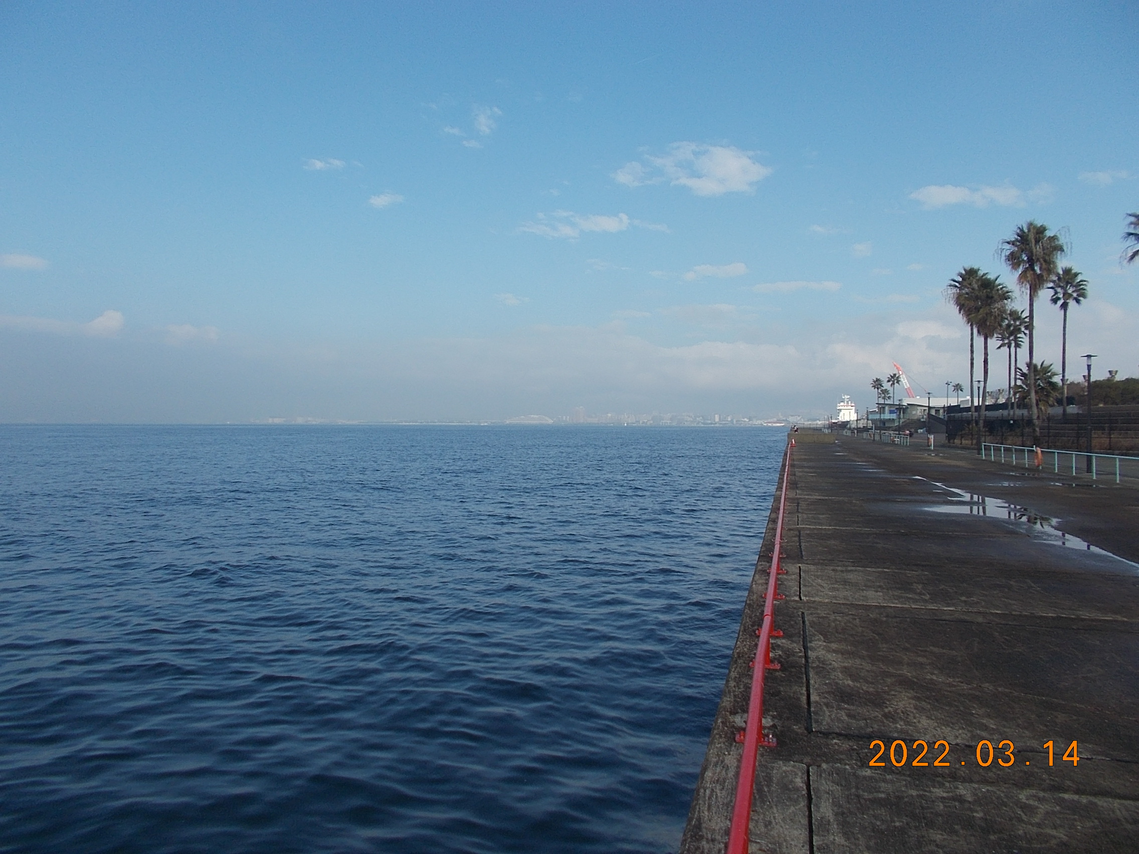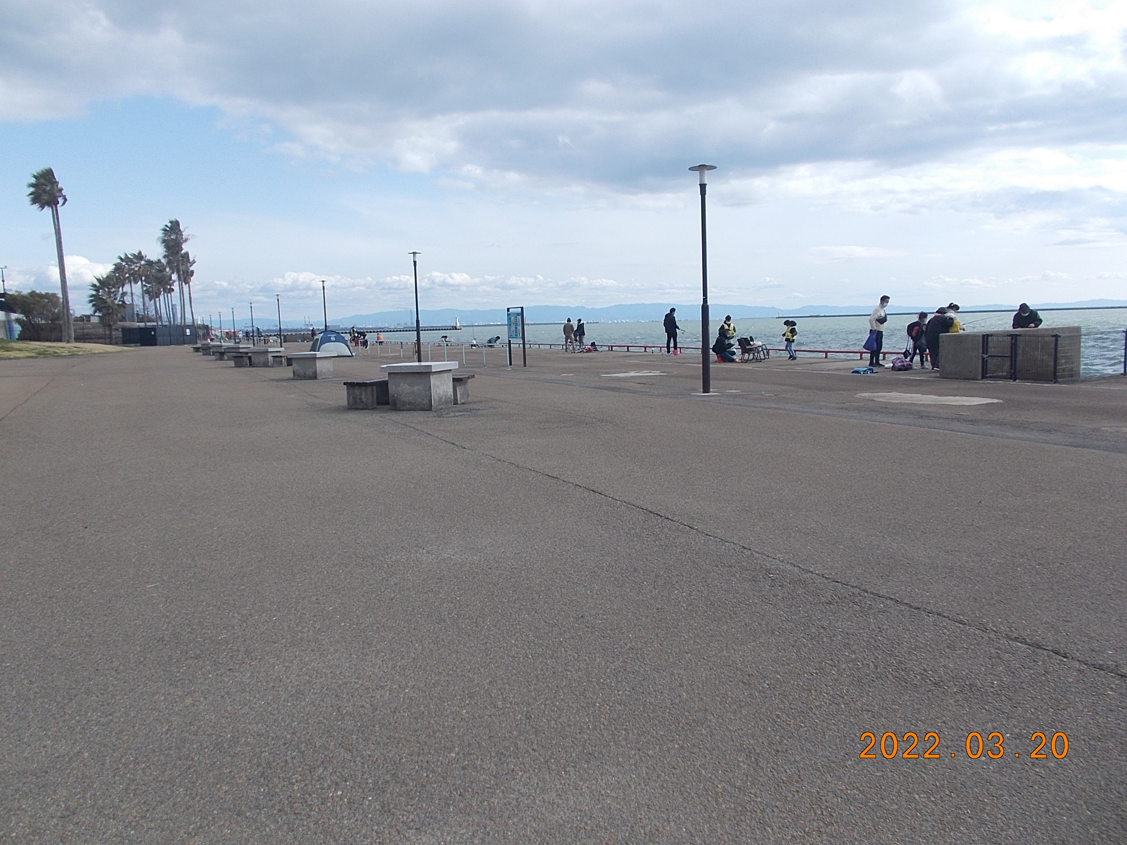 開園時、とても穏やかな鳴尾浜です。風も無く波も大変穏やかです。霞がかかっており神戸の街がみえません。寒くもないためノンビリと釣りをするには持って来いの日です。所々でボラが跳ねていて、少しは魚の気配が感じられる様になって来ました。