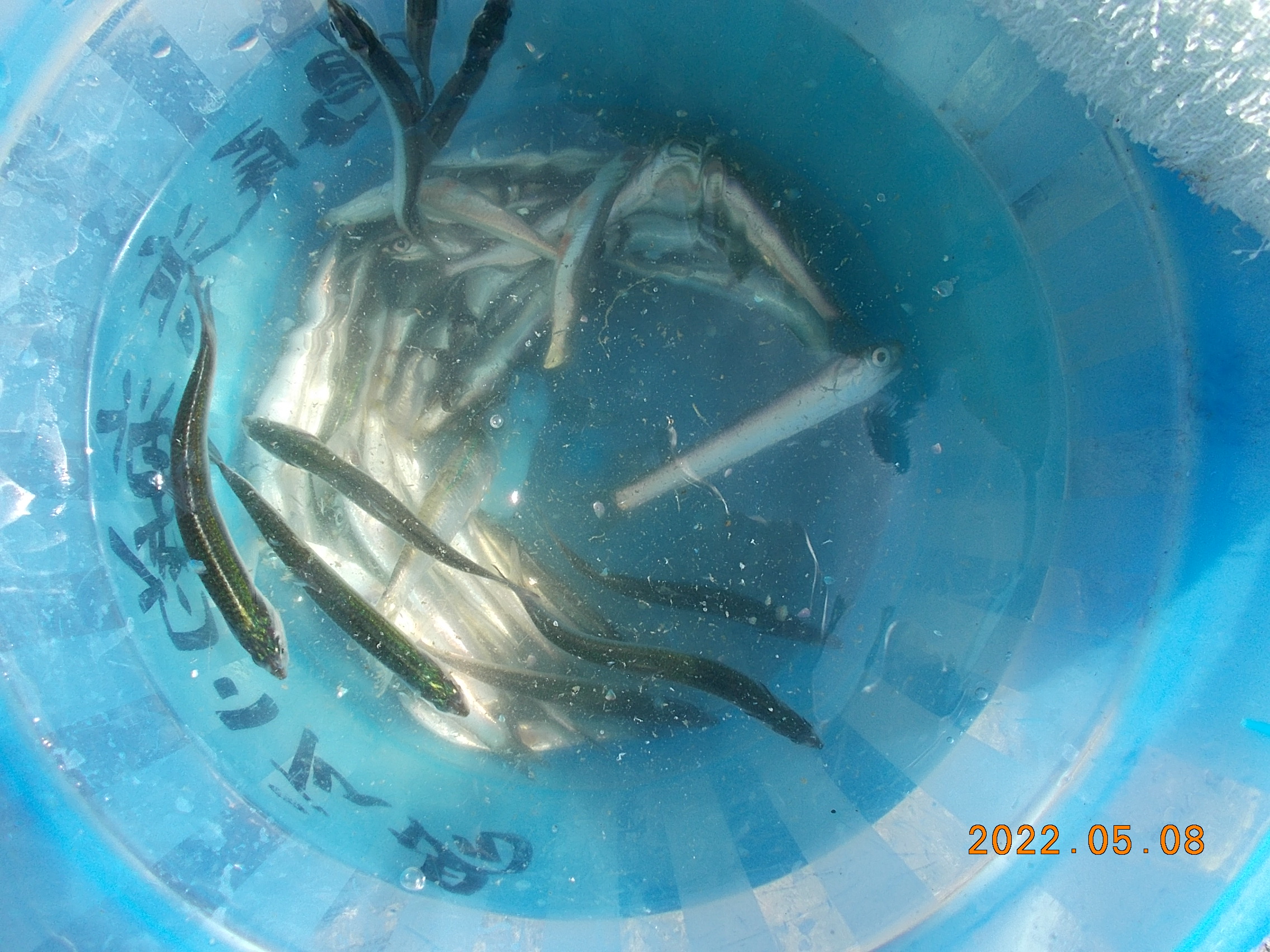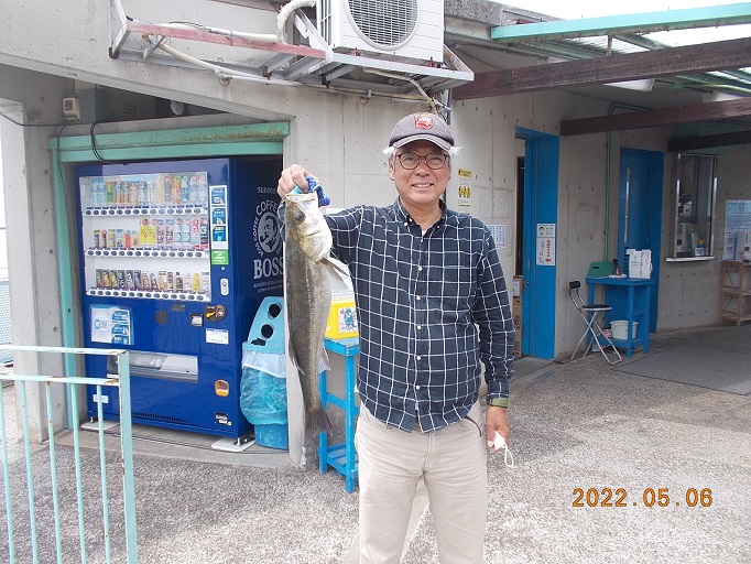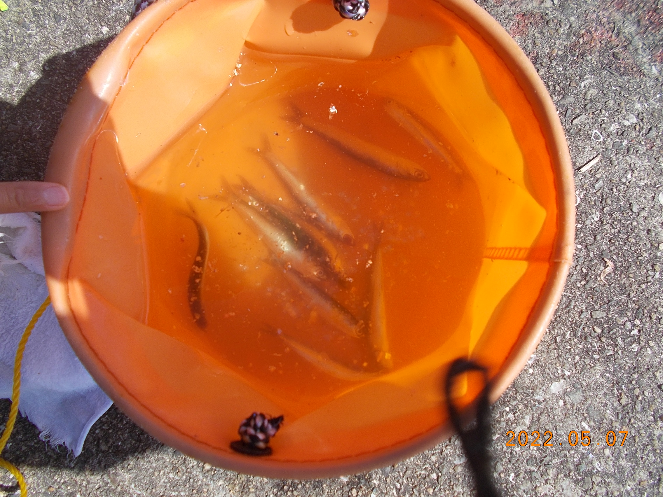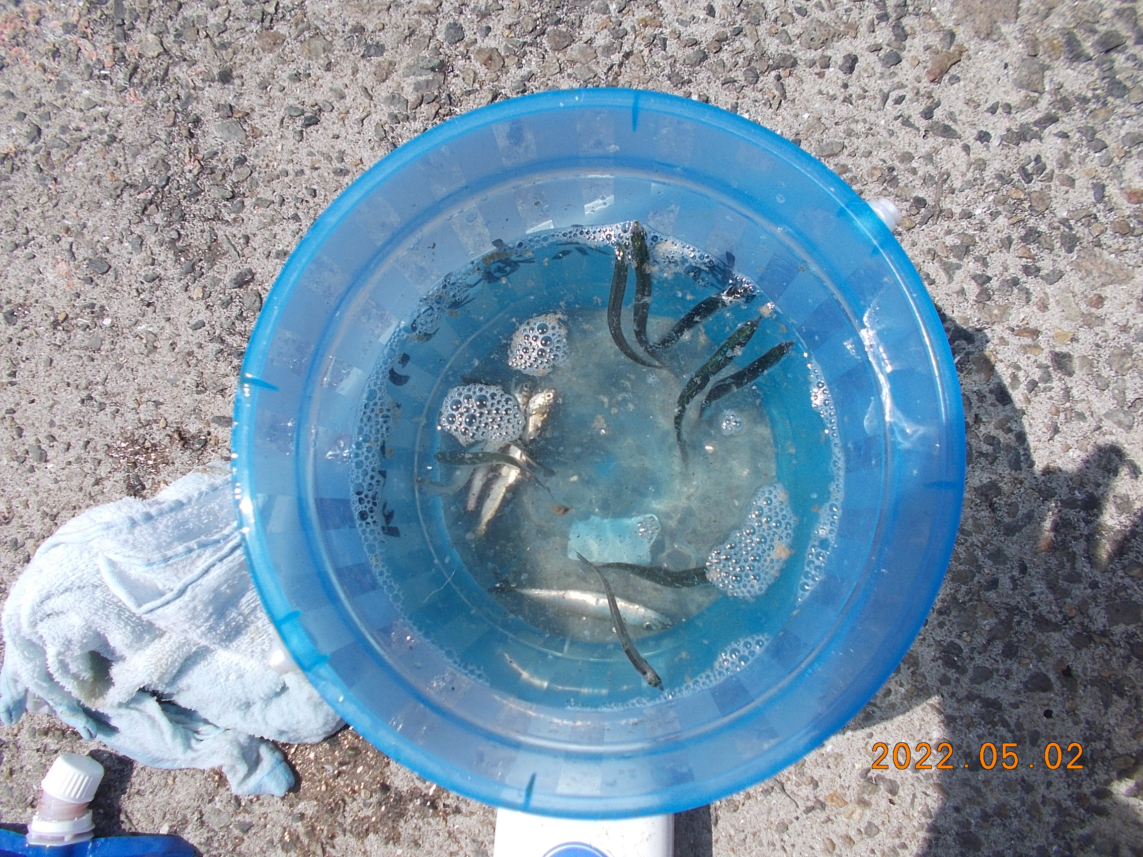 ゴールデンウィークが終わり初日の海づり広場、お客様も数名でサビキ釣り・フカセ釣り・エビ撒き釣りの方がいらっしゃっています。9時過ぎでの巡回で、フカセ釣りの方はアタリも無くただ撒き餌をするだけだそうです。サビキ釣りの方がハゼの18cmを釣り上げ、唯一の釣果となります。12時の巡回では、カタクチイワシが9匹と3匹上げられていました。あと、22cmのハゼも上がっていました。
